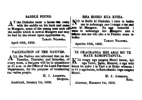SADDLE FOUND. AT the Otahuhu races a bone na away with the saddle on his back and came to Mangere, some of the young men took off the saddle which is now at Mangere and may be had by the owner upon application to, TAMATI NGAPORA. April lOth, 1856. VACCINATION OF THE NATIVES. ALL the Natives are informed that on the Tuesday, Thursday and Saturday, of every week, a Surgeon will be in attendance at 11 a.m. at the Office of the Land Purchase Department, for the purpose of vaccinating the native people. H. J. ANDREWS, Surgeon. Auckland, January 1st, 1856. HEA HOIHO KUA KITEA. NO te Reihi ki Otahuhu i rere te hohie me te nohoanga ano i runga a tae mai ana ki Mangere. Na nga tamariki i wete te nohoanga kei Mangere ano e takoto ana me Uki ake e te Pakeha nona te hoiho. TAMATI NGAPORA. Aperira 10th, 1856, TE OKAOKANGA HEI ARAI MO TE MATE KOROPUTAPUTA. KIA rongo nga tangata Maori katoa, kei nga Turei, Taite, Hatarei, o nga wiki katoa ka noho i te Tari o te Hoko whenua i te 11 o nga haora, te Rata okaoka i nga tangta Maori. H. J. ANDREWS, Rata. Akarana, Hanuere 1st, 1856.