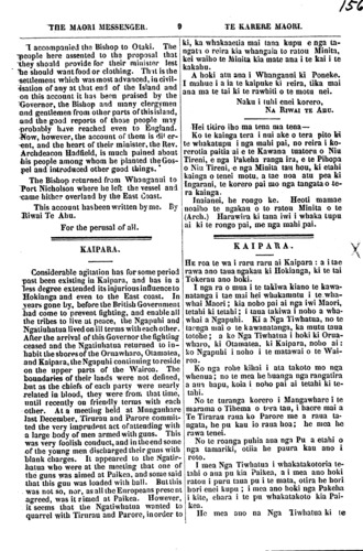THE MAORI MESSENGER. TE KARERE MAORI communicated by the Native Deacon, the Rev. Riwai Te Aha, who accompanied him, will, we doubt not, be read with interest by many of our Maori friends. TO THE EDITOR OF THE " MAORI MESSENGER." SIR, Will it be good to you to insert this letter of mine in the" Maori Messenger." Should you disapprove cast it aside. RIWAI TE AHU St. Stephens School, Tamama, Auckland, April 11th, 1856. On our arrival in Auckland In January last after visiting the Southern Island, Stewarts Island, the Chatham Islands and Port Nich- olson, at there request of some of my European friends I write an account of our tour for in- sertion in the "Maori Messenger." The Bishop and party left Auckland in his schoo- ner "Southern Cross," on the 26th of Sep- tember 1855 to visit the settlements in Stew- art's Island. We reached Nelson on the 1st October having been five days at sea, we had fair winds and sailed five knots an hour. At Nelson we found the Ngatiawa, Ngati- tama, Ngatirarua, Ngatikoata, and Ngatikuia tribes, with their principal chiefs. They were awaiting the arrival of His Excellency the Governor and Mr. McLean to complete cer- tain purchases of land in that district. The Ngatitama wished to sell Poutama, a little to the south of Mokau, some of the chiefs with Henare Te Keha and Matenga Te Aupouri were much distressed to hear of theTaranaki feud and the uncalled for interference of other tribes, who thus aggravated the quarrel in- stead of promoting the interests of humanity by putting an end to it. Ou the Sabbath, these tribes assembled for worship in the Church of the Rev,— But the clergy man at Nelson. The words of Christ were read condemning those who suffer their thoughts to be engrossed by temporal con- cerns only and give no heed to secure the wealth which will satisfy the soul and fit man for heaven, and who slight the love of God to us. Shortly after this, we sailed for Massacre Bay, and the Bishop landed to see the native people residing at Motupipi. They are but few in number and are much scattered; they have also been greatly reduced by deaths from sickness. Here we were presented with several baskets of potatoes by Aperahama Mati Mali and Eruera Te Keha, as a token of kona tangata Maori i haere tahi i a ia. E mea ana matou ka paingia tenei korero e te toko- maha o o matou hoa Maori. Ki te kai tuhi o te " Karere Maori." Ekore ranei koe e pai mai ki te hoatu i taka pukapuka ki roto i te " Karere Maori." Ki te kore koe e pai, maka atu. Naku, NA RIWAI TE AHU. St. Stephens School, Taurarua, Aperira 11, 1856. No to matou taenga mai ki Akarana nei. I te hokinga mai i tera Motu i te tonga i (e Waipounamu. I nga Motu ririki iho erua i Rakiura, i Warekauri. Me Poneke hoki, i nga ra o tenei, Hanuere 1856. Ka tuhia e au nga korero o to matou haerenga. Na etahi o nga hoa Pakeha i whakahau mai, hei tuku atu ki roto i te " Karere Maori." Ka kite au tuhia iho nei. No te 26 o Hepetema, 1855, I rere atu ai matou ko te Pihopa ma i Akarana nei i ru- nga i tona kaipuke i te "Southern Cross", ki te tirotiro haere i nga tangata o nga kai- nga o tera motu o te tonga, i te Waipouna- mu. Erima tonu nga rangi i rere atu ai, ka u ki Whakatu (Nelson) no te tahi o Oketopa i tae ai, na te tika o te hau na te tere hoki o te kaipuke, 11 maero te tere i te haora ko- tahi. Na ko nga hapu Maori i rikohanga atu ki reira, ko Ngatiawa, ko Ngatitama, ko Ngati- rarua, ko Ngatikoata, ko Ngatikuia, me ona tangata nunui. E tatari mai ana ki a te Ka- wana hou, raua ko Makarini, mo nga whe- nua o reira ki a whakaotia te hoko. Ta Ngatitama, hei hoko kia Makarini, ko te Poutama i runga iti atu o Mokau. Ka tumatatenga mai etahi o nga kaumatua, a Henare Te Keha raua ko te Matenga Te Au- pouri, ki te pakanga i Taranaki, ki te rere kau o etehi hapu ki te whakanui i taua paka- nga; kaore i tahuri ki te atawhai i te tanga- ta, ki te whakakore i taua pakanga. Na, i te Ratapu, ka huia e maua ko te Pi- hopa aua rangapu ki te whare Karakia o te Pata Minita o Whakatu. Korerotia nuitia atu ana nga kupu, whakahe a te Karaiti mo nga tangata e whakapau katoa ana i nga whakaaro ki runga i nga taonga mo te tina- na anake, ka whakakore te whakaaro ki te taonga nui e ora ai te wairua, me te tinana ki te rangi, me te aroha hoki o te Atua ki a tatou. Muri ka rere atu ki te Taitapu ka hoe atu a te Pihopa ki utu ki a kite i nga tangata Maori i Motupipi, kaore i tokomaha nga ta-