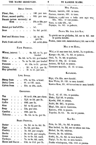 THE MAORI MESSENGER. TE KARERE the number attracted thither we perceive the name of Tamati Waka. The ship Kenilworth is taking on board a cargo of colonial produce for London kauri gum, copper ore, wool, hides, horns, flax etc. It is expected that she will be ready to sail by the end of the present month, and that her place will then be taken by another vessel for the same port. When our native friends become as large producers of wool as they already are of wheat, potatoes, and the likely, instead of an occasional ship depart- ing with New Zealand produce, we shall witness a succession of noble vessels com- peting to be the carriers of those industrious products which are yet destined to render this country one of the most rich and pros- perous of the South Pacific. The change from stormy to pleasant weather has had the effect of bringing to port a goodly array of coasting craft. The supplies have been abundant and seasonable. By 43 vessels of 1150 tons, with 96 passen- gers, we have received 6055 bushels wheat, 2275 bushels maize, 440 bushels oats, 114 tons potatoes, 77 cwt. hams and bacon, 166 cwt. salt pork. 10 cwt. pumpkins, 8 cwt. lard, 5798 Ibs. butter, 736 sheep, 87 pigs, 9 head cattle. 2 horses, 50 fowls, 23 tuns oil, 12 casks polar oil, 18 tons copper ore, 8 tons kauri gum, 23 cwt. towai bark, 4 cwt. leather, 1 whale boat, 500 fire bricks, 450 feet house blocks, 18 piles, 1 cwt. turnips, 600 rails, 34, 100 feet sawn timber, 59, 000 shingles, and 291 tons firewood. The departures, coastwise, have been 55 vessels of 809 tons, with 59 passengers, and the usual cargoes of goods and supplies. Since the above was in type, the brig Moa has arrived from Sydney, with a general cargo of merchandise and 10 passengers. She brings intelligence to the 31st July. Flour had experienced a further advance of 21. per ton, the prices being 251 for fine, 231. for second quality. Wheat 9s. per bushel. The prospects next season for New Zealand produce continue to be encouraging. The floods have prevented the ploughing of the low alluvial lands, and no extension has been made in the agricuitural industry of the Country notwithstanding the large and in- creasing' influx of population. The following are the Market Prices current corrected to date:— ho hipi, te uta nei i nga kai e konei, e rere ana ki Ranana, nga utanga he kapia, he ko- hata kapa, he huruhuru hipi, he hiako kau, he taringa kau, he muka, he aha, he aha; kia tae pea ki te mutunga o te marama nei, ka tomo, ka rere; hei reira ka uta nui ano tetahi kaipuke mo reira ano hoki. Kia pora te mahi o te Maori ki te whaka- tupu huruhuru hipi, me ia e mahi nei i te witi i te aha, i tee aha, penei, ekore e takitahi- tia te rerenga kaipuke ka hono tonu te ho- kihoki o nga kaipuke nunui o nga kaipuke papai, uta rawa hoki ki nga kai o konei, ma reira ka whai taonga ai tenei motu, ka ranga- tira haere hoki. Ka maha nga kaipuke o te tahataha ka tapoko mai i te paki nei, he nui hokinga kai i utaina mai, 56 kaipuke, 875 tana, 76 tan- gata eke, nga utanga, 4202 puhera witi, 905 puhera kaanga, 500 puhera ooti, 93 tana riwai, 69 hanaraweti poaka whakapaoa, 140 hanaraweti poaka tote, 10 hanar- aweti paukina, 8 hanaraweti hinu poaka, 5 hanaraweti pala, 430 hipi, 80 poaka, 9 kau, 2 hoiho, 50 heihei, 25 tana hinu tohora, 42 kaho hinu tohora, 18 tana kohatu kapa; 8 tana kapia, 25 hanaraweti peha towai, 4 hanaraweti hioko kau, hanga hu, i poti weera, 500 per; ki, 450 whiti pou whare, 18 i pou titi, •1 hanaraweti keha tonapi,-600 wawa taiepa, 54.100 whiti rakau kani, 39, OO0 toetoe whare, 291 tana wahie. Ko nga kaipuke kua rere atu ki te tahatika e toru te kau, 694 tana, 59 tangata eke, mei nga taonga hoki. No muri o te tuhituhinga o enei e mau i runga nei, ka tapoko mai te Moa; Iana rongo tae ana ki te 31 o Hurai, he taonga te utanga, 10 nga tangata eke. Kua neke ano te utu o te paraoa, 21. i te tana; ko to reira utu inaianei, te tuatahi, 231. mo te tana, 231. mo te tuarua, te witi 9 hereni mo te puhera. A houanga nei pea te tino manakohia ai nga kai o Niu Tireni. Ko nga papa one- matua kihai i taea te parau i te waipuke, a kahore hoki i whakanuia te mahinga kai, ahakoa ka tini haere nga pakeha i reira, ka hono tonu hoki te u mai o nga kaipuke tangata e rere mai ana i era atu whenua. Ko nga utu hokohoko enei tae noa ki tenei takiwa,