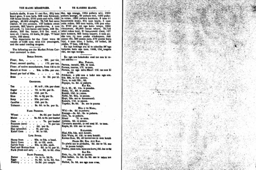 THE MAORI MESSENGER. TE KARERE MAORI. publish a continuation of Rarey's method, it is an excellent one. There is one thing we wish to say: it would be much wore to your advantage to purchase large horses for the cart or plough instead of the rats you are at present so fond of for of what use are they except for the pleasure of those who scam per about the country on horseback. Office of Minister of Native Affairs. Auckland, 17th Dec., 1858. NOTICE is hereby given that His Excel - lency the Governor has been pleased to appoint DAVID STARK DURIE, Esq., The REV. RICHARD TAYLOR, INNIS CAMPBELL, Esq., THOMAS HARPER, Esq., and HENRY SHAFTO HARRISON, Esq., to be Commissioners for Native Reserves un- der the Native Reserves Act, 1856, for the district of Whanganui. C. W. RICHMOND. AGRICULTURAL, COMMERCIAL, AND MARITIME REPORT. FROM THE 1ST TO THE 15TH DECEMBER. By intelligence received from Sydney, to the 24th November, it appears that Wheat and Flour have not only given way in price there, but in alt the other markets of Aus- iralia, and with a great dullness of sale. In Sydney, wheat fetches from 7s to 7s 6d flour 20 for fine, and 181 for second quality . In Auckland, on the contrary, there has been a further advance both in wheat and flour, 8s 6d per bushel being at present readily paid for best samples of wheat, and 221 per ton for first, and 171 for second quality flour. However much we may regret, we are by DO means surprised at this advance; indeed, it is what we have for some time past been anticipating. The millers are complaining of the small supplies that have for a consi- derable time been received from tue coast; their stocks are limited, and the weekly receipts are quite unequal to the weekly consumption. It is this that has forced. the Auckland market beyond any of the markets of Australia; but it is this which will have the effect of speedily reducing it again beyond the level of our neighbours; because, it must be evident that, if our own producers will not or cannot furnish the neccessary supplies, Heoi nei te tikanga pai hei whakararata i te hoiho, ko te atawhai anake. Tena ake ka taia te roanga atu o nga korero o taua Pa- keha ra, he nui te pai. Kotahi ta matou kupu ki a koutou: enga- ri ra te hoko i nga hoiho nunui, hei to kaata, hei to pamu. Kaati te tango i nga kiore e manakohia nei e koutou, he aha hoki tona pai, hei ahuareka kau mo nga tangata e kopikopiko noa nei i runga i te hoiho. Tari o te Minita mo nga mea Maori, Akarana. 17 Tihema, 1858. HE panuitanga tenei kia mohiotia ai kua. pai a Te Kawana ki te whakatu i a TE TURE, i a TE TEIRA. i a TE KEMERA, i a TE HAPA, i a TE HARIHANA, I hei Runanga whakarite mo nga whenua kua rahuitia mo nga Maori, i runga i nga tika- nga o te Ture mo nga Whenua rahui mo nga Maori, 1856, mo te takiwa ki Whanga- nui. C. 221. RICHMOND. KORERO NGAKINGA KAI. HOKOHOKO ME TE MAHI O NGA KAIPUKE. NO TE 15 TAE NOA KI TE 50 O NGA RA O TIHEMA. Ko nga korero hou kua puta mai nei i Poihakena, tae ana ki te 24 o nga ra o No- wema, ko te korero tenei, kua hoki te utu o te paraoa o te witi ki tera makete, a ki nga makete katoa o Atareiria, a, tetahi hoki e ngoikore aua te hokohoko, e tangohia ititia aua « ko nga utu enei mo te witi ki Poihake- na, 7 hereni, tae noa ki te 7 hereni me te hikipene; mo te paraoa, 201. mo te tuatahi, 18l. mo te tuarua. Engari ki Akarana kua heke nga utu mo te witi mo ke paraoa, riro tonu ana te 8 he- reni me te hikipene mo te witi pai inaianei, mo te paraoa 221. mo te tuatahi 171. mo te tuarua. Ahakoa ketekete matou ki tenei nekenga, kahore e roa te kimihanga o te take i pera ai, inahoki, kua mea ano matou i mua, tera ano e penei. E komemememe ana nga kai huri paraoa i te kore o nga witi e puta mai ana i te tahatika i roto i te takiwa kua pa- hure tata ake nei. E iti ana te witi ki a ra- tou; ko nga witi e puta mai ana i roto i te wiki kotahi kaore e rite ki nga paraoa e pau ana i roto i taua wiki kotahi, na konei, kake ana nga makete o Akarana i era i Atareiria;