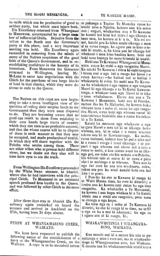 THE MAORI MESSENGER. TE KARERE MAORI. grants, so that the Maori boundaries and Maori difficulties may be done away with. As to the present doings of the Waikatos, such insane projects will be kept far from us: let them starve for want of sweet food if they like. May you live for ever, O our kind parent, and may God keep you. His Excellency was much gratified with the reception given him by the Otaki natives, and their assurances of fidelity to the Queen's Government, also with the marked advance which had been made by them in civilization, as evidenced by the appearance of the settle- ment, which is rather European than Maori in character. A considerable breadth of land has been cleared, fenced, and brought under cultivation or laid down with artificial grass. A school has been long established, and is mainly supported by the proceeds of a well managed farm. A handsome church, orna- mented with highly finished carvings by the Maori tohunga; several buildings for the accommodation of a large number of school children, and a comfortable parsonage, oc- cupied by the Native Clergyman, have all been erected by the Natives themselves, under the guidance of their devoted Mis- sionary, the Venerable Archdeacon Had- field. These, with several cottages belong- ing to Native chiefs, and neatly furnished in European style, show that the Otaki Natives are making real progress in civili- zation, and establish the claim of this set- tlement to be considered the best specimen in New Zealand of a Maori Village. From Otaki the Governor proceeded along the coast to Whanganui, where he found the Natives assembled in large num- bers from various places awaiting his arrival. His Excellency held several public inter- views with these Natives, and again took occasion to correct erroneous impressions which had been received. Several impor- tant matters were discussed, explanations were given, which proved satisfactory to all parties; and most of the principal Chiefs renewal to His Excellency their assurances of loyally to and confidence in the Queen's Government. The feud between Topine Mamaku and a portion of his tribe had not terminated, but a committee was appointed by the Governor to enquire into and report on the matter to him. lt is to be hoped that when this is done, both parties will be prepared to come to some better under- standing and to bury their animosities, and that means may be found of putting an end ture i nga Mihinare te whakamaori mai ki a matou. E Pa, e te matua, e Kawana Paraone. Te- nei taku kupu whakamutunga ki a koe. Kia mahara mai koe ki a matou, ki o tama- riki, kia whakahau atu koe ki nga kai mahi kia ruritia nga wahi e ka nei o matou ahi i runga nga wahi e pai nei matou kia puritia mo matou, mo o matou uri hoki i muri i a matou. Me homai hoki he Karauna Karaati kia whakamutua nga rohe Maori, me nga raruraru Maori hoki. Ko nga tikanga e ma- hia mai na e Waikato, waiho atu a te pora- ngi tikanga, mana e mate atu i te Kore kai reka mana. Kia ora tonu koe, e to matou matua aroha, ma te Atua koe e tiaki. Nui atu te pai o Te Kawana ki tona wha- kamanuhiritanga e nga tangata o Otaki, ki o ratou kupu whakapiri ki te Kawanatanga o Te Kuini, a ki to ratou nekenga haereta- nga hoki i runga i nga tikanga Pakeha, i ki- tea hoki tenei ki te ahua pai o to ratou kai- nga, i ahua Pakeha hoki, kaore i rite ki o te tangata Maori kainga. He nui te whenua kua oti to parapara, te taiepa, te ngaki ki te kai; te ruirui ki te karaehe. Kua tu noa atu he kura mo nga tamariki, ko nga moni utu mo nga kai o tetahi paamu e mahia paitia nei e ratou, waiho ana hei oranga mo taua kura. Ko te whare-karakia hoki tera, whakapaipai rawa na te tohunga ki te whakairo Maori, ko etahi whare hoki mo nga tamariki o te kura, kia tokomaha noa iho ki roto, me te whare mo te Minita Maori, he whare pai; ko enei katoa na nga tangata Maori ano i hanga, ko to ratou Mihinare hoki ko te Harawira te kai tohutohu. Tera ano etahi atu whare, na nga rangatira Maori, he mea tauira ki o te Pakeha nga hanga o roto: ma enei mea e ki- tea ai, e neke haere ana nga Maori o Otaki, a ka tika ano hoki te mea, no ratou anake te kainga i tino pai rawa, puta noa i Niu Ti- rani nei. Ka mahue Otaki, ka haere te Ka- wana i te tahatika tae noa ki Whanganui; rokohanga iho eia kua whakamene nga Maori o ia wahi o ia wahi, e tatari atu ana ki a ia. Tae atu Te Kawana ka whakatu huihui ano, ka kitekite kanohi ratou ko nga tangata Maori o tera wahi, ka mahi ano ia ka wha- katika i nga korero he i korerotia; a nei mo te tikanga o te Kawanatanga ki a ratou. He mea nunui etahi onga mea i korerotia i rei- ra, a ora ana te ngakau o nga Maori ki nga tikanga a Te Kawana, a puta ana ano nga kupu whakahoa, whakawhirinaki hoki a nga rangatira ki to Te Kuini Kawanatanga. Ko