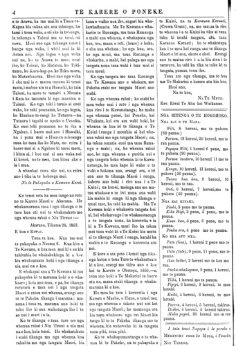 TE KARERE O PONEKE Ko te kai rapu, ko ia te kite. [VOL I, MANE, 10 o MEI 1858, NO. 27] The "KARERE O PONEKE" is pub- lished every Thursday morning. TERMS OF SUBSCRIPTION;- Twenty Shillings per annum, payable half- yearly. TERMS OF ADVERTISING;- Three pence a line for the first insertion of all advertisements, and Two pence a line for every subsequent insertion. Advertisments wil be continued and charged for until counter-ordered: such orders in writing, as also all Ad- vertisements (in English) will be re- ceived at the INDEPENDENT Office, Lambton-quay, on Tuesdays, at any time before 4 o'clock, p.m. PANUITANGA. MEHEMEA ka hiahia te tangata ki te tuhituhi reta kia taia ki roto ki tenei Nupepa mo tuhi mai "KI A TE PURA, KAI TUHI o TE KAREKE o PONEKE." Otira, ma taua tangata ano e utu nga kapa e rua, e toru ranei, mo te mera—kia tika ai te kawenga mai. HE HOIHO NGARO. KO TOKU hoiho kua ngaro. He uwha taua hoiho—he whero te ahua, he ma te ngutu. Kahore ano i piri te parani. Ki te kitea e te tangata ka utua e au kia Rima Pauna. Naku. Na TAMATI ERUINI MUKAKA. Waikanae, 18 o Pepuere 1858. HE KAIPUKE TENEI, KO PAMA, e rere ana ko Wakatu, hei te 10 o nga ra o Mei. Me pa mai te tangata eke, uta tao- nga ranei, ki a PETUNE raua ko HANITA. (Bethune & Hunter.) Whare Hokohoko, 190 Aperira, 1858. MOTE HOKO PUKAPUKA. HE PUKAPUKA enei kei Otaki, ara, he pukapuka Karaipiture, ko te tehi wahi o te Kawenata Ta- whito; ki te hiahia te tangata ki te hoko, me haere atu ki a Henare Wi- remu Taratoa hei Otaki. Ko te utu, e rua hereni mo te pukapuka kotahi. Ko nga Upoko enei i roto i taua pukapuka. Ko nga kai Whakariterite, Ko Ruta, Hamuera 1, Hamuera 2, Kingi 1, Kingi 2, Ko nga Whakapapa o Iharaira, Ko nga Whakapapa ano. H. W. TARATOA. HE KIWI! HE KIWI! EHOA MA, e nga kaiwhakangau Kiwi, tahuri mai. Ko au tenei hiahia ana ki etahi Kiwi kia hopukia mai e koutou—hei te mea ora. Kei te pai o te manu te ritenga mo nga utu: otira, ko te utu ano tenei pai ai au:— Mo te mea rahi ......... £200 Mo te mea iti ............ 100 Ma te pai o te manu ka whakanuia ai nga utu, ma te kino ka whakaititia ai. A, e pai ano kia maha nga kiwi —kia rua te kau noa atu—e hokoa katoatia e au. NA TE PURA. Poneke, 4 o Pepuere, 1858. HE KOURA! KO nga pakeha o raro iho nei, he kai hoko Koura, ki te moni. E nui ana nga utu e homai ana e ratou. Ko te POURA ma, (Wm. Bowler, Son & Co.) Ko enei hoki,— Ko TUATI ratou ko KINIROHI ma, (Stuart Kinross & Co.) Poneke, 17 o Hepetema, 1857. PANUITANGA. He Hoiho kei te haere i Rangi- tikei nei. E wha nga tau o taua hoiho; ko te ahua he whero. Ehaere tahi ana me tana kuao. Me haere mai tetahi tangata nona tetahi hoiho kua ngaro, ki te titiro: ki te tika nona ka whakaae au kia riro atu i a ia te hoiho nei me tana kuao. Ko nga utu mo te hopuranga, mo te ahatanga ranei, mana ano e whakarite. NA RAUPARAHA TE RINGA Rangitikei, 15 o Pepuere, 1858