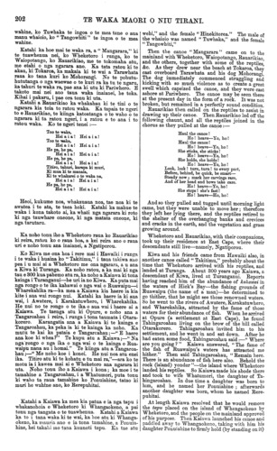 202 TE WAKA MAORI O NIU TIRANI. wahine, ko Tuwhaka te ingoa o te mea tane o aua manu whaioio, ko " Tangowhiti" te ingoa o te mea wahine. Katahi ka hoe mai te waka ra, a " Mangarara," ki te tuawhenua nei, ko Wheketere i runga, ko te Waiopotango, ko Rauarikiao, me te tokomaha atu, me etahi o nga ngarara ano. Ka tata ratou ki te akau, ki Tokaroa, ka makaia ki te wai a Tarawhata raua ko tana kuri ko Mohorangi. No te pohutu- hututanga o nga waewae o te kuri ra ka tu te ngaru, ka tahuri te waka ra, pae ana ki utu ki Pariwhero. E takoto mai nei ano taua waka inaianei, he toka. Kihai i pakaru, i pae ora tonu ki uta. Katahi a Rauarikiao ka whakahau ki te tini o te ngarara kia toia to ratou waka. Ka tapaia te ngeri to e Rauarikiao, te kiinga katoatanga o te waho o te ngarara ki ta ratou ngeri, i a ratou e to ana i to ratou waka. Ko te ngeri tenei :— Too te waka, Hei a i a! Hei a i a! Too te waka, Hei a i a! Hei a i a! He pa, he pa, Hei a i a! Hei a i a! He pa, he pa, Hei a i a! Hei a i a! Titiro, tahuri, karapa ki muri, Ki mua ki te manaia, Ki te whakarei o te waka na, Hei a i a! Hei a i a! He pa, he pa, Hei a i a! Hei a i a! Heoi, kukume noa, whakauaua noa, tae noa ki te awatea i te ata, te taea hoki. Katahi ka mahue te waka i kona takoto ai, ka whati nga ngarara ki roto ki nga tauwhare oneone, ki nga matata oneone, ki nga tarutaru. Ka noho tonu iho a Wheketoro raua ko Rauarikiao ki reira, ratou ko o raua hoa, a kei reira ano o raua uri e noho tonu ana inaianei, a Ngatiporou. Ko Kiwa me ona hoa i rere mai i Hawaiki i runga i te waka i huaina ko " Takitimu," i taua takiwa ano pea i u mai ai a Wheketoro me ona ngarara, a u ana a Kiwa ki Turanga. Ka noho ratou, a ka mai ki nga tau e 300 kua pahemo atu ra, ka noho a Kaiawa ki tona kainga i Turanganui—he uri ia no Kiwa. Ka puta mai nga rongo o te ika kahawai o nga wai o Ruawaipu—i Wharekahika ra—ka mea a Kaiawa kia haere ia kia kite i aua wai rongo nui. Katahi ka haere ia ki aua wai, i Awatere, i Karakatuwhero, i Wharekahika. He nui no te rongo o te ika o aua wai i haere ai a Kaiawa. Te taenga atu ki Opure, e noho ana a Tangaroahau i reira, i runga i tona taumata i Otara- korero. Karangatia ana a Kaiawa ki te kainga e Tangaroahau, ka peka ia ki te kainga ka noho. Ka mutu te kai ka pataia e Tangareahau;—"E haere ana koe ki whea?" Te kupu atu a Kaiawa;—" Na nga rongo o nga ika o nga wai o te kainga o Rua- waipu nana au i homai." Te kiinga atu a Tangaroa- hau ;—"Me noho koe i konei. He nui noa atu enei ika. Titiro atu ki te kohatu e tu mai ra,"—ara ko te motu ia i kawea mai ai e Wheketoro ana ngarara ki uta. Noho tonu iho a Kaiawa i kona; ka moe i te tamahine a Tangaroahau, i a Whatumori, puta tonu ki waho ta raua tamahine ko Ponuiahine, tatao ki muri he wahine ano, ko Rerepuhitai. Katahi a Kaiawa ka mea kia patua e ia nga tapu i whakanohoia e Wheketoro ki Whangaokeno, a pai tonu nga tangata o te tuawhenua. Katahi a Kaiawa ka to i tana waka ki te wai, ka hoe atu ki Whanga- okeno, ka mauria ano e ia tona tamahine, a Ponuia- hine, hei takahi mo tana kaunoti tapu. Ka tae atu wehi," and the female " Hinekitorea." The male of the whaioio was named " Tuwhaka," and the female " Tangowhiti," Then the canoe "Mangarara" came on to the mainland with Wheketoro, Waiopotango, Rauarikiao, and the others, together with some of the reptiles, &c. As they drew near the beach at Tokaroa, they cast overboard Tarawhata and his dog Mohorangi. The dog immediately commenced struggling and kicking with so much violence as to create a great swell which capsized the canoe, and they were cast ashore at Pariwhero. The canoe may be seen there at the present day in the form of a rock. It was not broken, but remained in a perfectly sound condition. Rauarikiao then called on the reptiles to assist in drawing up their canoe. Then Rauarikiao led off the following channt, and all the reptiles joined in the chorus as they pulled at the canoe:— Haul the canoe! Ho ! heave—Yo, ho! Haul the canoe! Ho! heave—Yo, ho ! She sticks, she sticks! Ho! heave—Yo, ho! She holds, she holds! Ho! heave—Yo, ho ! Look, look ! turn, turn! to every part, Before, behind, be quick, be smart— Steady now ; mark her carvings rare, And of her head and bows take care. Ho! heave—Yo, ho! She stops ! she's fast! Ho! heave—Ho, ho! And so they pulled and tugged until morning light came, but they were unable to move her ; therefore they left her lying there, and the reptiles retired to the shelter of the overhanging banks and crevices and cracks in the earth, and the vegetation and grass growing around. Wheketoro and Rauarikiao, with their companions, took up their residence at East Cape, where their descendants still live—namely, Ngatiporou. Kiwa and his friends came from Hawaiki also, in another canoe called " Takitimu," probably about the time that Wheketoro arrived with his reptiles, and landed at Turanga. About 300 years ago Kaiawa, a descendant of Kiwa, lived at Turanganui. Reports having reached him of the abundance of kahawai in the waters of Hick's Bay—the fishing grounds of Ruawaipu (the name of a man)—he determined to go thither, that he might see those renowned waters. So he went to the rivers of Awatere, Karakatuwhero, and Wharekahika, attracted by the fame of those waters for their abundance of fish. When he arrived at Opure (a settlement at East Cape), he found Tahingaroahau living on the brow of the hill called Otarakorero. Tahingaroahau invited him to his settlement, and he went in and sat down. After he had eaten some food, Tahingaroahau said:—" Where are you going ? " Kaiawa answered, " The fame of the fish of Ruawaipu's waters has attracted me hither." Then said Tahingaroahau, "Remain here. There is an abundance of fish here also. Behold the rock (island) yonder"—the island where Wheketoro landed his reptiles. So Kaiawa made his abode there and took to wife Whatumori, the daughter of Ta- hingaroahau. In due time a daughter was born to him, and he named her Ponuiahi