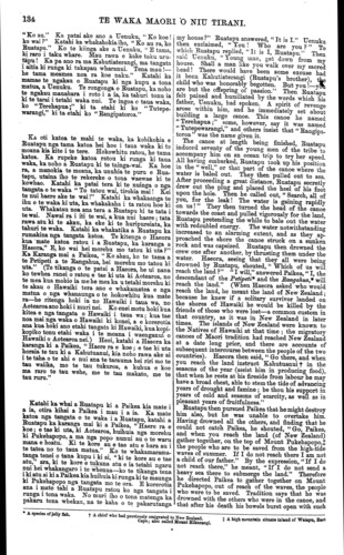 TE WAKA MAORI O NIU TIRANI. 133 pera katoa ki nga kainga katoa puta noa i te porowini katoa. [Tera ano tetahi taha o taua korero mahi i te rori i Kemureti, haere ki Tokoroa, tae ki Rotorua. I tera takiwa i mua, kua wha nei nga tau kua pahemo atu i muri nei, ara i taua takiwa i kaha rawa te tohe a te Kawanatanga kia mahia taua rori i korerotia i runga ake nei, otira na Ngatirangiwewehi (te hapu o Wi Maihi) i ki " taihoa,'' he mea hoki na ratou kia wha- karitea he tikanga utu i te Kawanatanga. No te kitenga he moumou korero noa te tohe kia nui ake he moni ma ratou, katahi ka whakaae te nuinga o te iwi. Engari ko Mita Hikairo, to ratou tino rangatira, i kiia e whakahe ana ki te mahinga o taua rori, otira kihai ia i whakakaha rawa i tana whakahe. Katahi ka haere nga rangatira o Ngatirangiwewehi ki Tapapa ki a Ngatiraukawa whakarite korero ai mo taua rori kia mahia, no te mea e tika ana ma runga i to ratou whenua. Na te Kawanatanga i utu te oranga mo aua rangatira i to ratou haerenga ra ki Tapapa. Mutu hua-kore noa iho ana ta ratou hui, hoki kau mai ana ratou, katahi ka ki mai ano i ta ratou ki " taihoa." A, ki tonu ratou i muri nei i taua ki " taihoa " tae noa ki te wa i whakapaua ki tetahi wahi, i kore ai te whaka- raruraru a nga Maori, nga moni i whakaritea i te tuatahi mo taua rori kua korerotia i runga ake nei.— KAI-TUHI o te Waka.] TE WANANGA. KAI te kore matou e pai ki te tahuri tonu ki nga kupu me nga korero e whakapuakina ana e te Wananga i etahi wa—he mea hoki kei raro rawa atu aua korero i ta matou i whakaaro ai o te tika raua ko te pono. Kaore ano hoki ra he take e tahuri ai matou ki nga korero o taua nupepa, no te mea e tino mohio ana matou kaore rawa i te ngaro te ahua o taua nupepa i nga iwi katoa o Niu Tirani katoa puta noa atu. Engari, kei nga korero o taua Wananga e tino kino ana, e tino teka rawa ana, katahi ano ka whakaaro matou he tika kia whakahe matou ki aua korero, ahakoa te whakarihariha i a matou ki te manuheko. No te Wananga o te 21 o Aperira nga korero kai raro iho nei, ara no te taha reo Maori o taua Wananga —ko te taha reo Pakeha i rere ke noa atu te korero. Koia nei taua korero :— " He tito kau na taua Waka Maori ana korero mo te hui i Omahu. Ko te kai tuhituhi o aua korero i taia nei e taua waka, he weku kau no te ha o te reo Maori, a he tangata e pinono haere ana i nga takiwa i Nepia nei, e utu moni ana kia whakina mai ki a ia he korero mo te whakawa a Henare Rata, e ora ai te whakawa mona, mo te Waka Maori." Na, ko te kai-tuhi o tenei nupepa, ara o te Waka, te tangata " e pinono haere ana, e utu moni ana kia whakina mai he korero ki a ia," e ai ki ta te Wana- nga ; a, ma nga Maori o te takiwa o Nepia e kite i te tino teka rawa atu o taua korero o te Wananga mona. TE RERENGA MAI O PAIKEA I HAWAIKI KI AOTEAROA NEI. HAWAIKI a Ruatapu e noho ana. He taina ia na Uenuku, na tana wahine mokai, na Paimahutanga. I tetahi rangi ka whakahorohoro a Ruatapu i tana manu taratahi, te tapakotanga, tau ana ki runga ki te whare o tona matua, o Uenuku. Katahi tera a Ruatapu ka piki ki te tiki i tona manu taratahi. Ka rongo a Uenuku katahi ka patai ake, " Ko wai tenei, e takahi nei i taku whare ?" Tekiinga iho a Ruatapu, shall be able to pass to every settlement in the pro- vince along well-made highways. [There is another side to the question of making the road from Cambridge via Tokoroa to Rotorua. Four years ago the Government strongly urged the formation of the road above alluded to, but the Nga- tirangiwewehi (Wi Maihi's own hapu), with a view to making a bargain with the Government, said "taihoa." When, at length, they found that it was useless endeavouring to obtain better terms, the majority of the people gave their consent. Mita Hikairo, however, their principal chief, was under- stood to be opposed to the opening up of the road, but he did not press his opposition. The Ngatirangi- wewehi chiefs then went to Tapapa to endeavour to arrange the matter with the Ngatiraukawa tribe, as the road would have to pass over their land. The Government paid the expenses of these chiefs. After a resultless meeting the deputation returned, and they again said "taihoa." And they continued to say " taihoa" until the money intended for that portion of the road was spent where the Natives were less obstructive.—ED. W.M.] TE WANANGA. WE do not usually condescend to notice statements and assertions which, from time to time, appear in the Wananga—their general tone is too far below our conception of what is honest and truthful. Nor indeed is it necessary, as a rule, that we should take cognizance of anything which appears in that paper, knowing, as we do, that its character is known and appreciated at its proper value by all the tribes throughout New Zealand. When, however, the Wananga proceeds to make statements which are absolutely vicious and untrue, it becomes our duty to contradict them, however repugnant to our feel- ings the task may be. The following is an extract from the Maori version of an article which appeared in the Wananga of the 21st of April last—the English rendering of the article in question is entirely different :— " The Waka Maori's statements about the Omahu meeting are entirely false. The person who wrote that report, which was printed in the Waka, has a smattering only of the Maori language, and he is a man who went about in the districts of Napier begging, and paying money that evidence might be given to him for the defence of the Waka Maori in the action of Mr. Henry Russell against him, against the Waka Maori" The gentleman who, according to the Wananga, was " begging, and paying money that evidence might be given to him," was the editor of this paper, and the Natives of the district of Napier will know that the above statement of the Wananga with regard to him is absolutely and unequivocally false. PASSAGE OF PAIKEA PROM HAWAIKI TO AOTEAROA (NEW ZEALAND). RUATAPU lived at Hawaiki. He was a son of Uenuku, by a slave wife named Paimahutanga. One day