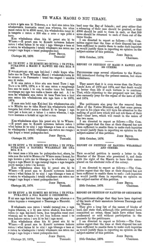 TE WAKA MAORI O NIU TIRANI. 139 e toru e tata ana ki Tokerau, a e inoi ana ratou kia whakawakia tuaruatia ranei aua whenua, kia utua ranei ratou ki te £500 moni, kia whakahokia ranei ki ia tangata o ratou e 200 eka o roto o nga piihi e toru. Kua whakahaua ahau kia ki penei atu ki te Whare:—E pouri ana te Komiti notemea kahore ratou i whai taima ki te uiui i nga tikanga e taea ai e ratou te whakaputa i tetahi whakaaro ma ratou mo runga i nga kupu o tenei pukapuka-inoi. JOHN BRYCE, Oketopa 25,1876.Tumuaki KO TE KUPU A TE KOMITI MO RUNGA I TE PUKA- PUKA-INOI A MAIHI P. KAWITI ME ONA HOA E 269. E WHAKAPUAKI ana nga kai-inoi i etahi kupu wha- kahe mo te Ture Whenua Maori i whakatakotoria ki te aroaro o te Paremete i tenei tau engari i unuhia ano ki waho. E ki ana ratou e kino atu ana tenei Ture i nga Ture o te 1873, 1874, a e ki ana ratou e rangirangi kau ano te mate i te ora, te waiho tonu hei taunu- unutanga mo nga tau maha e haere ake nei. A i te mea he whakahe ana ratou ki taua Ture hou e inoi ana ratou kia whakakorea atu nga ture o te 1873, 1874. E mea ana hoki nga Kai-inoi kia whakamutua atu a te Minita mo te taha Maori kia whakaturia tetahi tangata hei riiwhi mona e tahuri ki te hanga i nga ture pai e kore nei e tahae i o ratou whenua, i nga ture marama e kotahi ai nga iwi e rua. Kua whakahaua ahau kia penei atu ki te Whare: —E pouri ana te Komiti notemea kahore ratou i whai taima ki te uiui i nga tikanga e taea ai e ratou te whakaputa i tetahi whakaaro ma ratou mo runga i nga kupu o tenei pukapuka-inoi. JOHN BRYCE, Oketopa 25,1876.Tumuaki. KO TE KUPU A TE KOMITI MO RUNGA I TE PUKA PUKA-INOI A RANIERA WHARERAU ME ONA HOA E 2. Ko tenei mea e kiia ana he pukapuka-inoi, ehara, he reta noa iho ia ki te Mema o te Whare nana i homai, ko nga korero o roto mo te tikanga o te whakauru i nga ingoa o nga Maori ki nga rarangi ingoa o nga tangata pooti mema i roto i te koroni. Kua whakahaua ahau kia ki penei atu ki te Whare:—E pouri ana te Komiti notemea kahore ratou i whai taima ki te uiui i nga tikanga e taea ai e ratou te whakaputa i tetahi whakaaro ma ratou mo runga i nga kupu o tenei pukapuka-inoi. JOHN BRYCE, Oketopa 25,1876.Tumuaki. KO TE KUPU A TE KOMITI MO RUNGA I TE PUKA PUKA-INOI A NGA MAORI O OHINEMURI. E KI ana nga kai-inoi kua tangohia nga whenua o o ratou tupuna o waenganui o Tauranga o Hauraki. E whakaatu ana ratou i tetahi rarangi roa o nga ingoa whenua, a e ki ana ratou ahakoa kua kore o ratou (o nga kai-inoi) hara, kua tangohia ranei enei whenua mo te hara o te iwi kua hokona ranei i te mea kahore ratou i uru ki te kai i nga moni. Kua whakahaua ahau kia ki penei atu ki te Whare:—E pouri ana te Komiti notemea kahore ratou i whai taima ki te uiui i nga tikanga e taea ai e ratou te whakaputa i tetahi whakaaro ma ratou mo runga i nga kupu o tenei pukapuka-inoi. JOHN BRYCE, Oketopa 25, 1876,Tumuaki. and near the Bay of Islands; and pray either that a rehearing of their case should be granted, or that £500 should be paid to them in cash, or that 200 acres should be returned to each of them out of the three blocks. I am directed to report as follows:—The Com- mittee regret that the time at their disposal has not been sufficient to enable them to make such inquiries as would justify them in reporting an opinion on the subject-matter of this petition. JOHN BRYCE, 25th October, 1876.Chairman. REPORT ON PETITION OF MAIHI P. KAWITI AND 269 OTHERS. PETITIONERS urge several objections to the Native Bill introduced during the present session, but since withdrawn. They assert that it is even worse than the Native Lands Acts of 1873 and 1874, and that death would be better than life if such torture is to continue. That, while objecting to the proposed new law, they also earnestly pray for the repeal of the laws of 1873 and 1874. The petitioners also pray for the removal from office of the Native Minister, and that some person be put in his place who will turn his attention to the making of good laws which will not rob them of their land—clear laws, which will result in the union of the two races. I am directed to report as follows-.—The Com- mittee regret that the time at their disposal has not been sufficient to enable them to make such inpuiries as would justify them in reporting an opinion on the subject-matter of this petition. JOHN BRYCE, 25th October, 1876.Chairman. REPORT ON PETITION OF RANIERA WHARERAU AND OTHERS. THIS so-called petition is merely a letter to the Member of the House who presented it, and deals with the right of the Maoris to have their names placed on the electoral rolls of the colony. I am directed to report as follows:—The Com- mittee regret that the time at their disposal has not been sufficient to enable them to make such inquiries as would justify them in reporting an opinion on the subject-matter of this petition. JOHN BRYCE, 25th October, 1876.Chairman. REPORT ON PETITION OF NATIVES OF OHINEMURI THE petitioners allege that they have been deprived of the lands of their ancestors between Tauranga and the Thames. They give a long list of the names of blocks of land, and state that, although (the petitioners) have committed no crime, these lands have either been confiscated or sold without participation in the proceeds by the petitioners. I am directed to report as follows:—The Com- mittee regret that the time at their disposal has not been sufficient to enable them to make such inquiries as would justify them in reporting an opinion on the subject-matter of this petition. JOHN BRYCE, 25th October, 1876.Chairman.