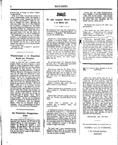 MATARIKI. TE HOKO O WHATAUPOKO. Ka tino hokona rawatia to 12,400 nga eke o Whataupoko Poraka, nui atu, iti iho ranei. Ko taua whenua e takoto ana i te takiwa o Papati Pei, e tutata ana ki te taone o Kihi- pane. Ko tenei hoko i runga i te tono o Paaka, te kaitango mokete. Ka haere hoki tenei hoko i runga i te whakahaere o te Kai Rehi- ta o te Hupirimi Kooti i Nepia i raro i nga tikanga o te Ture whakatikatika i te ture hoko whenua, 1860, i raro hoki i nga tikanga o te Tare, 1870, e whakamana ana nga kai- tango mokete ki te hoko i nga whenua i moketetia kia ratou. Na, kua tae atu te tono ki a PITI raua ko PENETI, na Paora A.F. Paata, kai Rehita o te Hupirimi Kooti o Nepia i tuku atu taua tono kia rana I RUNGA I TE WHAKAAE- TANGA o ke kaitango o te mokete kia ho- kona, kia maketetia mutia i ta raua whare makete i te taone o Kihipane a TE PARAIRE, te 29 o nga ra o APEREIRA, 1881, i te rua haora me te hawhe i muri iho i te tina. WAHI TUATAHI e hokona ana. Katoa o taua piihi whenua tona nuinga 12, 400 nga eka, nui atu iti iho ranei, tetahi wahi o WHATAUPOKO, i te takiwa o Turanga, Papati Pei. Koia te whenua i whakahuatia i roto i tetahi puka- puka, a, i raro i te mana o taua pukapuka, i runga hoki i ana tikanga e hokona ana e te kai tango i te Mokete e PAAKA taua whenua. KO TE WAHI TUARUA. Te whaitaketanga, me te paanga tera e riro mai ki te kai tango i te mokete i runga i tetahi kotahi mano eka kaore i uru ki roto ki te 12, 400, i muri mai i te utunga atu i nga moni Ł6600 me nga inatareti i whakata turutia ki tetahi tangata ke (ko te wahi tenei e mohiotia ana kei a Makitanara) e nga kai tuku i te mokete. KO WHATAUPOKO Ko tenei whenua e hokona ana i runga i te tono a PAAKA e takoto ana ki te hangai- taunga ki te taone, a, ko te awa o Waimate te rohe i Waenganui i taua whenua, me nga whenua e mohiotia nuitia ana ko Pouawa me kaiti. Ko nga ritenga enei mo te hoko. Kotahi wahi o nga wahanga e wha o te moni, ara tetahi koata ka utua tonutia i te takiwa tonu ka hokona te whenua ko WHATAUPOKO. Ko te toenga o te moni me utu i te whakao- tinga o te pukapuka tuku i roto, i nga ra i whakaritetia i runga i nga tikanga o te hoko. Eo nga tangata e hiahia ana ki te patai mo nga tikanga mo te taha ki te hoko, me ui atu ratou ki te Roia mo Paaka i Kihipane ara kia. H. 3. WIINI, Roia, Kihipane. Kia WIREMU RII RIIHI, no Nepia aia i mua, engari, no Kihi- pane, Papete Pei, inaianei, i roto i te koroni o Nui Tireni, roia, kia WIREMU PERE, kia RIPE- RATA KAHUTIA, no tana Papeti Pei, ano raua, he tangata Maori. KIA MOHIO KOUTOU, kia kotahi marama i muri i ho i te panuitanga i tenei panui i roto i nga nupepa erua i taia i Kihipane me nga niupepa erua i taia i Poneke, ka hokona e au ka tukuna atu ranei e au kia hokona kia maketetia, nga whenua i whakaatutia i roto i tetaki puka- puka mokete i tuhia i te 25 o nga ra o Pepuere, 1879, (i rehitatia i te tari Rehita Pukapuka i Nepia i raro i te nama 13175). Ko taua pukapuka i waenganui ia koutou o tetahi taha, me au ko PEREHIWA PAAKA, i whakahuatia i raro iho nei o tetahi taha. Na, ka hokona, ka makete tia aua whenua, ki te kore, koutou e utu mai ki au nga tino moni pukai i whakatuturitia mai ki au i runga i taua pukapuka mokete, te toenga ranei, me nga inatarete—nga moni whakapiki katoa, e tika ana kia utua ki au i runga i taua puka- puka, mokete. Na, tenei ano hoki tetahi, kia mohio koutou, ko te take i tukuna atu e au tenei panui kia panuitia, koia tenei,—ara,—kaore ano koutou i atu mai ki au nga tino moni pukai me nga moni inatereti —nga moni whakapiki i whakaaetia i ranga i nga ritenga i whakaatutia i roto i taua pukapuka mokete. I tuhia i tenei te 12 o nga ra o Maehe 1881. NA PERIHIWA PAAKA. HIU J. WUNI, Roia, Kihipane.