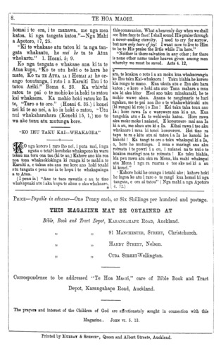 Correspondence to be addressed "Te Hoa Maori, " care of Bible Book and Tract