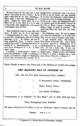 Correspondence to be addressed "Te Hoa Maori, " care of Bible Book and Tract