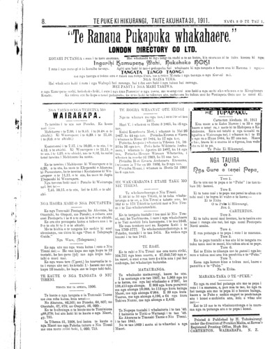 8.\_\_ TE PUKE KI HIKURANGI, TAITE AKUHATA 31,1911. NAMA 3 O TE TAU 1