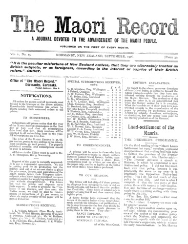 The Maori Record 1905-1907: Volume 2, Number 15. 01 September 1906 |