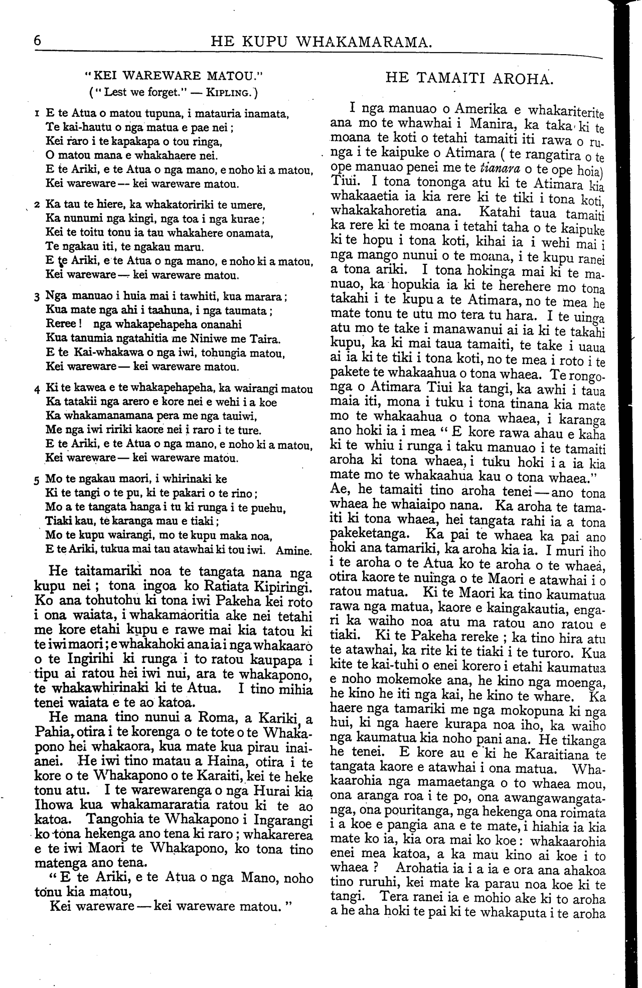 HE KUPU WHAKAMARAMA. o. Kaore e hari ki te he te aroha, (ra. 6). Whakaporangi ai etahi tangata kia katangia atu ai e etahi. E ingoa nui ana etahi tangata kino i runga i to ratou kino. Kinongia nga mahi kino, nga korero kino, nga tikanga kino katoa. Kaua e hari mehemea ki te taka tetahi atu ki te he, engari kia pouri, kia inoi. He mea whakapehapeha na te Maori to ratou aroha, tirohia ta te Karaipiture aroha i whakaatu ai, ara to te ngakau. " E kore te aroha e hanga kino ki tona hoa; ko te aroha hoki te whakaritenga o te ture." (Rom. 13, 10). NGA RETA TUKU MAI. TE KURA TAKUTA. ( Na te kai-tuku korero mai o Murihiku. ) Otepoti ( Dunedin ) Hune 18th, 1899. Ki nga Etita o te Pipiwharauroa, E hoa ma tena korua. Ehara i te mea he kore korero i kore ai e hamumu wawe te waha, engari he kore takiwa watea, hai tuhinga atu. Katahi nei ano te takiwa watea, na reira, ka toko ake te ngakau kia tukua atu enei kupu. Aku kupu tuatahi mo te mahi nana nei au i kawe mai ki tenei kainga ara te "mahi takuta." Kaore ano au i uru noa ki te tino mahi takuta. Ko taku mahi inaianei he ako i etahi mea ke, otira kia puta au i tenei whakamatautauranga a te mutunga o tenei tau, katahi ano ka uru ki nga mahi nui a taua hunga a te takuta. Enei kupu aku he whakaatu kau atu i te ahua o nga mahi o taua kainga. No tetahi rangi ka haere matau ko etahi o nga tangata o taua kura ki te matakitaki. I haere matau ki te ruuma tapatapahi i te tuatahi. I reira e tako ana etahi tangata kua mate, engari kaore ano kia tapatapahia. Te ahua o taua ruuma tena te rereke na. Tona haunga hoki tino kaha atu hai aha ma te pakeha. Tena ana rongoa hai patu i te kino i te aha noa iho. Ka mutu tena ka haere matau ki te ruuma putunga iwi. E putu ana tera te iwi tangata, mehemea he toma no nehera. I reira ano e putu ana nga mea a te pakeha hai mahi mo nga mate o ia wahi o ia wahi o te tinana. Ka mutu tenei ka haere matau ki tetahi atu ruuma: I reira te mahi a te whakaahua o ia mate o ia mate o te tinana o te tangata, a he hanga wetiweti tera. Ka mutu tena ka haere matau ki te ruuma rongoa. Tetahi ruuma nui, kii tonu i te rongoa mo ia mate mo ia mate. Tetahi kura whakamiharo atu tenei. He maha hoki ona tangata kua puta hai takuta. Kia mohio mai hoki korua e hoa ma koia nei tetahi o nga kura takuta tino uaua atu o te ao nei. E rite tonu ana ki nga kura o Ingarangi. No reira mehemea te tangata ki te puta, e rite tonu ana ia ki nga tino tangata o Ingarangi. Heoi ano. Na to korua hoa aroha. Tutere Wi Repa. HUKARERE. Kia Te Pipiwharauroa, E Manu, tena koe ! I te hawhe tuatahi o tenei tau e 61 nga tamariki i te kura o Hukarere. No Ngati- kahungunu e 22; no Ngatiporou 17; no Ngapuhi hui atu ki te Rarawa e 7; no te Arawa e 6; no Turanga e 3; no Waikato e 3 ; no Ngatiraukawa e 2 : no Wharekauri 1. Ko nga tino kai-whakahaere o tenei kura ko nga tamahine a Te Wiremu, Pihopa tua- tahi o Waiapu. Ko te kai-whakahaere o raro iho ia ratou ko Miss Bulstrode; ona hoa, ko Miss Baker, ko Miss A. Gage, ko Miss Brown. Ka kite iho nga tamariki tawhito o Hukarere kua ngaro nga ingoa o nga kai-whakaako o te takiwa i a ratou e kura ana, ara, nga ingoa o Miss Down raua ko Miss Minton. Ko Miss Down kua marena kia Mr. J. Hope. Kei Nepia tonu raua ko tona hoa e noho ana. Ko Miss Minton no tenei tau i mutu ai tona noho ki Hukarere ; kei Akarana ia inaianei. Kei te mahara tonu nga tamariki o te kura ki to raua pai, ki to raua atawhai kia ratou i mua. Ko Miss Bulstrode i haere mai i Ingarangi, he wahine mihinare. E nga tamariki o Hukarere i te kainga, tena koutou katoa — tena koutou ia koutou na mahi i o koutou na haringa, pouritanga ranei. Kia tumanako, kia hari. E mea ana te Ariki: "Ko ahau ko Ihowa ko tou Atua kei te pupuri i tou ringaringa matau, te mea atu nei kia koe, kaua e wehi; ko ahau hei whakaahuru mou," Kaati e ' Te Pipi' ka hoki to tono. Heoi ano. Na Hukarere. HE WHAKATUPATO. E koa ana a Ingarangi me ona koroni huh- ua i te ra nui o te Kuini, e kikii ana nga pepa i nga whakapehapeha mo te mana, mo te toa, mo te kaha o Ingarangi, ka puta te waiata e mau ake nei te whakamaoritanga, na tetahi o nga tangata matau o Ingarangi i tuhituhi.