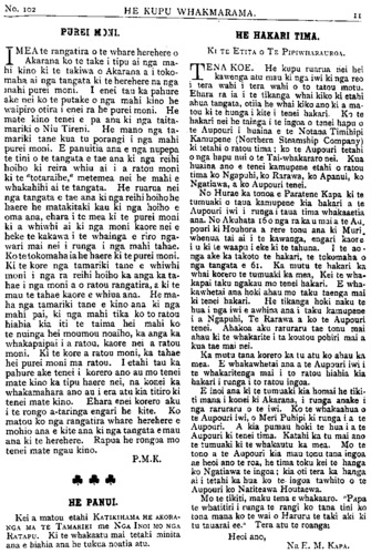 No. 102 HE KUPU WHAKAMARAMA. PUREI MONI. I MEA te rangatira o te whare herehere o Akarana ko te take i tipu ai nga ma- hi kino ki te takiwa o Akarana a i toko- maha ai nga tangata ki te herehere na nga mahi purei moni. I enei tau ka pahure ake nei ko te putake o nga mahi kino he waipiro otira i enei ra he purei moni. He mate kino tenei e pa ana ki nga taita- mariki o Niu Tireni. He mano nga ta- mariki tane kua tu porangi i nga mahi purei moni. E panuitia ana e nga nupepa te tini o te tangata e tae ana ki nga reihi hoiho ki reira whiu ai i a ratou moni ki te "totaraihe,"/' metemea nei he mahi e whakahihi ai te tangata. He ruarua nei nga tangata e tae ana ki nga reihi hoiho haere he matakitaki kau ki nga hoiho e oma ana, ehara i te mea ki te purei moni ki a whiwhi ai ki nga moni kaore nei e heke te kakawa i te whainga e riro nga- wari mai nei i runga i nga mahi tahae. Ko te tokomaha ia he haere ki te purei moni. Ki te kore nga tamariki tane e whiwhi moni i nga ra reihi hoiho ka anga ka ta- hae i nga moni a o ratou rangatira, a ki te mau te tahae Kaore e whiua ana. He ma- ha nga tamariki tane e kino ana ki nga mahi pai, ki nga mahi tika ko to ratou hiahia kia iti te taima hei mahi ko te nuinga hei moumou noaiho, ka anga ka whakapaipai i a ratou, kaore nei a ratou moni. Ki te kore a ratou moni, ka tahae hei purei moni ma ratou. I etahi tau ka pahure ake tenei i korero ano au mo tenei mate kino ka tipu haere nei, na konei ka whakamahara ano au i era atu kia titiro ki tenei mate kino. Ehara enei korero aku i te rongo a-taringa engari he kite. Ko matou ko nga rangatira whare herehere e mohio ana e kite ana ki nga tangata e mau ana ki te herehere. Rapua he rongoa mo tenei mate ngau kino. P.M.K. HE PANUI. Kei a matou etahi KATIKIHAMA HE AKORA- NGA MA TE TAMARIKI me NGA INOI MO NGA RATAPU. Ki te whakaatu mai tetahi minita ana e hiahia ana he tukua noatia atu. HE HAKARI TIMA. Ki TE ETITA O TE PIPIWHARAUROA. TEN A KOE. He kupu ruarua nei hei kawenga atu mau ki nga iwi ki nga reo i tera wahi i tera wahi o to tatou motu. Ehara ra ia i te tikanga whai kiko ki etahi ahua tangata, otiia he whai kiko ano ki a ma tou ki te hunga i kite i tenei hakari. Ko te hakari nei he tainga i te ingoa o tenei hapu o te Aupouri i huaina e te Notana Timihipi Kamupene (Northern Steamship Company) ki tetahi o ratou tima; ko te Aupouri tetahi o nga hapu nui o te Tai whakaaro nei. Kua huaina ano e tenei kamupene etahi o ratou tima ko Ngapuhi, ko Rarawa, ko Apanui, ko Ngatiawa, a ko Aupouri tenei. No Hurae ka tonoa e Paratene Kapa ki te tumuaki o taua kamupene kia hakari a te Aupori iwi i runga i taua tima whakaaetia ana. No Akuhata 160 nga ra ka u mai a te Au. pouri ki Houhora a rere tonu ana ki Muri. whenua tai ai i te kawanga, engari kaore i u ki te waapu i eke ki te tahuna. I te ao- nga ake ka takoto te hakari, te tokomaha o nga tangata e 61. Ka mutu te hakari ka whai korero te tumuaki ka mea, Kei te wha- kapai taku ngakau mo tenei hakari. E wha- kawhetai ana hoki ahau mo taku taenga mai ki tenei hakari. He tikanga hoki naku te hua i nga iwi e awhina ana i taku kamupene i a Ngapuhi, Te Rarawa a ko te Aupouri tenei. Ahakoa aku raruraru tae tonu mai ahau ki te whakarite i ta koutou pohiri mai a kua tae mai nei. Ka mutu tana korero ka tu atu ko ahau ka mea. E whakawhetai ana a te Aupouri iwi i te whakaritenga mai i to ratou hiahia kia hakari i runga i to ratou ingoa. E inoi ana ki te tumuaki kia homai he tiki- ti mana i konei ki Akarana, i runga anake i nga raruraru o te iwi. Ko te whakaahua o te Aupouri iwi, o Meri Puhipi ki runga i a te Aupouri. A kia pumau hoki te hua i a te Aupouri ki tenei tima. Katahi ka tu mai ano te tumuaki ki te whakautu ka mea. Mo te tono a te Aupouri kia mau tonu tana ingoa ae heoi ano te roa, he tima toku kei te hanga ko Ngatiawa te ingoa; kia oti tera ka hanga ai i tetahi ka hua ko te ingoa tawhito o te Aupouri ko Natiteawa Houtaewa. Mo te tikiti, maku tena e whakaaro. "Papa te whatitiri i runga te rangi ko tana tini ko tona mana ko te wai o Haruru te taki aki ki tu tauarai e." Tera atu te roanga: Heoi ano, Na E. M. KAPA.