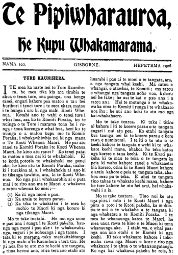 Te Pipiwharauroa, he Kupu Whakamarama. NAMA 102. GISBORNE. HEPETEMA 1906 TURE KAUNIHERA. ITE mea ka mate nei te Ture Kaunihe- ra, he mea tika kia ata tirohia te ahua o tenei ture, ona painga, ona henga ranei, engari kahore pea matou e tau hei hurihuri i tenei ture i te mea ehara matou i te hunga i uru ki nga mahi Kooti Whe^ nua. Kotahi ano te wahi o tenei ture i whai hua, ara ko te Komiti Poraka, ko te nuinga o te Ture i marama tona he i ru- nga i tona korenga e whai hua, heoi ko te nuinga o a matou kupu mo te Komiti Poraka, i whakawhiwhia nei ki nga mana o Te Kooti Whenua Maori. Hapai atu ranei te Komiti Poraka ite Kooti Whenua Maori, he kino atu ranei? Ko tenei patai ta matou e mea nei ki te whakahoki. Ki te kotia pototia te whakahoki me penei ake, he kino atu te Komiti Poraka, inaho- ki i turakina ai, a, i whakahokia ai ano ki te tikanga tavvhito, ara, ki te Kooti Whe- nua. Ko nga pai i whakaarohia ai e puta mai i te riro ano ma te Maori e whakawa o ratou whenua ko enei;— (1) Ka iti nga moni e pau. (2) Ka araia te korero parau. (3) Ka tika te whakatau i te mea he ' mohio te Maori ki nga korero ki nga tikanga Maori. Mo te take tuatahi. He nui nga moni e pau ana i runga i te Kooti pakeha, hau- nga nga moni i pau ake i te whakawaka- nga, engari i te nohoanga i nga taone. I tata ki te marama taku matakitakitanga ki nga mahi a te Kaunihera i tera tau. He iti noa iho te utu mo te keehi ate tangata, e rima hereni ano, otira tera ano etahi atu huarahi i pau ai te moni a te tangata, ara, a nga tangata whai keehi. Ma ratou e whangai, e atawhai, te Komiti; ma ratou e whangai nga tangata noho noa, kahore nei he take; he nui te kai e pau ana i a ratou ano. Hei te mutunga o te whaka- wa ka utua te Komiti i runga i te whakaaro noa iho; he nui ano hoki te utu mo nga kaiwhakahaere. Mo te take tuarua. Ki taku i titiro ai kahore i iti te korero parau o te tangata engari i nui atu pea. Ko etahi tangata kua taunga nei ki te korero parau e kore rawa e numinumi. I te iti o te utu o te keehi kahore te tangata e wehi ki te wha- katu keehi mana, ahakoa he teka katoa nga korero o tana keehi. Ki te Kooti pa- keha ki te mau te teka o te tangata ka peia ki waho kahore ranei e whakaaetia kia korero, otira ki te Kooti Maori kahore e araia kahore e peia te tangata teka, aha- koa mau pu te teka. E ahei te tangata tino tahae te whakatu keehi mana, kahore he ture kahore he utu hei arai, hei whaka- wehi i a ia. Mo te take tuatoru. Tino nui ke atu nga piira i Toto i te Kooti Maori i nga piira o roto i te Kooti pakeha, ka mohio tia te nui o te whakahe a te tangata ki nga whakatau a te Komiti Poraka. I te mea he whanaunga katoa te Maori, he mea uaua rawa te kino o te Maori ki tona whanaunga ake. I etahi wa, e whai paa- nga ana ano etahi o te Komiti ki nga keehi. Ki taku whakaaro kahore i toko- maha rawa nga Maori e kore e riro nga whakaaro i te ahua o te whanaungatanga. Ko nga kai whakawa pakeha he roia, he