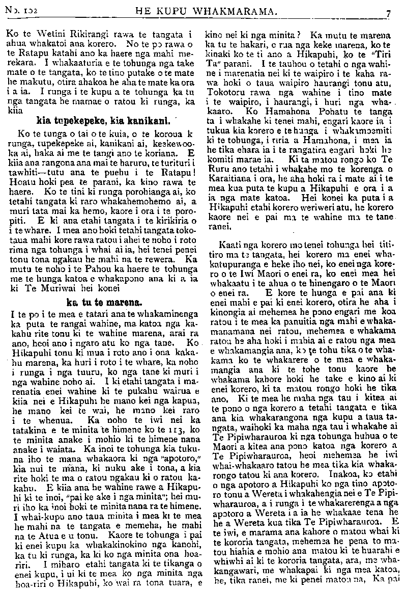 . HE KUPU WHAKAMARAMA. Ko te Wetini Rikirangi rawa te tangata i ahua whakatoi ana korero. No te po rawa o te Ratapu katahi ano ka haere nga mahi me rekara I whakaaturia e te tohunga nga take mate o te tangata, ko te tino putake o te mate he makutu, otira ahakoa he aha te mate ka ora i a ia. I runga i te kupu a te tohunga ka tu nga tangata he mamae o ratou ki runga, ka kiia kia tupekepeke, kia kanikani. Ko te tunga o tai o te kuia, o te koroua ki runga, tupekepeke ai, kanikani ai, keekewoo ka ai, haka ai me te tangi ano te konana. E kiia ana rangona ana mai te haruru, te turituri i tawhiti—tutu ana te puehu i te Ratapu! Hoatu hoki pea te parani, ka kino rawa te haere. Ko te tini ki runga porohianga ai, ko tetahi tangata ki raro whakahemohemo ai, a muri tata mai ka hemo, kaore i ora i te poro- piti. E ki ana etahi tangata i te kirikiria o i te whare. I mea ano hoki tetahi tangata toko- taua mahi kore rawa ratou i ahei te noho i roto rima nga tohunga i whai ai ia, hei tenei penei tonu tona ngakau he mahi na te rewera. Ka mutu te noho i te Pahou ka haere te tohunga me te hunga katoa e whakapono ana ki a ia ki Te Muriwai hei konei ka tu te marena. I te po i te mea e tatari ana te whakaminenga ka puta te rangai wahine, ma katoa nga ka- kahu rite tonu ki te wahine marena, arai ra ano, heoi ano i ngaro atu ko nga tane. Ko Hikapuhi tonu ki mua i roto ano i ona kaka- hu marena, ka huri i roto i te whare, ka noho i runga i nga tuuru, ko nga tane ki muri i nga wahine noho ai. 1 ki etahi tangata i ma- renatia enei wahine ki te pukahu wairua e kiia nei e Hikapuhi he mano kei nga kapua, he mano kei te wai, he mano kei raro i te whenua. Ka noho te iwi nei ka tatakina e te minita'te himene ko te 113, ko te minita anake i mohio ki te himene nana anake i waiata. Ka inoi te tohunga kia tuku- na iho te mana whakaora ki nga "apotoro," kia nui te mana, ki nuku ake i tona, a kia rite hoki te ma o ratou ngakau ki o ratou ka- kahu. E kiia ana he wahine rawe a Hikapu hi ki te inoi, "pai ke ake i nga minita"; hei mu- ri iho ka moi hoki te minita nana ra te himene. I whaikupu ano taua minita i mea ki te mea he mahi na te tangata e memeha, he mahi na te Atua e u tonu. Kaore te tohunga i pai ki enei kupu ka whakakinokino nga kanohi, ka tu ki runga, ka ki ko nga minita ona hoa- riri. I miharo etahi tangata ki te tikanga o enei kupu, i ui ki te mea ko nga minita nga hoariri o Hikapuhi, ko wai ra tona tuara, e kino nei ki nga minita? Ka mutu te marena ka tu te hakari, e rua nga keke marena, ko te kinaki ko te ti ano a Hikapuhi, ko te "Tiri Ta" parani. I te tauhou o tetahi o nga wahi- ne i marenatia nei ki te waipiro i te kaha ra- wa hoki o taua waipiro haurangi tonu atu, Tokotoru rawa nga wahine i tino mate i te waipiro, i haurangi, i huri nga wha kaaro. Ko Hamahona Pohatu te tanga ta i whakahe ki tenei mahi, engari kaore ia i tukua kia korero e te hunga i whakamoemiti ki te tohunga, i riria a Hamahona, i mea ia he tika ehara ia i te rangatira engari hoki he komiti marae ia. Ki ta matou ronga ko Te Raru ano tetahi i whakahe mo te korenga o Karaitiana i ora, he aha hoki ra i mate ai i te mea kua puta te kupu a Hikapuhi e ora i a ia nga mate katoa. Hei konei ka puta i a Hikapuhi etahi korero weriweri atu, he korero kaore nei e pai ma te wahine ma te tane ranei. Kaati nga korero mo tenei tohunga hei titi- tiro ma te tangata, hei korero ma enei wha- katupuranga e heke iho nei, ko enei nga kore- ro o te Iwi Maori o enei ra, ko enei mea hei whakaatu i te ahua o te hinengaro o te Maori o enei ra. E kore te hunga e pai ana ki enei mahi e pai ki enei korero, otira he aha i kinongia ai mehemea he pono engari me koa ratou i te mea ka panuitia nga mahi e whaka- manamana nei ratou, mehemea e whakama ratou he aha hoki i mahia ai e ratou nga mea e whakamangia ana, ki te tohu tika o te wha- kama ko te whakarere o te mea e whaka- mangia ana ki te tohe tonu kaore he whakama kahore hoki he take e kino ai ki enei korero, ki ta matou rongo hoki he tika ano. Ki te mea he maha nga tau i kitea ai te pono o nga korero a tetahi tangata e tika ana kia whakarangona nga kupu a taua ta- ngata, waihoki ka maha nga tau i whakahe ai Te Pipiwharauroa ki nga tohunga huhua o te Maori a kitea ana pono katoa nga korero a Te Pipiwharauroa, heoi mehemea he iwi whaiwhakaaro tatou he mea tika kia whaka- rongo tatou ki ana korero. Inakoa, ko etahi o nga apotoro a Hikapuhi ko nga tino apoto- ro tonu a Wereta i whakahengia nei e Te Pipi- wharauroa, a i runga i te whakarerenga a nga apotoro a Wereta i a ia he whakaae tena he he a Wereta kua tika Te Pipiwharauroa. E te iwi, e marama ana kahore o matou whai ki te kororia tangata, mehemea he pena to ma- tou hiahia e mohio ana matou ki te huarahi e whiwhi ai ki te kororia tangata, ara, me wha- kangawari, me whakapai ki nga mea katoa, he, tika ranei, me ki penei matou na, Ka pai