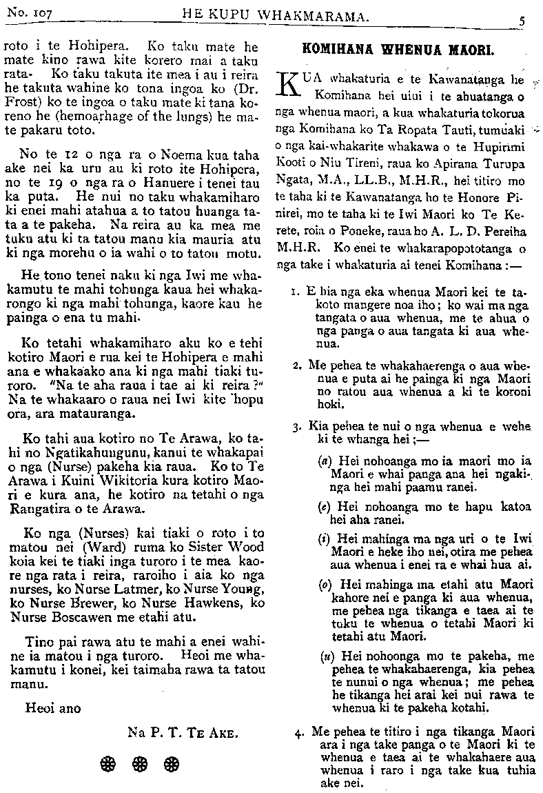 HE KUPU WHAKAMARAMA. roto i te Hohipera. Ko taku mate he mate kino rawa kite korero mai a taku rata- Ko taku takuta ite mea i au i reira he takuta wahine ko tona ingoa ko ( Dr. Frost) ko te ingoa o taku mate ki tana ko- reno he (hemoarhage of the lungs) he ma- te pakaru toto. No te 12 o nga ra o Noema kua taha ake nei ka uru au ki roto ite Hohipera, no te 19 o nga ra o Hanuere i tenei tau ka puta. He nui no taku whakamiharo ki enei mahi atahua a to tatou huanga ta- ta a te pakeha. Na reira au ka mea me tuku atu ki ta tatou manu kia mauria atu ki nga morehu o ia wahi o to tatou motu. He tono tenei naku ki nga Iwi me wha- kamutu te mahi tohunga kaua hei whaka- rongo ki nga mahi tohunga, kaore kau he painga o ena tu mahi. Ko tetahi whakamiharo aku ko e tehi kotiro Maori e rua kei te Hohipera e mahi ana e whakaako ana ki nga mahi tiaki tu- roro. "Na te aha raua i tae ai ki reira?" Na te whakaaro o raua nei Iwi kite hopu ora, ara matauranga. Ko tahi aua kotiro no Te Arawa, ko ta- hi no Ngatikahungunu, kanui te whakapai o nga (Nurse) pakeha kia raua. Ko to Te Arawa i Kuini Wikitoria kura kotiro Mao- ri e kura ana, he kotiro na tetahi o nga Rangatira o te Arawa. Ko nga (Nurses ) kai tiaki o roto i to matou nei (Ward) ruma ko Sister Wood koia kei te tiaki inga turoro i te mea kao- re nga rata i reira, raroiho i aia ko nga nurses, ko Nurse Latmer, ko Nurse Young, ko Nurse Brewer,ko Nurse Hawkens, ko Nurse Boscawen me etahi atu. Tino pai rawa atu te mahi a enei wahi- ne ia matou i nga turoro. Heoi me wha- kamutu i konei, kei taimaha rawa ta tatou manu. Heoi ano KOMIHANA WHENUA MAORI. KUA whakaturia e te Kawanatanga he Komihana hei uiui i te ahuatanga o nga whenua maori, a kua whakaturia tokorua nga Komihana ko Ta Ropata Tauti, tumuaki o nga kaiwhakarite whakawa o te Hupirimi Kooti o Niu Tireni, raua ko Apirana Turupa Ngata, M. A., LL. B., M. H. R., , hei titiro mo te taha ki te Kawanatanga ho te Honore Pi- nirei, mo te taha ki te Iwi Maori ko Te Ke- rete, roia o Poneke, raua ko A. L. D. Pereiha M. H. R. Ko enei te whakarapopototanga o nga take i whakaturia ai tenei Komihana:— 1. E hia nga eka whenua Maori kei te ta- koto mangere noa iho; ko wai ma nga tangata o aua whenua, me te ahua o nga panga o aua tangata ki aua whe- nua. 2. Me pehea te whakahaerenga o aua whe- nua e puta ai he painga ki nga Maori no ratou aua whenua a ki te koroni hoki. 3. Kia pehea te nui o nga whenua e wehe. ki te whanga hei;— (a) Hei nohoanga mo ia maori mo ia Maori e whai panga ana hei ngaki- nga hei mahi paamu ranei. (e) Hei nohoanga mo te hapu katoa hei aha ranei. (i') Hei mahinga ma nga uri o te Iwi Maori e heke iho nei, otira me pehea aua whenua i enei ra e whai hua ai. (o) Hei mahinga ma etahi atu Maori kahore nei e panga ki aua whenua, me pehea nga tikanga e taea ai te tuku te whenua o tetahi Maori ki tetahi atu Maori. (u) Hei nohoonga mo te pakeha, me pehea te whakahaerenga, kia pehea te nunui o nga whenua; me pehea he tikanga hei arai kei nui rawa te whenua ki te pakeha kotahi. 4. Me pehea te titiro i nga tikanga Maori ara i nga take panga o te Maori ki te whenua e taea ai te whakahaere aua whenua i raro i nga take kua tuhia ake nei.