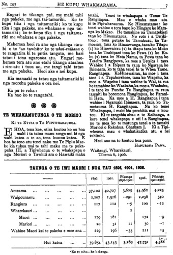 HE KUPU WHAKAMARAMA. Engari te tikanga pai, me mahi tahi nga pakeke me nga taitamariki. Ko te kupu tika i nga taitamariki; ko te kupu tika i nga pakeke, me whakaae e nga tai- tamariki; ko te kupu tika i nga taitama- riki me whakaae e nga pakeke. Mehemea heoi ra ano nga tikanga rara- hi o te "ao tawhito" ko te whai-raihana o te rangatira ki te putia tangata, me hari tatau i tona ngaronga atu. Engari me- hemea tera atu ano etahi tikanga ataahua i riro atu i taua ao, me tangi tahi tatau me nga pakeke. Heoi ake e nei kupu. Kia manaaki ra tatau nga taitamariki ki nga morehu pakeke e ora nei. Ka pu te ruha: Ka hao ko te rangatahi. TE WHAKAMUTUNGA O TE MORIOR Ki TE ETITA O TE PIPIWHARAUROA. EHOA, tena koe, otira koutou ko ou hoa mahi i ta tatou manu rongo nui ki nga wahi katoa o te ao, tena koutou katoa. E hoa he tono atu tenei naku mo Te Pipi o Mae- he kia tukua mai te tahi maku me te puka- puka III. a Tipiwhenua o te whakapapa o nga Moriori o Tawhiti ara o Hawaiki maku tetahi. Tenei te whakapapa o Tame Te Rangitupua. Mau e whaka mau atu ki te Pipiwharauroa. Ko Hinematarau: ko tenei wahine e toru hapu ko Hingaru ko Mata- nga ko Makao. He tamahine na Tamatekieri tana ko 'Hinematarua. No roto i a Teriki- tono; tona putake ko Hinaawanga, ko Ta- moerau, tana koHinaawanga, tana ko Titapu (1) ko Hinewairau (2) ta titapu tana ko Moko tana ko Teahipani tona ko Pewa (1) ko Ko- hu (2) tana ko Heta Namu, ta Pewa tana ko Teteira Rangipewa, ka moe a Teteira i tana Wahine i a Ihipera ta raua ko Ngaraua ko Ihimaera, ko te taha tenei ki te Whea Tame. Rangitapua. Ko Hinewairau, ka moe i tana tane i a Tapahorehore, tana ko Wapehu, ka moe a Wapehu i tana wahine ia Wai, ta rua he tamahine ko Waakahu, ka moe a Waakahu, i te tane ko Purehe Te Rangitapua ta raua tamaiti ko horomona Rangitapua, ko Parani- hi Heta. Ka moe a H. Rangitapua i tana wahine i Ngaruaki Ihimaera, ta raua ko Ta- metaurua H. Rangitapua Na ko tenei Whakapapa, i mahi kia perehitia mai e kou- tou. Ki te tangohia ahau e te Kaihanga, e kore tenei whakapapa e oti i a Rangitapua no te mea ko te mutunga tenei o te tamaiti Moriori o Rekohua, Chatham I. Ki a Tipi- whenua mau e whakatikatika atu e nei tuhituhi. Heoi ano na to koutou hoa pono. HAPURONA PAWA. Waitangi, Wharekauri, Tihema 6, 1906. TAUNGA O TE IWI MAORI I NGA TAU 1896, 1901, 1906. -e Pikanga Pikanga ———— 1896. 1901. ^896.I9(oI. 1906. 1901.1^6. Aotearoa ... ... ... ... ... 37,102 40,707 3,605 44,962 4,225 Waipounamu ... ... ... ... 2,207 1,916 "291 2,256 340 Rangiura ... ... ... ... ... 117 112 -5 100 "12 Wharekauri... ... ... ... ... 2 Maori ... ... ... ... ... 179 181 172 -9 Mahori... ... ... ... ... 20 31 11 30 -i Wahine Maori kei te pakeha e moe ana... 229 196 "33 2II ^5 , '"ia Hui katoa ... ... 39>854 43>I43 3.289 47.75I 4.588 •Ko te tohu—he hekenga.