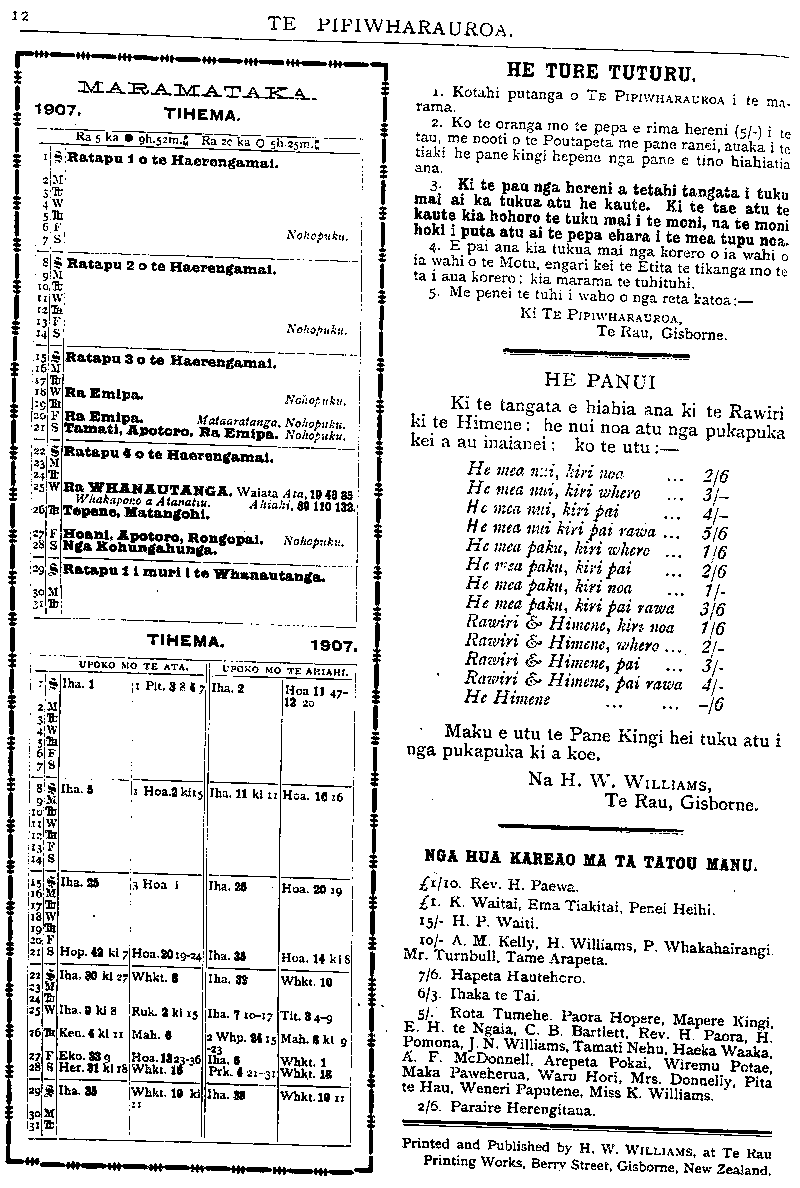 HE KUPU WHAKAMARAMA. HE PANUI KI TE IWI MAORI I TE PIHOPATANGA O WAIAPU. Tahua Oranga mo te Pihopa. E HOA MA, Tena koutou. He kupu whakamahara tenei ki a koutou mo te Hui i tu nei ki Turanga i te tau 1863, mo te kohi hoki o taua Hui e £500. Ko te timatanga tena o te tahua oranga mo te Pihopa o Waiapu. Na koutou te timatanga, kua whakanuia hoki e te Pakeha—a ka nuku ake i nga tau e 40 kahore ano kia tino rite hei oranga mo to tatou Pihopa. I puta te kupu i te Hinota i tu nei ki Nepia i tera tau kia putate uaua o nga tangata katoa o te Pihopatanga kia oti rawa taua mahi i timata na i a koutou. I whakaturia hoki tetahi komiti, tokotoru nga minita, tokorua nga mangai reimana, hei whakarite i taua mahi. I mea mai taua komiti maku e whakaatu ki a koutou, ki te iwi Maori tenei mahi ma tatou. Ko te moni e hapa tonu ana £14, 000, kia hanga ai he whare mo te Pihopa, kia tino rite ai hoki he oranga mona. I timata i a Mei ka hori nei te mahi a taua Komiti; £2018 5s£2018 5s od. te moni ka riro i a ratou inaianei. Kua whakaaria e te Pihopa ratou ko etahi o ona whanaunga ma ratou e £7000; ara ma ratou e hoatu takitahi te pauna hei tapiri ki te pauna i hoatu e tetahi tangata. Heoi kia tapiritia te £2018 5s. od. a te Pihopa ma ki ta te Komiti, ka £4036 10s. od. te kohi katoa. Ko te toenga £8073, ara e £4036 10s. od. ma te Pihopatanga katoa, e £4036 10s. od. ma te pihopa ma. I ata korerotia tenei mea e nga Minita Maori i tae nei ki te Hinota i Nepia i tenei wiki ka hori nei.E mea ana hoki ma tou tera te mea pai kia tu tetahi kohi mo tenei mea i te Hui Topu ka mine nei kei Manutuke a te 9 o nga ra o Pepuere, 1908. Kia tukua ki nga Minita, ki nga mangai reimana o ia pariha, o ia pariha tetahi mea kia makaa atu ki taua kohi, kia kitea ai e te pakeha to koutou mahara, to koutou aroha ki to tatou Pihopa. Ko te tino hepara hoki te Pihopa mo tatou katoa, mo te taha Maori, mo te taha pakeha. Mo tatoukatoa ona mahara, ona whakaaro, mo te taha Maori mo te taha pakeha. He karanga hoki tenei na o koutou hoa pakeha kia uru ano koutou ki tenei kohikohi: kia whakaotia pahia ai e te katoa te mahi i timata na i a koutou i mua. Ma te Atua e manakai tenei whakaotinga. Na to koutou hoa, na HAPATA WIREMU. Te Raukahikatea, Oketopa 10, 1907. HE KUPU WHAKAATU. HE whakaatu tenei ka tu te hui a Te Kotahitanga o Te Aute ki Orakei (Akarana) a roto o nga ra whakamutunga o Pepuere, 1908. PINE TAMAHORI, Hekeretari. MATENGA O TE WHITI. NO te 18 o nga ra o Nowema i mate ai a Te Whiti, ki Parihaka, e 69 ona tau ka mate nei. He roa ano tona takotoranga. Kua tu ko tana hunaonga ko Taare Waitara hei upoko mo Parihaka engari e kore ia e poropiti.
