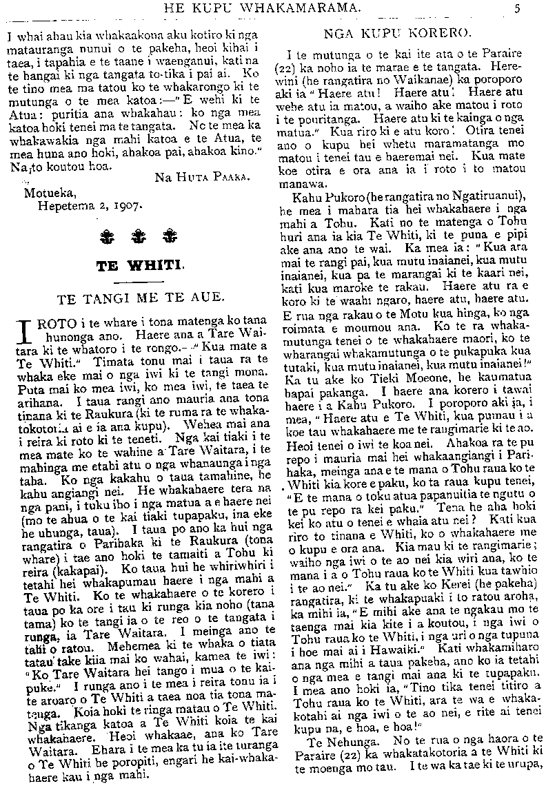 HE KUPU WHAKAMARAMA. I whai ahau kia whakaakona aku kotiro ki nga matauranga nunui o te pakeha, heoi kihai i taea, i tapahia e te taane i waenganui, kati na te hangai ki nga tangata to-tika i pai ai. Ko te tino mea ma tatou ko te whakarongo ki te mutunga o te mea katoa:—" E wehi ki te Atua: puritia ana whakahau: ko nga mea katoa hoki tenei ma te tangata. No te mea ka whakawakia nga mahi katoa e te Atua, te mea huna ano hoki, ahakoa pai, ahakoa kino." Na to koutou hoa. Na HUTA PAAKA. Motueka, Hepetema 2, 1907 TE WHITI. TE TANGI ME TE AUE. I ROTO i te whare i tona matenga ko tana hunonga ano. Haere ana a Tare Wai- tara ki te whatoro i te rongo " Kua mate a Te Whiti." Timata tonu mai i taua ra te whaka eke mai o nga iwi ki te tangi mona. Puta mai ko mea iwi, ko mea iwi, te taea te arihana. I taua rangi ano mauria ana tona tinana ki te Raukura (ki te ruma ra te whaka- tokotoria ai e ia ana kupu). Wehea mai ana i reira ki roto ki te teneti. Nga kai tiaki i te mea mate ko te wahine a Tare Waitara, i te mahinga me etahi atu o nga whanaunga i nga taha. Ko nga kakahu o taua tamahine, he kahu angiangi nei. He whakahaere tera na nga pani, i tuku iho i nga matua a e haere nei (mo te ahua o te kai tiaki tupapaku, ina eke he uhunga, taua). I taua po ano ka hui nga rangatira o Parihaka ki te Raukura (tona whare) i tae ano hoki te tamaiti a Tohu ki reira (kakapai). Ko taua hui he whiriwhiri i tetahi hei whakapumau haere i nga mahi a Te Whiti. Ko te whakahaere o te korero i taua po ka ore i tau ki runga kia noho (tana tama) ko te tangi ia o te reo o te tangata i runga, ia Tare Waitara. I meinga ano te tahi o ratou. Mehemea ki te whaka o tiata tatau take kiia mai ko wahai, kamea te iwi: " Ko Tare Waitara hei tango i mua o te kai- puke." I runga ano i te mea i reira tonu ia i te aroaro o Te Whiti a taea noa tia tona ma- tenga. Koia hoki te ringa matau o Te Whiti. Nga tikanga katoa a Te Whiti koia te kai whakahaere. Heoi whakaae, ana ko Tare Waitara. Ehara i te mea ka tu ia ite turanga o Te Whiti he poropiti, engari he kaiwhaka- haere kau i nga mahi. NGA KUPU KORERO. I te mutunga o te kai ite ata o te Paraire (22) ka noho ia te marae e te tangata. Here- wini (he rangatira no Waikanae) ka poroporo aki ia " Haere atu! Haere atu! Haere atu wehe atu ia matou, a waiho ake matou i roto i te pouritanga. Haere atu ki te kainga o nga matua." Kua riro ki e atu koro! Otira tenei ano o kupu hei whetu maramatanga mo matou i tenei tau e haeremai nei. Kua mate koe otira e ora ana ia i roto i to matou manawa. Kahu Pukoro (he rangatira no Ngatiruanui), he mea i mahara tia hei whakahaere i nga mahi a Tohu. Kati no te matenga o Tohu huri ana ia kia Te Whiti, ki te puna e pipi ake ana ano te wai. Ka mea ia: " Kua ara mai te rangi pai, kua mutu inaianei, kua mutu inaianei, kua pa te marangai ki te kaari nei, kati kua maroke te rakau. Haere atu ra e koro ki te waahi ngaro, haere atu, haere atu. E rua nga rakau o te Motu kua hinga, ko nga roimata e moumou ana. Ko te ra whaka- mutunga tenei o te whakahaere maori, ko te wharangai whakamutunga o te pukapuka kua tutaki, kua mutu inaianei, kua mutu inaianei!" Ka tu ake ko Tieki Moeone, he kaumatua hapai pakanga. I haere ana korero i tawai haere i a Kahu Pukoro. I poroporo aki ia, i mea," Haere atu e Te Whiti, kua pumau i a koe tau whakahaere me te rangimarie ki te ao. Heoi tenei o iwi te koa nei. Ahakoa ra te pu repo i mauria mai hei whakaangiangi i Pari- haka, meinga ana e te mana o Tohu raua ko te Whiti kia kore e paku, kota raua kupu tenei, " E te mana o toku atua papanuitia te ngutu o te pu repo ra kei paku." Tena he aha hoki kei ko atu o tenei e whaia atu nei? Kati kua riro to tinana e Whiti, ko o whakahaere me o kupu e ora ana. Kia mau ki te rangimarie; waiho nga iwi o te ao nei kia wiri ana, ko te mana i a o Tohu raua kote Whiti kua tawhio i te ao nei." Ka tu ake ko Kerei (he pakeha) rangatira, ki te whakapuaki i to ratou aroha, ka mihi ia," E mihi ake ana te ngakau mo te taenga mai kia kite i a koutou, i nga iwi o Tohu raua ko te Whiti, i nga uri o nga tupuna i hoe mai ai i Hawaiki." Kati whakamiharo ana nga mihi a taua pakeha, ano ko ia tetahi o nga mea e tangi mai ana ki te tupapaku. I mea ano hoki ia, "Tino tika tenei titiro a Tohu raua ko te Whiti, ara te wa e whaka- kotahi ai nga iwi o te ao nei, e rite ai tenei kupu na, e hoa, e hoa!" Te Nehunga. No te rua o nga haora o te Paraire (22) ka whakatakotoria a te Whiti ki te moenga mo tau. I te wa ka tae ki te urupa,