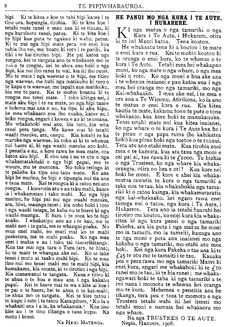 TE PIPIWHARAUROA. hipi. Ki te kitea e koe te tahi hipi kaore i te tino ora, hopungia, tirohia. Ki te kite koe i tetahi mate ranei e mau ana ki te tinana, ki nga huruhuru ranei, patua. Ki te kite koe i to hipi kua puta te ngakau ki waho, patua. Ki te nui nga hipi mate pera me enei kua tuhia iho nei, me hoatu ki roto i te pariki, ka tiki i te kai tirotiro hipi. He pai katoa nga rongoa, kei te tangata ano te whakaaro mo Ie nui o te rongoa, kei te ahua ano hoki o nga hipi, kia nui iho ranei te wai, kia iti iho ranei. Mo te mate i nga waewae o te hipi, me titiro nga waewae, me huhi nga matikuku ki raro o te kapu o te waewae, me tapahi aua matikuku, kia ma te paru. Kei te mohio koutou ki te rongoa mo tenei mate. I toku kainga nei, i mate aku hipi i te na mate, no nga hipi taane e hokona mai ana e au, ka tipu ki aku hipu, he mea whakaaro noa iho naaku, kaore au i hoko rongoa, engari i kawea e au ki te moana. Me whakahoki mai ano, kia toru, kia wha ranei pera tanga. Me kawe mai ki tetahi waahi maroke, ara, onepu. Kia kotahi ra ka maroke nga waewae, ka tuku ai ki te whenua nui haere ai, ki nga waahi maroke ano kohi. I penatia e au, a kore rawa he mea mate, ora katoa aku hipi. E riro ana i au te utu o nga whakamatakitaki o nga hipi papai, mo te wuuru, mo te momona. No toku retinga ki te pakeha ka tipu ano taua mate. Ko ana hipi he marino, he hipi e tipungia nui tia ana e taua mate. Kei te rongoa ki a ratou nei ano rongoa. I korerotia atu e au taku mahi, kaore ia i whakamatau i taku mahi. Ko nga hipi marino, he hipi pai mo nga waahi maroke, ara, hiwi, maunga ranei; kia noho hoki i roto i nga waahi taiapa, he kaha no te haere ki nga waahi maunga. E hara i te mea ko te hipi anake. I whakatipu ano au i te kau, me te mahi ano i te pata, me te whangai poaka. No mua enei mahi, no muri mai ko te mahi peeketera, me te mahi poaka. Ko nga mea enei i mahia e au i toku tai tamarikitanga. Kua tae mai nga taru o Tura (ara, te hina), ko te mate te whangaa ake nei. Ko te take tenei i mutu ai taaku mahi hipi. Ko te mea tino nui mo -tenei mahi mo te mahi hipi, kia kamakama, kia moata, ki te tirotiro i nga hipi. Kia manawanui te tangata. Kaua e titiro ki te ahua o te hoa e mau ana i nga kakahu papai. Kei te haere mai te wa e kite ai koe i te pai o te haere, hei te ahua o te kai-mahi, he ahua mo te tangata. Kei te kite tatou i te kupu i roto i ta tatou Karaipiture, " Ko ia e whakaiti ana i a ia, ka whakanuia." Kua tino kite au i te tino tikanga o taua kupu. Ka mutu i konei. Na HEMI MATENGA. HE PANUI MO NGA KURA I TE AUTE, I HUKARERE. KI nga matua o nga tamariki o nga Kura i Te Aute, i Hukarere, otira ki te iwi Maori katoa. Tena koutou. He whakaatu tena ki a koutou i te mate o enei kura e rua. Kei te mohio koutou ki te oranga o enei kura, ko te whenua o te kura i Te Aute. Tetahi mea hei whakapau moni. ko nga mate o nga whare, o nga mea hoki o roto. Ko nga moni e hua ake ana i te whenua inaianei e pau katoa ana i nga mea hei oranga mo nga tamariki, mo nga Kai-whakaako. I mua ake nei, i te mea e ora ana a Te Wiremu, Atirikona, ko ia ano te matua o enei kura e rua. Kia kitea kautia te mate, kakama tonu te puta o tona whakaaro, kua kore hoki te manukanuka. Tenei tetahi mate nui kua kitea inaianei, ko nga whare o te kura i Te Aute kua he i te pirau o nga papa raina (he kahikatea hoki) kua pirau hoki nga toetoe o te tuanui. Tera atu ano etahi mate. Kua tirohia enei mea e te kamura, kua ata taua nga moni e oti pai ai, tae rawa ki te £1000. Te hiahia o nga Trustees, ko nga whare kia whaka- orangia, otira no hea e oti? Kua kore nei hoki he moni. E kore e ahei kia whaka- mutua rawatia te kura o nga tamariki a taka noa te tau, kia whakahokia nga tama- riki ki o ratou kainga, kia whakamararatia nga kai-whakaako, kei ngaro rawa enei taonga nui o tatou, nga kura i Te Aute, i Hukarere. Tera ano ia tetahi huarahi hei tirotiro ma koutou, ko enei kura kia whaka- ritea ki nga kura penei o nga tamariki Pakeha, ara kia puta i nga matua he moni mo ia tamaiti, mo ia tamaiti, haunga ano ia nga moni e puta ana inaianei mo nga kakahu o nga tamariki, mo etahi atu mea hoki. Kei nga kura Pakeha e tae ana kite £45 te utu mo te tamaiti i te tau. Kauaka pea e pera rawa mo nga tamariki Maori ki enei kura, engari me whakahoki ki te £10 ranei mo te tau, ki te hia ranei; me whaka- ngawari hoki te taha ki nga tamariki a te iwi nana i momotu te whenua hei oranga mo te kura. Mehemea e peneitia ana he tikanga, tera pea e taea te momotu e nga Trustees tetahi wahi iti hei itereti mo tetahi moni e namaia hei whakaora mo nga whare. Na nga TRUSTEES O TE AUTE. Nepia, Hanuere, 1908.