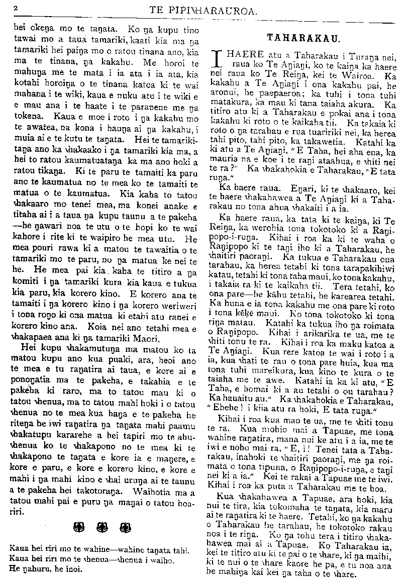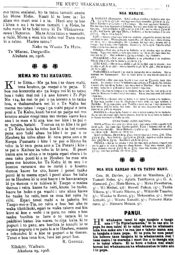 HE KUPU WHAKAMARAMA. Te taenga atu ka tu raua i te taha o te ma- taaho i waho. Ka unuhia ona tarahau, ka kakahuria tona kakahu, ka horoia tona kanohi ki te kaikaha tu ra, ka tiaina ona pare, ka ruia te wai o ona tarahau, ka pokaia—me te kaikaha tii ra ano ki roto—ka mauria ano e ia, ka tae ki te paepae toanga o te tatau, ka tukua iho e ia ona tarahau me tona tokotoko, ka tuturi nga pona, ka matakitaki atu. Ka rawe te iwi rangatira e noho ra, ka oti te whakakakahu ki nga kakahu rangatira, he aurei katoa te here o nga kakahu. Ko Tapuae, he paepaeroa, ko te mahiti ki waho. Kitea te nui o te aurei, o te kuru pounamu ki runga ki te pakihiwi o Tapuae, te here o nga kakahu o te mahiti, me te wahine a Tapuae, he wahine rangatira hoki, he kakahu kiwi te kakahu, me nga kotore huia te rakai ki tahi taha, ki tahi taha, o te mahuna, ko te tiki ki te poho, ko nga tautau tongarerewa ki tahi pakihiwi, ki tahi. Ka mihi mai a Tapuae me te tokomaha, ka pohiri mai ki a raua. Ka whakatika a Taha- rakau, ka mau ki ona tarahau ki tona toko- toko, ka ki ki te hoa kia tomo, no muri ia. Ka tau raua ki te wahi i whakaritea mo raua. Ka kite iho ia i te urunga mona, ka utaina iho e ia ona tarahau me tona tokotoko ki runga, ka noho ia, ka meatia e ia hei pae mona te urunga ra me ona tarahau, kua pai tona noho. Ko Te Angiangi, kei te noho kopiri, huiki i te maku o ona kakahu. Kihai i roa ka puta te kai. Ana, kihai i arikarika. Ka mahi te iwi rangatira ki te taka i te kai, he huahua, he manu, he kiore, he piharau, he tuna, he manu patu hou, he taro, he kumara, me era tu tini o te kai. Ka titiro a Tapuae ki te nui o tana kai, ka rere tana patai tuatahi ki a Taharakau, " E Taha, hua atu nei kia nui te tira kia tau ai?" Ka whaka- hokia e Taharakau, "E nui tira e awhea mai ki aku pureke tarahau." Me te tohu iho ano tona ringa ki ona tarahau. Ka whakaaro a Tapuae ka raru ia i te whaka- hoki a Taharakau. Ka pataitia ano e Tapuae tana patai tuarua, " E Taha, he aha anake nga kai o Turanga?" Ka whakahokia e Taharakau, " He ahi kouka i te ao, He — wahine i te po." Katahi a Tapuae ka mahara kua raru ia i a Taharakau, i te utu o ana patai. Katahi ka kai katoa, ka mutu te kai. Ko te nuinga ia o te kai, tu tonu. Katahi a Tapuae ka rui i nga aurei me nga kuru pounamu whitiki i ona kakahu, ka pataitia tana patai tuatoru," Taharakau he aha tohu o te tanata rangatira?" Ka whakahokia e Taharakau, " He whare maihi tu ki roto ki te pa tuwatawata, he tohu no te rangatira: whare maihi tu ki te wa ki te paenga, he kai na te ahi." He whakahawea mo Taharakau nga patai e toru a Tapuae. He whakanui kau mona kei nga whakahoki a Taharakau, ka iti a Tapuae. Na MOHI TUREI. Na TE ETITA— I tapiritia mai e Mohi Turei ki aua korero mo Taharakau tana kupu awangawanga kei riri te tangata ki te ki tonu o te pepa i ana korero, ki ta matou whakaaro ia e hari te hunga whakaaro nui mo enei korero, mo te marama o te whaka- tako, mo te kaumatua o te kupu hei titiro ma te tamariki e whai nei i nga korero toto a te pa- keha. E whakawhetai ana te Komiti ki te kaha o Mohi Turei ki te tuhi mai i enei korero i runga i tona tuara, i roto i ona mauiuitanga tau- maha, me te inoi ano kia whakamarietia tona ngakau e te Atua o nga whakamarietanga katoa. Me whakamutu pea nga korero o Taharakau i konei ki te kore ano ia he kupu a Ngatikahungunu. Tukua mai he korero hou, ka parekareka t.e tangi o a taua korero ki te hoi o taringa. Kia ora! Kua tae mai te reta a Taite te Tomo o te Mahia, he tata i te kaki o te Etita mo te korenga o ana korero whakahe mo te Momona i taia. E taea hoki te aha, e te tau, i te poto- poto rawa o nga parirau o te manu nei i te titohea o te hua kareao—he moa ianei e ki noa te puku i te ngongonga i te hau moana. Tetahi he maha rawa no a taua korero mo te Momona, kei patua taua e tangata nei e Nikora. Otira taria marietia me kore he ngaru puku ka kokiri ai i to taua tiwai kia hongi ki nga ngaru nunui o Nukutaurua o te kauanga i Waikawa. Kia ora, ano! HE PANUI. KI na hoa kua tukua atu nei he reta kia awhina mai i te mahi hokohoko (Bazaar) kei Turanga, a tenei marama e tu mai nei. I whakaaturia i roto i taua reta, te hawhe o na moni o tana hokohoko ka tukua ma te Hahi Maori, inaianei kua kitea e he ana tenei korero. He koata (¼) o te moni e tukua ma te Hahi Maori ma nga mihinare hoki i oa mou- tere. Ahakoa ka iti te wahi ma te Hahi Maori, me awhina ano tatou i na mahi mihinare, kia awhinatia ai taua e te pakeha; na konei tukua mai na mea kua hiato. Heoi. Na TE KOMITI WHAKAHAERE. Te Kau Kareti; Gisborne. Hepetema 21. 1908