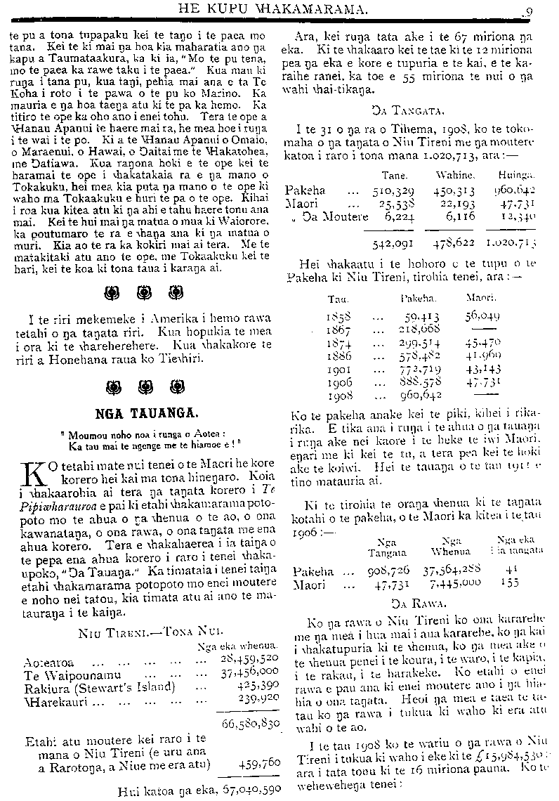 HE KUPU WHAKAMARAMA. te pu a tona tupapaku kei te tango i te paea mo tana. Kei te ki mai na hoa kia maharatia ano na kapu a Taumataakura, ka ki ia, "Mo te pu tena, mo te paea ka rawe taku i te paea." Kua mau ki runa i tana pu, kua tangi, pehia mai ana e ta Te Koha i roto i te pawa o te pu ko Marino. Ka mauria e nga hoa taenga atu ki te pa ka hemo. Ka titiro te ope ka oho ano i enei tohu. Tera te ope a Whanau Apanui te haere mai ra, he mea hoe i runa i te wai i te po. Ki a te Whanau Apanui o Omaio, o Maraenui, o Hawai, o Ngaitai me te Whakatohea, me Ngatiawa. Kua rangona hoki e te ope kei te haramai te ope i whakatakaia ra e na mano o Tokakuku, hei mea kia puta na mano o te ope ki waho ma Tokaakuku e huri te pa o te ope. Kihai i roa kua kitea atu ki na ahi e tahu haere tonu ana mai. Kei te hui mai na matua o mua ki Waiorore, ka poutumaro te ra e whanga ana ki na matua o muri. Kia ao te ra ka kokiri mai ai tera. Me te matakitaki atu ano te ope, me Tokaakuku kei te hari, kei te koa ki tona taua i karanga ai. I te riri mekemeke i Amerika i hemo rawa tetahi o nga tangata riri. Kua hopukia te mea i ora ki te whareherehere. Kua whakakore te riri a Honehana raua ko Tiewhiri. NGA TAUANGA. " Moumou noho noa i runga o Aotea: Ka tau mai te ngenge me te hiamoe e!" KO tetahi mate nui tenei o te Maori he kore korero hei kai ma tona hinengaro. Koia i whakaarohia ai tera nga tangata korero i Te Pipiwharauroa e pai ki etahi whakamarama poto- poto mo te ahua o nga whenua o te ao, o ona kawanatanga, o ona rawa, o ona tangata me ena ahua korero. Tera e whakahaerea i ia tainga o te pepa ena ahua korero i raro i tenei whaka- upoko, " Nga Tauanga." Ka timataia i tenei tainga etahi whakamarama potopoto mo enei moutere e noho nei tatou, kia timata atu ai ano te ma- tauranga i te kainga. Niu TIRENI. TONA Nui. Nga eka whenua. Aotearoa ... ... ... ••• ••• 28, 459,520 Te Waipounamu ... ... ... 37,456, ooo Rakiura (Stewart's Island) ... 425.390 Wharekauri ... ... ... ... ••• 239, 920 Ara, kei runga tata ake i te 67 miriona nga eka. Ki te whakaaro kei te tae ki te 12 miriona pea nga eka e kore e tupuna e te kai, e te ka- raihe ranei, ka toe e 55 miriona te nui o na wahi whai-tikanga. OA TANGATA. I te 31 o nga ra o Tihema, 1908, ko te toko- maha o nga tangata o Niu Tireni me na moutere katoa i raro i tona mana 1.020, 713 ara— Tane.Wahine.Huinga Pakeha ... 510,329 450.3131) 60.64 Maori ... 25, 53822, 19347-731 „ Nga Moutere 6, 2246, 11612, 340 542, 091 478, 622 1.020.713 NiuTireni, tirohiatenei, ara: 111.Pakeha.Maori. 1858... 59-41356, 049 ... 218, 66S 67 74... 299.51445-470 1886... 578.48241.960 01... 77271943,143 1906... 888.57847-731 1908 19080b... 960, 642 Ko te pakeha anake kei te piki. kihei i rika- rika. E tika ana i runa i te ahua o nga tauanga i runga ake nei kaore i te heke te iwi Maori, engari me ki kei te tu, a tera pea kei te hoki ake te koiwi. Hei te tauanga o te tan 1911 e tino matauria ai. Ki te tirohia te oranga whenua ki te tanata kotahi o te pakeha, o te Maori ka kitea i te tau 1906: Nga Nga, Nga; eka Tangata Whenua i ia tangata Pakeha Maori 908, 726 47.731 Whenua 37, 564.288 7, 445,000 41 155 Etahi atu moutere kei raro i te mana o Niu Tireni (e uru ana a Rarotonga, a Niue me era atu) Hui katoa nga eka, 67, 040, 590 NGA RAWA. Ko na rawa o Niu Tireni ko ona kararehe me nga mea i hua mai i aua kararehe, ko nga kai i whakatupuria ki te whenua, ko nga mea ake o te whenua penei i te koura, i te waro, i te kapia, i te rakau, i te harakeke. Ko etahi o enei rawa e pau ana ki enei moutere ano i nga hia- hia o ona tanata. Heoi nga mea e taea te ta- tau ko nga rawa i tukua ki waho ki era atu wahi o te ao. I te tau 1908 ko te wariu o nga rawa o Niu Tireni i tukua ki waho i eke ki te £15,984,530 ara i tata tonu ki te 16 miriona pauna. Ko te- wehewehenga tenei: