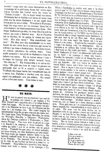 HE KUPU WHAKAMARAMA. PITOPITO KORERO. Tera ano tatou e tirohia mai e etahi karere o te rangi. E rua nga wheturere kei te haere mai kia kite i a tatou. Ko te mea tuatahi na Temepara i kite i te tau 1873 Ko tona roa e ngaro ana e 5 tau. I kitea ano i nga tau 1878, 1894 1899 1904 Hei tenei koanga puta mai ai. Ko tetahi na Ti Arete i kite i te tau 1851. I kitea ano ia i nga tau 1857, 1870, 1877, 1890, 1897. Kaore ia i kitea i te tau 1903, ehara i te mea he korenga nona i puta mai, engari he kino no te wa i puta mai ai. Hei tenei Raumati puta mai ai. Engari tera pea enei whetu e kitea ki Ingarani anake, e kore pea e kitea e tatou. He parekura nui rawa ta te uwira i patu i nga wahi o Ingarani, o Tiamani. I etahi hoia e whakatutu ana ka paoa ratou e te uwira, toko- rima i mate, tekau kaore i mate rawa. Ko te whare mahi parunu a nga hoia kua pakaru i te uwira. Na te uwira i tou nga tainamaiti o tetahi whare mahi tainamaiti o Tiamani, pakaru katoa taua whare. Ko nga tangata ake o roto i taua whare i oma i te timatanga ano o te hiko o te uwira, engari i tae rawa ki te 80 na tanata i tutata ki taua whare i mate. He maha nga hoia i mau i taua uwira e mahi ana i a ratou na mahi, tokorua nga mea i mate rawa, ko etahi i honea. TE RU NUI O ITARI. TETAHI ru nui i pa ki te whenua o I tari i nga ra timatanga o tenei marama. Ko te nui o nga tangata i mate kaore i rite ki to te ru nui o tera tau, engari he nui tonu nga tangata i mate. He maha nga taone i pakaru. Ko te nuinga o nga whare i horo. He maha nga tangata i horoa e nga whare i a ratou ano e moe ana. Titoretore ana nga tiriti. Ko te nuinga o nga tangata kei waho o te taone e noho ana i te wehi kei horoa ano e nga whare. Ko te whare karakia nui o Itari kua pakaru. He whare tawhito rawa tenei, he whare atahua. E kiia ana e nga tangata o Itari ko te take o tenei ru he riri na Haniriuha (he matira tapu) ki a ratou. Ko tenei tangata ko Hani- riuha i whakamatea e te kingi Tiokeretiana. He pihopa taua tangata. Ko tona matenga me etahi kapu e rua, he paepae no ona toto, i kawea ki te whare-karakia o Nepara. Mei te 190 Hepetema, hei nga ra hoki e tupono ai he aitua nui ki te whenua ka mauria haeretia tona matenga me nga toto i te ara, me te whai haere ano te tini o te tangata. Ko etahi ru nui enei i puta mau ki nga wahi e ake nei, me te nui ano o nga tanata i mate: 11 1731—I Pikini, waihi o Haina, 138, 000 na tanata i mate. 1763— I Hipania, me Moroko i Awherika, 62, 000 i mate. 1797—I Panama, wahi o Amerika, 40.000 i mate. 1822—I Arepo, wahi o Amerika, 20, 000 i mate. 1851—I Itari, 14, 000 i mate. 1856—I Moruka, 3000 i mate. 1875—I Hipani, 14.000 i mate. 1881—I Itari, 2000 i mate. 1885—I Inia, 3081 i mate. 1886—I Tarawera, 101 i mate. 1893—I Pahia, 12, 000 i mate. 1896—I Tiapani, 1000 i mate i te ru. e 20, 000 i hurihia e te moana, kotahi te taone i tino ngaro. 1902—I Hana Pia, he moutere kei Amerika e 30, 000 i mate. 1904—I Inia, 10,OOO i mate. 1905—I Itari, e 5000 i mate. 1906—I Hanaparanahiko. taone o Amerika, 5000 i mate. 1909—1 Mehina, wahi o Itari, i waenganui o te 50.000 me te 100, 000 i mate. Hui katoa na tanata i mate i enei ru nunui i tata ki te 480, 582. HE TOA. I ROTO i nga nupepa e haere ana te kauna o Mokomoko i Opotiki. No Opotiki tenei tangata e haere ana ki Torere i runga i tona poti mihini, he hoa ano ona. Kaore i roa rawa to ratou haere ka kino te moana, ka pakaru hoki tona mihini, ka pae noa ratou i te moana, kaore hoki e taea te pakuru te mahi. Ka rere a Mokomoko ki te moana ka kau ki uta, ko- tahi maero te roa o tona kaunga i roto i te ngaru. Te una atu ki uta ka haere ki te taone ki te tiki i te tima iti hei tiki i ona hoa kua mahue atu ra ki te moana. No te korenga o te tima i ahei te haere ka tikina e ia ko tetahi o nga poti weera me na tanata ano hei hoe ka haere ratou ki te tiki i tona poti. He mea tino mahi nui ka tae mai ratou ki uta. Ki te titiro atu a na tangata o utu e kore rawa ratou e tae mai, otira na te kaha, na te mohio hoki ka tae mai. He tino toa tenei, e tika ana kia korerotia. NGA HUA KAREAO MA TA TATOU MANU. Raniera Mitingare 5 Miss Brereton 5 Te Tuhi I 10 Wi Hunia; , 5-; Tione Kere. 5-; Rev. T. Paerata A. H Turnbull. 5 -; Rameka IE Waikerepuru 10 W. Puna 5 -
