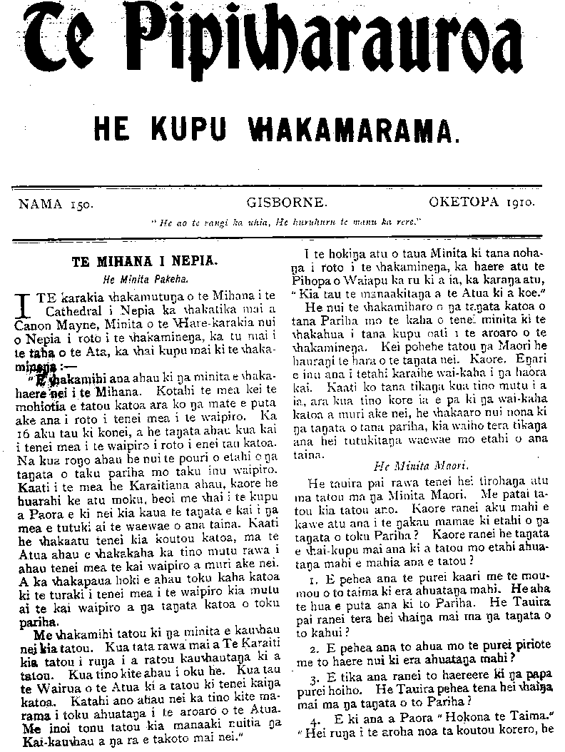 HE KUPU WHAKAMARAMA. TE HUI O TE HAHI MAORI O TE ATIRI- KONATANGA O WAIAPU I TU KI KA- WAKAWA, MAEHE 1910. OA MOTINI. 1, I whakaritea a Rev. R. T. M. Kohere hei kai-tuhituhi i nga mahi a te Hui. I whakaurua enei tangata ki te Hui kia puta ai a ratou korero:— Wi Takeke, Horomona Paipa, Pita Pokia, Hare Haupapa, Horomona Te Hui, Hohepa Waiheke, Hori Mahue, Wi Houkamau, Rev. F. C. Long. 1. Na Hori Tohungia raua ko Rev. Nikora Tautau: " He mihi tenei na tenei Hui mo te whai- korero a te Pihopa, he mea atu hoki kia tukua tenei whai-korero ki roto ki nga mahi a te Hui o te Hahi." Whakaaetia ana. 3. Na Wiremu R. . Kerehi raua ko Hakopa Haerewa: " Kia puta te kupu a tenei hui ki te Komiti ki Tuparoa, kia whakaputa i nga moni a Apera- hama Tamihere i runga i nga mahi o te whare minita me nga taiepa o te kainga o te hahi i Tuparoa." Whakaaetia ana. 4. Na Rev. Nikora Tautau raua ko Rev. Ahipene Rangi: " He mihi na tenei Hui kia Pihopa Renata Wiremu, ka oti nei te wehe atu e tena koroua- tanga. He whakawhetai hoki ki te Atua, mo tana whakaritenga ia Aweriri hei pihopa tuawha mo Waiapu." Whakaaetia ana. 5. Na Rev. Nikora Tautau raua ko Paratene Ngata: " He tono tenei na te Hui ki te Minita Maori kia whakamaoritia te ture marena me nga take hoki o te Rehita Maori kia marama ai." Whakaaetia ana. 6. He patai na Rev. Nikora Tautau: "E taea ranei te whakamaori i nga raihana marena a te Pihopa ka tukutuku ai kia minita kia Minita Maori?" I utua e te Tumuaki: " E taea ano. Maku e whakarite." 7. He patai ki te Upoko o te Hu; na Rev. Nikora Tautau: "He pewhea te rereketanga o te raihana ma- rena a te Kawanatanga i ta te Pihopa?" I utua e te Tumuaki: " Ko ta te Hahi tikanga kia matua karangatia i nga Ratapu e toru katahi ka marenatia. Ko te Raihana a te Pihopa, he tikanga e watea ai te tangata i te karanga-marena. He mea mau tonu ta te Hahi Marena. Ko te Raihana a te Kawanatanga he mea whakarite e te paremata mo te pakeha kia kaua ia e marenatia i te mea kahore ano kia tukua te Raihana e te Kai Rehita." 8. He patai na Rev. Nikora Tautau: " He aha te take i kia ai ta te pakeha hui he Hinota, ko ta te Maori he hui, he poari hoki no te Hahi?" I utua e te tumuaki: " Ko te Hinota te hui hei whakahaere i na mea o te Hahi puta noa te Pihopatanga katoa. Kota te Hui 11 te Hahi Maori he whakahaere i na mea mo te taha Maori tona takiwa anake." 9. Na Rev. Nikora Tautau raua ko Rev. Ahipene Rangi " He whakaatu tenei na tenei Hui i te nui o te pouri o te aroha i te weranga o te whare-karakia nui i Manutuke; a he whakaatu hoki i te koa mo te rongo , e whakaorangia ana taua whare." Whakaaetia ana. 10. Na Hirai Ngahue raua ko Wiremu R. Kerehi: " Kia whakaurua te tikanga ate Hahi Pakeha e hoatu nei i na ohaoha o te Ra Aranga hei whakaaro ki te minita o te Pariha, ki rotu i te Hahi Maori, i te mea he tikanga pai tenei hei whakamahara i te pariha kei a ratou ano te oranga mo to ratou minita, hei huarahi hoki hei whakaputanga i te aroha." Whakaaetia ana. 11. He patai na Rev. R. T. Kohere: " He patai ki te Tumuaki ki tona whakaaro mo te whakawhetai i na wahine he mea marena raihana nei ki te tuku hoki i na tangata pera ki te Hapa a te Ariki." 1 utua e te Pihopa: " I te mea kua pa te manaaki a te Hahi ki marena, e tau ana te wahine kia pa ki te Hapa a te Ariki, kia whakaputaina tona whakawhetai