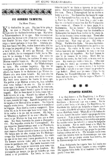 HE KUPU WHAKAMARAMA. HE KORERO TAWHITO. Na MOHI TUREI. KA whakatika te 400. Ka tae ki te pito o te one o Hariki ki Waikanae. Te whitinga atu ka whakatakototia te ope. Ka tohu a Taumataakura ki te ope. Kia manawanui tera pea ka homai e te Atua nui o te ao katoa tou hoariri ki tou ringa i tenei ra, e mau ai te rongo o tenei pakanga o mua iho. Ahakoa pu- hia koe kana hei oho, maku koe e tohu kia tu ki runga ka pupuhi ai i to pu. Ka tu na Matua a tera ki te one. E toru nga Matua. Ko to uta i kokiri, ko to waenganui i hoki, ko te Ma- tua ki te moana i hoki rawa. Ka rawe te haramai o nga Matua, he wahine ki mua o nga Matua manihi haere ai. Ka oti te rakai rawa he mere Paraoa ki te ringa. Ko Whakahatapu te ingoa. He wahine rangatira. Ka tae ki waenganui o te one ka whakatika a Taumata- akura ka haere ki te whakatau i na Matua ra. Haere atu ana tona kotahi. Ka tata atu ka haea e ia te one, i uta puta noa ki te moana. Ka huri tona aroaro ka haere ki taua ope. Ka puhia e nga Matua e toru ra, kua takahia mai tona haenga i te one ra. Ka tu etahi o tona ope i te mata, ki te poho, ki te waewae, ki te pakihiwi, engari kaore i ngoto ki roto o te tangata. Kei te mau tenei ki tona mate kei te kohi ki roto ki a ia. Katahi ka tahuri a Tau- mataakura ka tangi tona pu. Kotahi tangohanga ki raro, kotahi ki runga. Katahi ka puhia e ia ki te tangata o te Matua ki te moana. Ka hinga te tangata mate rawa. Kua kitea mai e waenganui te hinganga. Kua whati a muri a waenganui. Kua tohu iho a ia ki tona ope kua tu ki runga. Kua ki te waha o te pu me te umere. Ka hinga a te Whanau-a-Apanui ki te one i Hariki. Ko muri o nga Matua ra kua aua noa atu e whati ana. Ka whaia haeretia ka mate a Rangipatu- riri. Ka hopukia oratia ko Tuteranginoti. Ko na rangatira whakamutunga enei o te Parekura. Ka kiia e Taumataakura kia mutu te whai, mei mate a Tuteranginoti e kore e mutu te whai. He heipu ano ki ona matua kia Te Hokopu- orongo kia Iromahora kia Kainamu. Ka mahi te ope ki te hari mai i tona parekura ki te pa. Te korero tuturu nuku ake i te rua rau ma rima te parekura nei. Ka haria katoatia mai ki te pa Ka hanga te tarewata ana tona roa. Ka whakawhataina ki runga o nga huahua Ka purangatia nga taonga, nga pu nga kakahu na mea katoa o te parekura. Ka kana te rua, rite tonu te roa ki te whata e tarewa ra nga tupa- paku. Kei te matakitaki a Tokakuku e tarewa atu ana. Tera a Tuteranginoti kei te mohio a kore ia e ora. Ka whakatika ka haere ki runga ia Te Kaniatakirau kia ora ai ia. Ka pana e te Kani ka ki atu. " E kore koe e ora i a au. Kaore o koha ki to taua hoa kia Te Waipauhu nau i mate ai. Haere ki to taua papa ki a Kakatarau. Ko au kaore." Ka whakatika ia ka haere atu. Te kitenga mai ka whakatika a Kakatarau ka haere kua mohio ia ka mate ia. Ka tu ka timata i tona waiata tangi. Tenei ake tona waiata. Te tino omanga i roto i na mano e takoto nei. Kua tangi nga pu. Ka riria e Piripi. Ka kiia kia whaia. Ka mau ka whaka- turia ki te taha o te Hutukawa ka puhia e na pu katoa. Ka maka ia ki roto o te rua, ka tukua katoatia na tupapaku ki roto o te rua me nga taonga ka tapukea. Ka huri katoa te ope ki te moana ki te ruku. Muri iho ka karakia ka mutu, ka kai hoki, o te ata mai ra ano. Ka mutu na mahi o tena ra. Oho ake i te ata, ka mutu na raruraru ka whakatu ia tangata, ia tangata i o ratou mata. i te korenga ano hoki o tetahi o te ope i hina i te parekura i nga kokiri. Heoi ano na mea i hinga, ko te Parata, ko Tamakihikurangi me Marino. E mau nei ano te ingoa. " Ko te tunga o Marino" i te pu a te Koha. PITOPITO KORERO. I te whai-korero a Te Rangihiroa i te Pare- mata i whakaritea e ia a te Mahi ki na kuia whaiwhaia o Koterangi i na wa o mua. Ko te mahi a enei kuia, e ki ana a Te Rangihiroa he whaiwhaia kia tahuri na kaipuke e haere ana i te moana kia whiwhi ai ratou i nga taonga. Ko ta ratou whaiwhaia tenei: Whakaki ai i te kohua ki te wai, katahi ka tuku i etahi nga pupu ki roto manu ai. I na pupu e manu ana ka anga ratou ki te karakia ki a totohu, ki te totohu aua pupu ka mohio ratou ka tahuri i a ratou he kaipuke ki te moana. Ko te mahi tenei a te Mahi he whaiwhaia i te Kawanatanga. Ko tona kohua ko te whare o raro, ko aua ana pupu ku nga take huhua e titoa nei e ia. He karakia tonu tona mahi kia totohu tahi te Kawanatanga me ona pupu, kati ko nga pupu anake kua totohu, ko te Kawanatanga kei te haere tonu. Kua whakaturia he tanata hou hei meia mo Ranana. Kaore tenei tangata e unu waipiro. He tanata kaha hoki ki te tautoko i te tikanga peehi i taua kai.