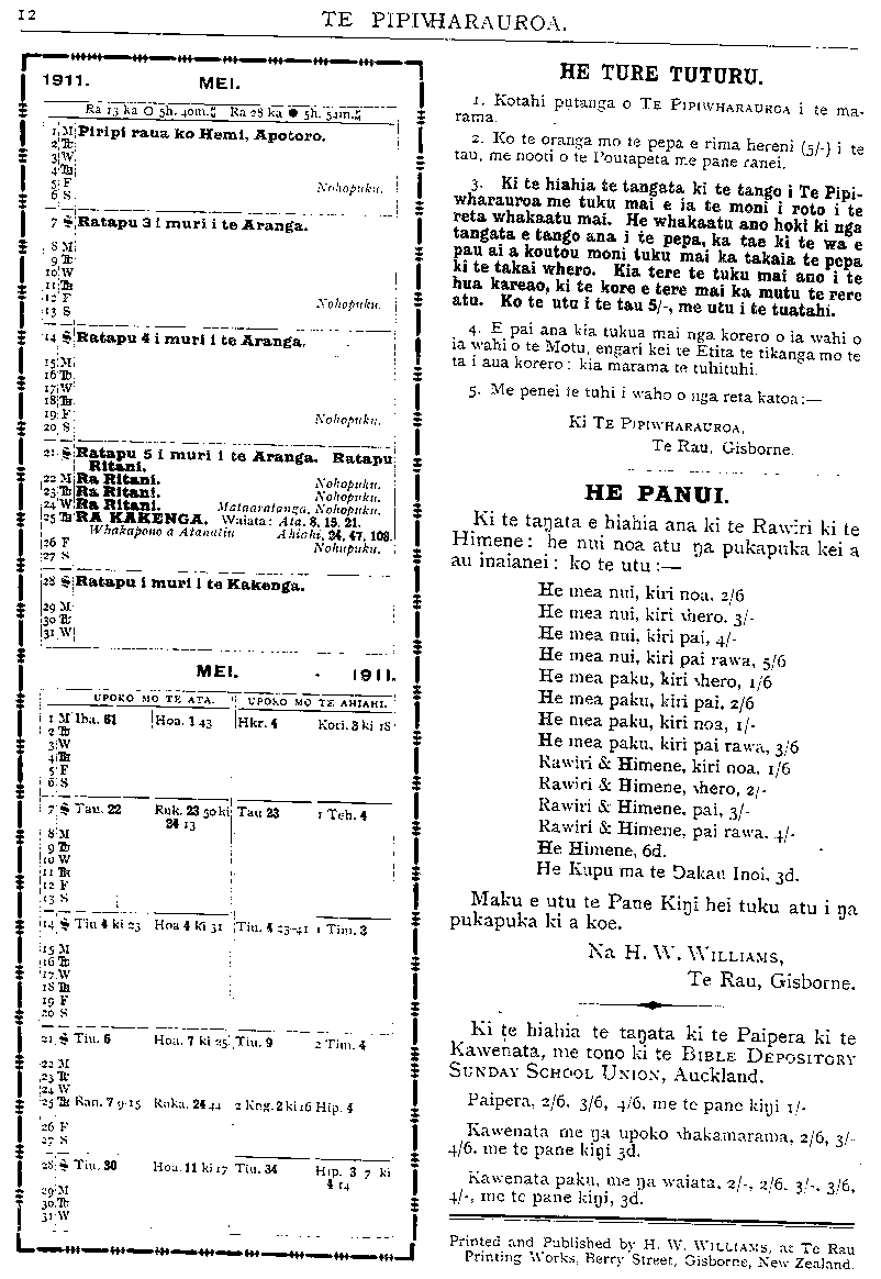 TE PIPIWHARAUROA. HE TURE TUTURU. 1. Kotahi putanga o TE PIPIWHARAUROA i te ma- rama. 2. Ko te oranga mo te pepa e rima hereni (5/-) i te tau, me nooti o te Poutapeta me pane ranei, auaka i te tiaki he pane kingi hepene nga pane e tino hiahiatia ana. 3. Ki te pau nga hereni a tetahi tangata i tuku mai ai ka tukua atu he kaute. Ki te tae atu te kaute kia hohoro te tuku mai i te moni, na te moni hoki i puta atu ai te pepa ehara i te mea tupu noa. 4. E pai ana kia tukua mai nga korero o ia wahi o ia wahi o te Motu, engari kei te Etita te tikanga mo te ta i aua korero : kia marama te tuhituhi. 5. Me penei te tuhi i waho o nga reta katoa: — Ki TE PIPIWHARAUROA, Te Rau, Gisborne. HE PANUI Ki te tangata e hiahia ana ki te Rawiri ki te Himene : he nui noa atu nga pukapuka kei a au inaianei : ko te utu : — He mea nui, kin noa ... 2/6 He mea nui, kiri wher ... 3/- He mea nui, kiri pai ... 4/— He mea nui kiri pai rawa ... 5/6 H e mea paku, kiri whero ... 1/6 H e mea paku, kiri pai . . . 2/6 He mea paku, kiri noa ... 1/- He mea paku, kiri pai rawa 3/6 Rawiri & Himene, kiri noa 1/6 Rawiri & Himene, whero ... 2/- Rawiri & Himene, pai ... 3/- Rawiri & Himene, pai rawa 4/- He Himene ... ... -/6 Maku e utu te Pane Kingi hei tuku atu i nga pukapuka ki a koe. Na H. W. WILLIAMS, Te Rau, Gisborne. Ki te hiahia te tangata ki te Paipera ki te, Kawenata, me tono ki te BIBLE DEPOSITORY SUNDAY SCHOOL UNION, Auckland. Paipera, 2/6, 3/6, 4/6, me te pane kingi //- Kawenata me nga upoko whakamarama 2/6 3/- 4/6, me te pane kingi 3d. Kawenata paku, me nga waiata 2/-, 2/6, 3/-, 3/6, 4/-, me te pane kingi, 3d. Printed and Published by H. W. WILLIAMS, at Te Rau Printing Works, Berry Street, Gisborne, New Zealand.
