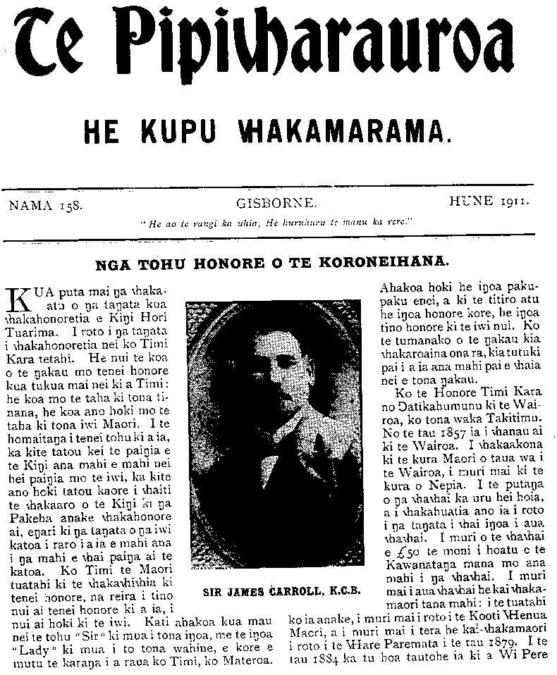 Te Pipiwharauroa HE KUPU WHAKAMARAMA. NAMA 158. GISBORNE. " He ao te rangi ka uhia, He huruhuru te manu ka rere." HUNE 1911. NGA TOHU HONORE O TE KORONEIHANA. KUA puta mai nga whaka- atu o nga tangata kua whakahonoretia e Kingi Hori Tuarima. I roto i nga tangata i whakahonoretia nei ko Timi Kara tetahi. He nui te koa o te ngakau mo tenei honore kua tukua mai nei ki a Timi: he koa mo te taha ki tona ti- nana, he koa ano hoki mo te taha ki tona iwi Maori. I te homaitanga i tenei tohu ki a ia, ka kite tatou kei te paingia e te Kingi ana mahi e mahi nei hei paingia mo te iwi, ka kite ano hoki tatou kaore i whaiti te whakaaro o te Kingi ki nga Pakeha anake whakahonore ai, engari ki nga tangata o nga iwi katoa i raro i aia e mahi ana i nga mahi e whai painga ai te katoa. Ko Timi te Maori tuatahi ki te whakawhiwhia ki tenei honore, na reira i tino nui ai tenei honore ki a ia, i nui ai hoki ki te iwi. Kati ahakoa kua mau SIR JAMES CARROLL, K.C.B. Ahakoa hoki he ingoa paku- paku enei, a ki te titiro atu he ingoa honore kore, he ingoa tino honore ki te iwi nui. Ko te tumanako o te ngakau kia whakaroaina ona ra, kia tutuki pai i a ia ana mahi pai e whaia nei e tona ngakau. Ko te Honore Timi Kara no Ngatikahungunu ki te Wai- roa, ko tona waka Takitimu. No te tau 1857 ia i whanau ai ki te Wairoa. I whakaakona ki te kura Maori o taua wa i te Wairoa, i muri mai ki te kura o Nepia. I te putanga o nga whawhai ka uru hei hoia, a i whakahuatia ano ia i roto i nga tangata i whai ingoa i aua whawhai. I muri o te whawhai e Ł50 te moni i hoatu e te Kawanatanga mana mo ana mahi i nga whawhai. I muri mai i aua whawhai he kaiwhaka- maori tana mahi: i te tuatahi ko ia anake, i muri mai i roto i te Kooti Whenua nei te tohu "Sir" ki mua i tona ingoa, me te ingoa Maori, a i muri mai i tera he kai-whakamaori "Lady" ki mua i to tona wahine, e kore e i roto i te Whare Paremata i te tau 1879; I te mutu te karanga i a raua ko Timi, ko Materoa. tau 1884 ka tu hoa tautohe ia ki a Wi Pere