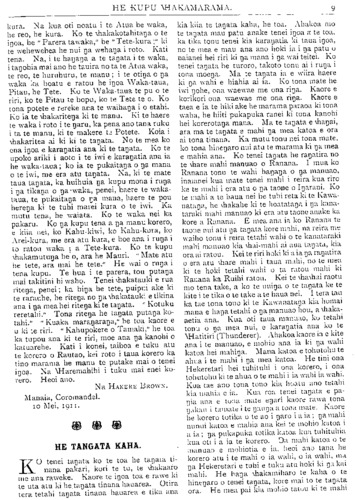 HE KUPU WHAKAMARAMA. Pihopa whakaaro rangatira o Akarana ratou ko ona minita i kaha nei ki te whakahaere i te tikanga whakaora i tenei tamaiti. NGA NUPEPA HOU. TENEI ta tatou mokai te whakarongo ake nei ki etahi reo hou e hau mai nei i runga o Rangitoto; whakatoriki ana mai te tangi o te reo. Na te reo tamariki pea, engari ko o raua ingoa he ingoa wehi anake—ko Matakokiri Taima raua ko Tawhirimatea Taima. Tera pea kua tata etahi mea whakamihari ina hoki i puta enei tohu, kati ra me waiho ma te wa e titiro. To raua ahua he tuakana he teina, he mahanga. Engari ki te whakaatu mai a nga kaumatua ko Ranginui to raua papa, i tenei wa kua hurihia ko " Taima," inahoki kua karangatia ko Matakokiri Taima raua ko Tawhirimatea Taima. Kaua hei pouri e nga teina i roto i te mahi kotahi mo enei kupu a to korua tuakana, ahakoa he manu noa ia, a ko korua he mea nunui no te rangi. E mea atu ana to korua tuakana i tona pouri mo ta korua whakahauatanga i o korua ngoa nunui, ingoa whakawehi, ki te ingoa na ki a " Taima." E whakaaro ana ia te waiho noa ai korua i a Matakokiri raua ko Tawhiri- matea—he ingoa nunui anake, he ingoa pai, he ingoa reka ki te taringa Maori, tena ka tapiritia nei ki te " Taima" ka reka kino. He kupu atu na to korua tuakana i te mea kei te roharoha tonu korua i o korua pakau, kia titiro iho ano ki o korua ingoa, ka mau ki nga mea roreka ki nga taringa Maori. He mahi pai he mahi uaua tenei kua karangatia nei korua, na reira kia kaha: e mau ki te kupu whakatane kia kaha. Ka nui te whenua hei rerenga mo tatou, ka nui te hua o te kakano o te ngahere e tu nei hei oranga mo tatou katoa. He mihi tonu ake ki a korua i koroki atu te manu nei. Ko korua nga waewae takataka, kati ko to korua tuakana hei waewae takawhe. Kia ora. TAHI KAKA. Ki te Etita o Te Pipiwharauroa. EHOA utaina atu enei kupu ki runga i nga parirau o ta tatou manu, kia kite mai o taua hoa. No te 21 o Hune ka taronatia a Tahi Kaka ki Akarana. I tonoa atu kia aro- hatia mai e te Pirimia kia tukua mai te tinana ki te kainga, kihai i whakaaetia e te Ture. He mahara pea no o tatou matua o te Ture kei huhua ake he mahara. E kore hoki e pena inaianei. Ka kohuru ko Maketu i te Maori me na Pakeha ka tukua pahia e o matou ma- tua kia taronatia; ka tonoa atu me tuku iho te tinana, aetia ana: kei konei e tanu ana. I pitihana a te Pihopa ratou ko ona hoa toko- maha kia ora a Tahi Kaka, ki te whare here- here noho ai a mate noa; i tae te kupu ki a Ngapuhi kia tautokona taua pitihana. He mea waea e matou ki te Pirimia Awhina. Ko te utu mai a te Pirimia Awhina he patai, " He kohuru pai ranei ta Tahi Kaka ki a koe, kino ranei?" Ko taku utu tenei, " Ko te kohuru kino tena, marama hoki, i te mea nana ano i whakaatu." Heoi ano ra te utu mo te patai. Na R. T. TE RURU. TE KAPOREIHANA. KI a Hon. A. T. Ngata, minita mo nga Kaunihera. E hoa, tena koe, me te iwi hoki i raro i te maru kotahi o te runga-rawa me te mana hou o enei ra, e hui nei kia kotahi te ao katoa ki tona hopuatanga, ka huri te mauatu ko nga mate e kaingakautia nei e o taua koroua: e, ka pu nga mihi, ka rupeke nga tangi mo te hunga ka poto ki te po. Koia te mihi mo tatou o hoa rangatira, nga pou tangata o kona, o konei: haere ki te kai-hanga i te rangi i te waahi tiketike: haere ki te timatanga, me te mutunga: kati mo ratou. Ka huri tenei mo nga wa e takota mai nei: kua mutu te ao tawhito, he ao hou tenei, he hou nga mahi. Ko koe, te wana, i tupu ake i tenei ra, me te rangi mane, me te rongomau. Koia aku iwi i hiahia ai kia tupeke atu ratou ki te tiriwa o te Uranga o te ra. I penei ai to ratou hiahia he haumai no te rongo i te nui o to mahi ki te tiaki i to whenua, me te iwi, ki te ahuwhenua, e mahi mai nei a Ngatiporou. Koia nei te iwi matamua o te iwi Maori kua rewa i nga ngaru tuatea o te moana nui o Kiwa. Heoi. Ko aku hapu kua tomo ki te mate i te kore whakaeanga mo ratou, okioki mai ana kia tiro- hia he huarahi, kitea ake, ko te tango i te whaka- topu i te iwi hei Kaporeihana. Kua paahitia e te Kooti Whenua Maori kei te 24 Tihema, 1910, ka tu te hui ki Te Koura reriwe teihana. Oa poraka ko Rangitoto Tuhua No. 66A me Rangitoto Tuhua No. Z4, tekiona 6. Ko te maha o nga eka, 15, 000. Koia tenei te morehu whenua i toe i te wa o te Komihana i to korua taenga mai ra ki Te Kuiti me Otorohanga. No reira matou i mahara ai hei mahi ahuwhenua ma matou enei, kua nui hoki ma te Komihana.