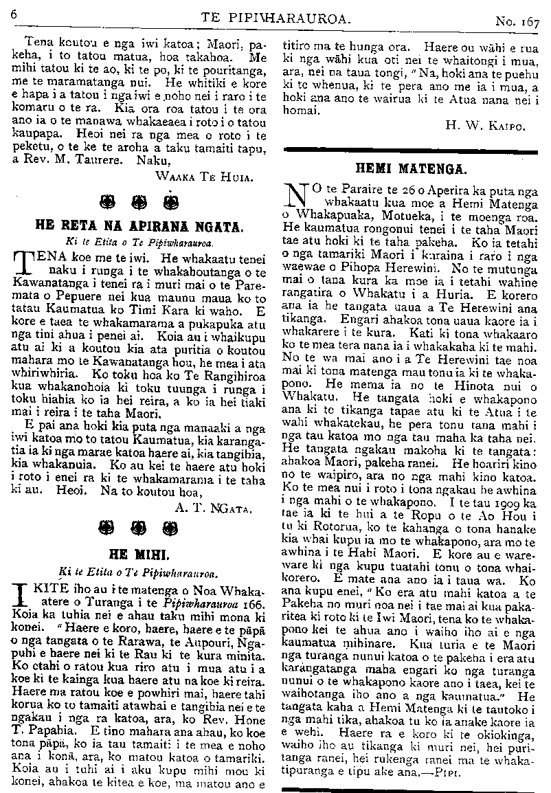 No.167. HE KUPU WHAKAMARAMA. Whakararanui. Auina ake i te tau tuatahi nui atu te makuru o te kumara. Koia tenei whakatauki, " Ka taia te riu o Horouta ki Waiapu te taea te opeope;" te rua," Ka mahi nga marua a te Pui-paraheka." E hoa ma ko ahau no runga i a Matatua, i haere mai ki tenei wahi ki te whakairo i nga rakau mo te whare karakia o Manutuke. Heoi kia ora a te Whatahoro me Whanganui katoa. • TE TUHI PIHOPA. Manutuke. 27 Aperira, 1912. [Ko nga kupu a Te Tuhi Pihopa e mau ake nei he whakaatu nana i tenei waka i a Horouta he waka motuhake tonu. Tera hoki etahi tangata i kuraia ki nga korero tawhito kei te ki he waka kotahi tonu a Horouta raua ko Takitimu. Ki a ratou whakamarama ko Ho- routa te ingoa o te waka i Hawaiki: he tere no, taua waka ki te rere i te wa tonu atu i Hawaiki ka kiia ko Horouta. No te taenga mai o taua waka ki Niu Tireni nei ka kiia ko Takitimu. No te korenga nei o Horouta i whakaingoatia i te hui i Whanganui ka whaka- aro a Te Tuhi Pihopa koia ano kei te pupuri nga kai-whakahaere o taua hui i taua whaka- akoranga e ki nei he kotahi tonu a Takitimu raua ko Horouta. He korero pai tenei hei whakaputanga ma nga morehu kaumatua e toe nei inaianei i nga korero mo enei waka e rua. Me whakaatu mai he waka kotahi ranei enei, he waka wehe ke tonu ranei tetahi i tetahi. Ko te nuinga ia o nga korero mo enei waka me te mea nei he waka kotahi. Me waiho i konei ma nga morehu kaumatua e korero.—ETITA.] TE REV. HONE PAPAHIA. HE PEKETUA. Ki te Etita o Te Pipiwharauroa. TE ohaki a te hunga kua moe i roto i te ariki. Hei peketua mo ta M. Taurere. E manu, panuitia ano enei aronga mihi ki te ao katoa. He aroharoha hoki, te rapurapu nei. He huahua riringi no te hinehimengaro. Ma te puna aroha e whakaoti atu. I tangohia te manawa-ora o H. Papahia i te 9 o Pepuere ki roto ki te whare o tana potiki o Kahi Tipene. Koia nei hoki te whakakapi mona mo te taha tangata. No te Mane, 12 o nga ra, ka tutuki to matou nei tira, a no muri rawa o te tena ka hiiratia te rua o nga kawhena, to waho. No tenei ra tonu, ka tatu nga whakaaro o te katoa, penei na, ko tenei tupapaku me mau atu ki Whangape, ara, ki te toma tapu. Ko te tapu nui tera o ana tupuna matua. Ko taua tapu, ko te kainga tera o Oneoneone raua ko tana hoa-aroha, ko Rehu. Ka oti nei. me tapuke a H. Papahia, ki Waiparera Tapu i Hokianga nei. Ki te whare karakia a tawhito o Rev. Piripi Patiki. Ko te whaea hoki o H. Papahia kei konei e tapuke ana. No te aonga ake i te Turei, ka rere te ra, ka tae mai a te Hokena raua ko Hone Wi Kaipo. Ka ao i te Wenerei ka mauria te tupapaku ma runga tima Ranihi. Kei te 3 ki te 4 maero te roa o taua Waiparera. He maha ma nga ranihi, he nui hoki ma runga hoiho. Tae atu ki ro whare karakia, ka rite ka puta ki waho ki te poka pai ana tera tona tukunga atu ki te oneone. Na tona papa i panga te nehu mutunga mona na Herewini Te Toko. He nui te tangihanga mona, e kore e warewaretia tona komaru kua mahue iho nei ki muri nei. E nga iwi i tino matua ki tenei tangata, tangihia a wairuatia mai te kumuri hauraro, e pupuhi atu nei i runga o Hokianga whaka- pau karakia. I a Niwa, i a Araiteuru, i a Te Ponatu e moe nei a te mutunga ra ano o te ao. Aotearoa me te Waipounamu, Whare- kauri, me nga tini Moutere o waenga Moana Nui o Kiwa," tangihia mai to tatou whanau- nga o te wahi ki te kikokiko, to tatou matua- tapu o te wahi ki te whakapono karaitiana. Koianei hoki tetahi o nga tangata tin haere i te Rongopai Tapu. Ko tenei tangata kaore e ngaro ki te kuare, tona tu, tona haere, tona reo, me tona ahua. Kua ngaro nei ia i o tatou tirohanga. Haere atu taku teina, haere taku matua tapu, "Toku tikitiki whakamanamana, o iwi nui, o iwi mano, o iwi whakatangitangi oriori nei e ha,! tangi ou iwi i mahue nei." Haere ki te okiokinga i tua o te Arai. Ma nga Tai o Huarau taua e whakatutataki aianei ake tonu atu, amine. " Tenei nga iwi te ru nei, te paro nei, te whaka- aro rangi nei," mou kua ngaro. E mea ana te kupu a to taua tupuna a Tamariki: "Whaka- mori kau ana nga tai o Wharoo ka ngaro a Toakai." Whakamori kau ana nga tai o Ho- kianga ka ngaro a Papahia. "Tu noa ana nga turanga i Kaitu ka ngaro a Ririhape-Nui- a-Tau." Penei ano hoki mou kua ngaro nei: " He pupu ano to roto, he pupu ano to waho, whakaruru whakawawe, ko koe ano ko ahau, a te miriniuma." Haere atu Papahia hoatu ki te wahi e ngaro nei i te whatu pango o te kanohi, mangu nei, ara, tou wairua whaka- anga,. He nui te ruihi ou iwi mou kua kore nei e puta tinana atu ki o ratou marae maha.