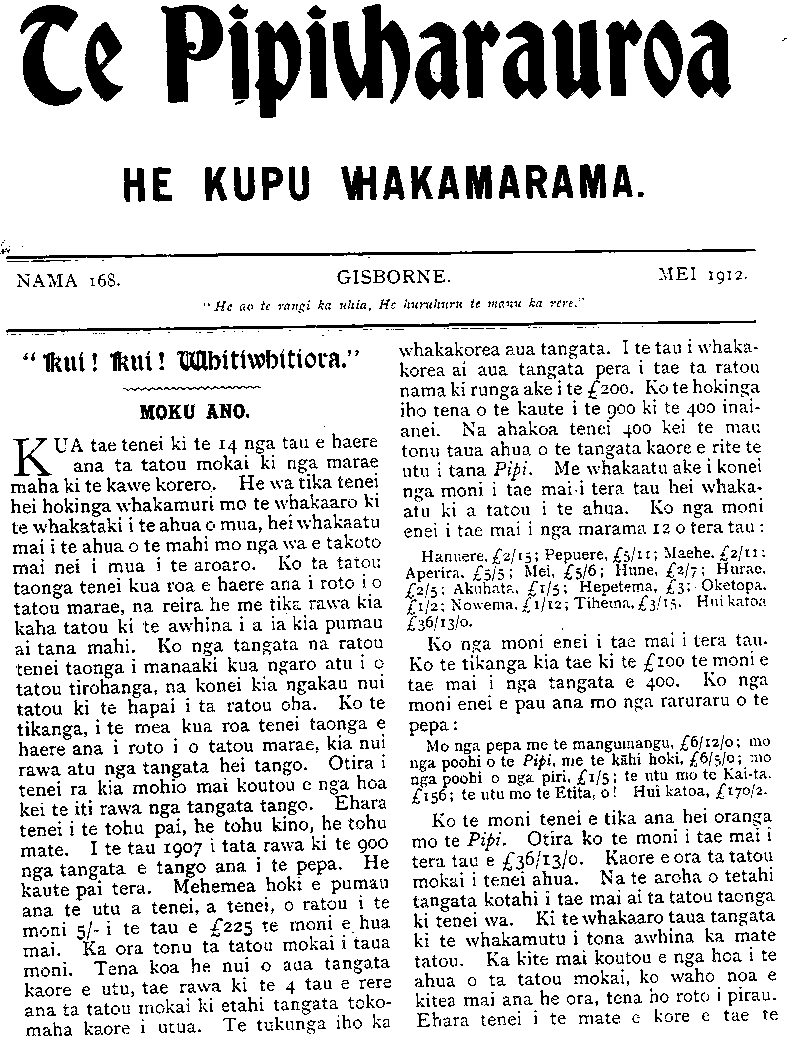 Te Pipiwharauroa HE KUPU WHAKAMARAMA. NAMA 168. GISBORNE. "He ao te rangi ka uhia. He huruhuru te manu ka rere. MEI 1912. "Kui! Kui! Whitiora." MOKU ANO. KUA tae tenei ki te 14 nga tau e haere ana ta tatou mokai ki nga marae maha ki te kawe korero. He wa tika tenei hei hokinga whakamuri mo te whakaaro ki te whakataki i te ahua o mua, hei whakaatu mai i te ahua o te mahi mo nga wa e takoto mai nei i mua i te aroaro. Ko ta tatou taonga tenei kua roa e haere ana i roto i o tatou marae, na reira he me tika rawa kia kaha tatou ki te awhina i a ia kia pumau ai tana mahi. Ko nga tangata na ratou tenei taonga i manaaki kua ngaro atu i o tatou tirohanga, na konei kia ngakau nui tatou ki te hapai i ta ratou oha. Ko te tikanga, i te mea kua roa tenei taonga e haere ana i roto i o tatou marae, kia nui rawa atu nga tangata hei tango. Otira tenei ra kia mohio mai koutou e nga hoa kei te iti rawa nga tangata tango. Ehara tenei i te tohu pai, he tohu kino, he tohu mate. I te tau 1907 i tata rawa ki te 900 nga tangata e tango ana i te pepa. He kaute pai tera. Mehemea hoki e pumau ana te utu a tenei, a tenei, o ratou i te moni 5/-1 te tau e £225 te moni e hua mai. Ka ora tonu ta tatou mokai i taua moni. Tena koa he nui o aua tangata kaore e utu, tae rawa ki te 4 tau e rere ana ta tatou mokai ki etahi tangata toko- maha kaore i utua. Te tukunga iho ka whakakorea aua tangata. I te tau i whaka- korea ai aua tangata pera i tae ta ratou nama ki runga ake i te £200. Ko te hokinga iho tena o te kaute i te 900 ki te 400 inai- anei. Na ahakoa tenei 400 kei te mau tonu taua ahua o te tangata kaore e rite te utu i tana Pipi. Me whakaatu ake i konei nga moni i tae mai i tera tau hei whaka- atu ki a tatou i te ahua. Ko nga moni enei i tae mai i nga marama 12 o tera tau: Hanuere, £2/15 Pepuere, £5/11 Maehe £2/11: Aperira, £5/5; Mei, £/6; Hune, £2/7; Hurae, £2/5: Akuhata, £1/5; Hepetema, £3; Oketopa. £1/2; Nowema, £1/12; Tihema, £3/15. Hui katoa £36/13/0 Ko nga moni enei i tae mai i tera tau. Ko te tikanga kia tae ki te £100 te moni e tae mai i nga tangata e 400. Ko nga moni enei e pau ana mo nga raruraru o te pepa: Mo nga pepa me te mangumangu, £6/12/0; nga poohi o te Pipi, me te kahi hoki, £6/5/0; mo nga poohi o nga piri, £1/5; te utu mo te Kai-ta, £156; te utu mo te Etita, o Hui katoa, £170/2. Ko te moni tenei e tika ana hei oranga mo te Pipi. Otira ko te moni i tae mai i tera tau e £36/13/0 Kaore e ora ta tatou mokai i tenei ahua. Na te aroha o tetahi tangata kotahi i tae mai ai ta tatou taonga ki tenei wa. Ki te whakaaro taua tangata ki te whakamutu i tona awhina ka mate tatou. Ka kite mai koutou e nga hoa i te ahua o ta tatou mokai, ko waho noa e kitea mai ana he ora, tena ho roto i pirau. Ehara tenei i te mate e kore e tae te
