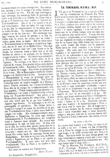 TE PIPIWHARAUROA. No. 168 iho ai mo tona tamaiti mo taua wahine hoki. I wehea ma tona wahine £1, ooo, ooo, ma tona tamaiti £14, 000, 000. Ko te moni ma tona wahine mo te wa anake e noho pouaru ana ia, ki te marena ia ki tetahi atu ka hoatu te toe- nga o taua moni ma tona tama. Ko te wa- hine nei he kotiro tonu. No tera tau ano i marena ai, ko nga tau 18. Ko tona wahine tuatahi i wehea e ia, na reira tona tamaiti. I muri tonu iho i tera ka mea kia marenatia raua ko tenei o ona wahine. He maha nga minita i riri mo tenei mahi a Ahito. TE RIIHI. I TE Hatarei te 9 o nga ra o Mei nei ka mate a Te Riihi, he Pakeha kaumatua no Turanga nei. he roia. he tangata rongonui hoki no Niu Tireni nei i ona ra. I whanau ia ki Ingarani i to tau 1836. he tama na Takuta Hemi Te Riihi. I haere ia ki tetahi kareti nui i Ingarani kura ai. engari i te mea kaore ano i mutu tona kura ka haere mai ki Ahitereiria. a whakatutukitea ana tona kiira ki te kareti nui o Marepana. I muri i tona kura ka mahi ia ki te tari o tetahi roia. engari kaore i roa ka mahue i a ia, haere ana ki te kiira minita, whakaturia ana hei minita mo tetahi hahi e karangatia ana te ingoa he Congregational. E wha nga tau i muri mai ka mahue i a ia te mahi minita ka hoki ano ki te ture . I te tau 1865 ka whakamana ia e te Ture hei roia. I te tau 1863 ka marena ki tana wahine kei te ora ano te wahine me nga tamariki. kotahi te mea tane tokowha nga mea wahine. I te tau 1866 ka whakawhiti mai ki Niu Tireni nei, a whakaturia ana hei roia mo te Hupiriini Kooti i Otepoti. I muri iho ka nuku mai i Otepoti ki Hokitika. i Hokitika ki Akarana, a ki Nepia, tuturu rawa atu te taunga o tona remu ki raro i Turanga. I a ia i Akarana e rua ona tunga hei mema mo te Paremata. I hiahiatia ia e Hori Kerei i taua wa hei minita mo te taha ki nga Ture, engari kaore ia i pai, kiia atu ana e ia kia whakaturia ko tona hoa ko Rapata Taute (.ko te Tiati Tumuaki o te Hupirimi Kooti). E kiia ana nana tetahi whaikorero roa i roto i te whare, e 24 haora ia e korero ana. I tu ano ia hei mema mo Nepia, mo Turanga. I aua ra ko ia tonu tetahi o nga tangata rongonui o Niu Tireni. He tangata rongonui ano a Te Riihi mo te tuhituhi pukapuka. E rima ana pukapuka i tuhituhi ai. Ko te oranga me nga mahi i mahia e Hori Kerei nana i tuhi. Ko tana pukapuka whakamutunga tenei. He tangata ia i ngakau nui ki te whai i nga tikanga e pai ai te whenua katoa. TE KAHITI O NIU TIRENI. E WHAKAATU RIA ana i roto i te Kahiti o tenei marama tetahi panui whakaatu ka tangohia e 4 eka e 5 paati o Kopuataraki Nama 2A, 2B, 2C, wahi o Uawa, hei turanga kura. E haere ana tenei mahi i raro i te mana o te Ture mo nga mahi ma te katoa, 1908. I tua atu o taua 4 eka. 1 eka e 22 paati hei huarahi atu ki te kura. Ko nga pukapuka whakamarama ka waiho i te Poutapeta o Uawa. Ki te whakahe tetahi tangata ki tenei mea me tae atu tona whakahe ki a Hon. W. D. S. Macdonald i roto i nga ra e 40. ara mai i te 160 Mei, i te ra i panuitia ai, ki te 25 o Hune. I raro ano i tenei ture ka tangohia e 21.4 nga paati o Tiritiri Nama 7 (16527 puuru) wahi o Harataunga (Thames) hei rori. Ko nga pukapuka whakaatu ka waiho i te Poutapeta o Netherton. Ko te whakahe me tae atu i roto i nga ra e 40 POARI WHENUA MAORI O AOTEA. E WHAKAATU ana te Poari o Aotea ka utua nga moni katoa o nga whenua e riihitia ana, a e utua ana hoki e te Poari. Ko nga ra me nga kainga hei utunga ko enei e whai ake nei:— Taurangarere... ... Manei 10 Hune. Karioi ... ... ... Turei, 11 Hune. Raetihi ... ... ... Wenerei, 12 Hune. Pipiriki ... ... ... Taitei, 13 Hune. ... ... ... Parairei, 14 Hune. Hiruharama me Hatarei 15 Hune Ranana ...... - Koriniti ... ... ... Manei, 17 Hune. Karatia ... ... ... Turei, 18 . Taihape ... ... Parairei, 21 Hune. Taumarunui ... . 22 Hune. Whanganui... ... Turei, 25 Hune. J. B. JACK, Perehitini. HE PANUI. HE whakaatu tenei kua oti te perehi ki te reo Maori te Ture Whenua Maori, 1909: nga Rekureihana i raro i taua Ture; nga Ruuri o te Kooti Whenua Maori; te Oota Kaunihera whakatakoto i nga rohe o nga Takiwa mo nga Poari Whenua Maori; me te Mapi whakaatu i nga rohe o nga Takiwa Poari Whenua Maori. Kua oti enei mea katoa te whakarapopoto ki roto
