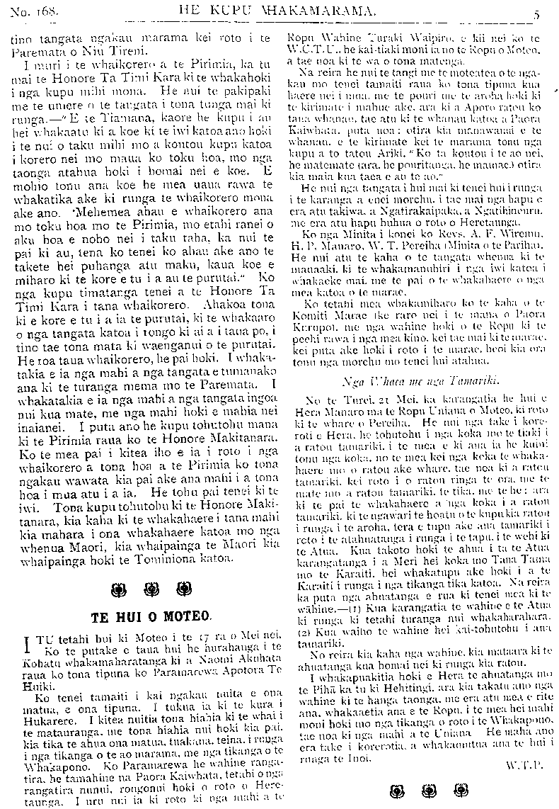 No. 168. HE KUPU WHAKAMARAMA. tino tangata ngakau marama kei roto i te Paremata o Niu Tireni. I muri i te whaikorero a te Pirimia, ka tu mai te. Honore Ta Timi Kara ki te whakahoki i nga kupu mihi mona. He nui te pakipaki me te umere o te tangata i tona tunga mai ki runga.—" E te Tiamana, kaore he kupu i au hei whakaatu ki a koe ki te iwi katoa ano hoki i te nui o taku mihi mo a koutou kupu katoa i korero nei mo maua ku toku hoa, mo nga taonga atahua hoki i homai nei e koe. E mohio tonu ana koe he mea uaua rawa te whakatika ake ki runga te whai korero mona ake ano. Mehemea ahau e whaikorero ana mo toku hoa mo te Pirimia, mo etahi ranei o aku hoa e noho nei i taku taha, ka nui te pai ki au, tena ko tenei ko ahau ake ano te takete hei puhanga atu maku, kaua koe e miharo ki te kore e tu ia au te purutai." Ko nga kupu timatanga tenei a te Honore Ta Timi Kara i tana whaikorero. Ahakoa tona ki e kore e tu i a ia te purutai, ki te whakaaro o nga tangata katoa i rongo ki ai a i taua po, i tino tae tona mata ki waenganui o te purutai. He roa taua whaikorero, he pai hoki. I whaka- takia e ia nga mahi a nga tangata e tumanako ana ki te turanga mema mo te Paremata. I whakatakia e ia nga mahi a nga tangata ingoa nui kua mate, me nga mahi hoki e mahia nei inaianei. I puta ano he kupu tohutohu mana ki te Pirimia raua ko te Honore Makitanara. Ko te mea pai i kitea iho e ia i roto i nga whaikorero a tona hoa a te Pirimia ko tona ngakau wawata kia pai ake ana mahi i a tona hoa i mua atu i a ia. He tohu pai tenei ki te iwi. Tona kupu tohutohu ki te Honore Maki- tanara, kia kaha ki te whakahaere i tana mahi kia mahara i ona whakahaere katoa mo nga whenua Maori, kia whaipainga te Maori kia whaipainga hoki te Toininiona katoa. TE HUI O MOTEO. I TU tetahi hui ki Moteo i te 17 ra o Mui nei, Ko te putake e taua hui he hurahanga i te Kohatu whakamaharatanga ki; a Naomi Akuhata raua ko tona tipuna ko Paramarewa Apotora Te Huiki. Ko tenei tamaiti i kai ngakau nuita e ona matua, e ona tipuna. I tukua ia ki te kura i Hukarere. I kitea nuitia tona hiahia ki te whai i te matauranga, me tona hiahia nui hoki kia pai. kia tika te ahua ona matua, tuakana teina, i runga; i nga tikanga o te ao marama, me nga tikanga o te Whakapono. Ko Paramarewa he wahine ranga- tira, he tamahine na Paora: Kaiwhata, tetahi o nga; rangatira nunui, rongonui hoki o roto o Here- taunga. I uru nui ia ki roto ki nga mahi; a te Ropu Wahine Turaki Waipiro e kii nei ko te W.C.T.U'.. he kai-tiaki moni ia no te Ropu o Moteo. a tae noa ki te wa o tona matenga; . Na reira he nui te tangi mo te moteatea o te nga- kau mo tenei tamaiti raua ko tona tipuna kua haere nei i mua me te pouri me te aroha hoki ki te kirimate i mahue ake. ara ki; a Aporo ratou ko tana; whanau tae; atu ki te whanau katoa; a Paora Kaiwhata, puta noa; otira kia; manawanui e te whanau; e te kirimate kei te marama tonu nga kupu a to tatou Ariki. " Ko ta; koutou i te; ao nei. he matemate ara. he pouritanga he mamae otira kia maia kua taea e au te ao." He nui nga tangata i hui mai ki tenei hui i runga i te karanga a enei morehu i tae; mai nga hapu o era atu takiwa a Ngatirakaipaka a Ngatihineuru me era atu hapu huhua o roto o Heretaunga. Ko nga Minita i konei ko Revs. A. F. Wiremu H. P. Manaro. W. T. Pereihi Minita o te Parihau He nui atu te kaha o te tangata whenua ki te manaaki ki te whakamanuhiri i nga iwi katoa i whakaeke mai. me te pai o te whakahaere; o nga mea katoa o te marae. Ko tetahi mea; whakamiharo ko te kaha o te Komiti Marae ake raro nei i te mana o Paora Kurupo me nga; wahine hoki o te Ropu ki te peehi rawa i nga mea kino. kei tae mai ki te marae kei putu ake hoki i roto i te marae heoi kia ora tonu nga morehu mo tenei hui atahua. Nga Whaea me nga Tamariki No te Turei. 21 Meika karangatia he hui e ka karangatia he hui e Hera Manaroa ma te Ropu Uniana o Moteo ki roto ki te whare o Pereiha He nui nga; take; i kore- roti e Hera he tohutohu i nga koka mo te tiaki i ; a ratou tamariki i te mea e ki ana ia he kuini tonu nga; koka; no te mea; kei nga; koka; te whaka- haere mo o ratou ake whare tae noa ki a ratou tamariki kei roto i o ratou ringa te. ora me te mate mo a ratou tamariki te tika me te he ara ki te pai te whakahaere; a nga koka i a ratou tamariki. ki te ngawari te hoatu o te kupu kia ratou i runga i te aroha tera e tupu; ake aua tamariki i roto i te atahuatanga i runga i te tapu. i te wehi ki te Atua Kua takoto hoki te ahua i ta te; Atua karangatanga; i; a Meri hei koka mo Tana Tama mo te Karaiti;, hei whakatupu; ake hoki i; a te Karaiti i runga i nga tikanga tika katoa. Na reira; ka puta nga ahuatanga e rua ki tenei mea ki te wahine.—(11) Kua karangatia te wahine e te Atua ki runga ki tetahi turanga nui whakaharahara (2) Kua waiho te wahine hei kai tohutohu i ana tamariki. No reira kia kaha nga wahine kia mataara ki te ahuatanga kua homai nei ki runga kia ratou. I whakapuakitia hoki e Hera te ahuatanga mo te Piha ka tu ki Hehitingi ara kia. takatu; ano nga wahine ki te hanga; taonga, me era; atu mea e rite ana. whakaaetia ana e te Kopu. i te mea; hei mahi; moni hoki mo nga tikanga, o roto i te Whakapono, tae noa ki nga; mahi a te Uniana He maha; ano era take; i korerotia a whakamutua ana te hui i runga te Inoi. W.T.P.