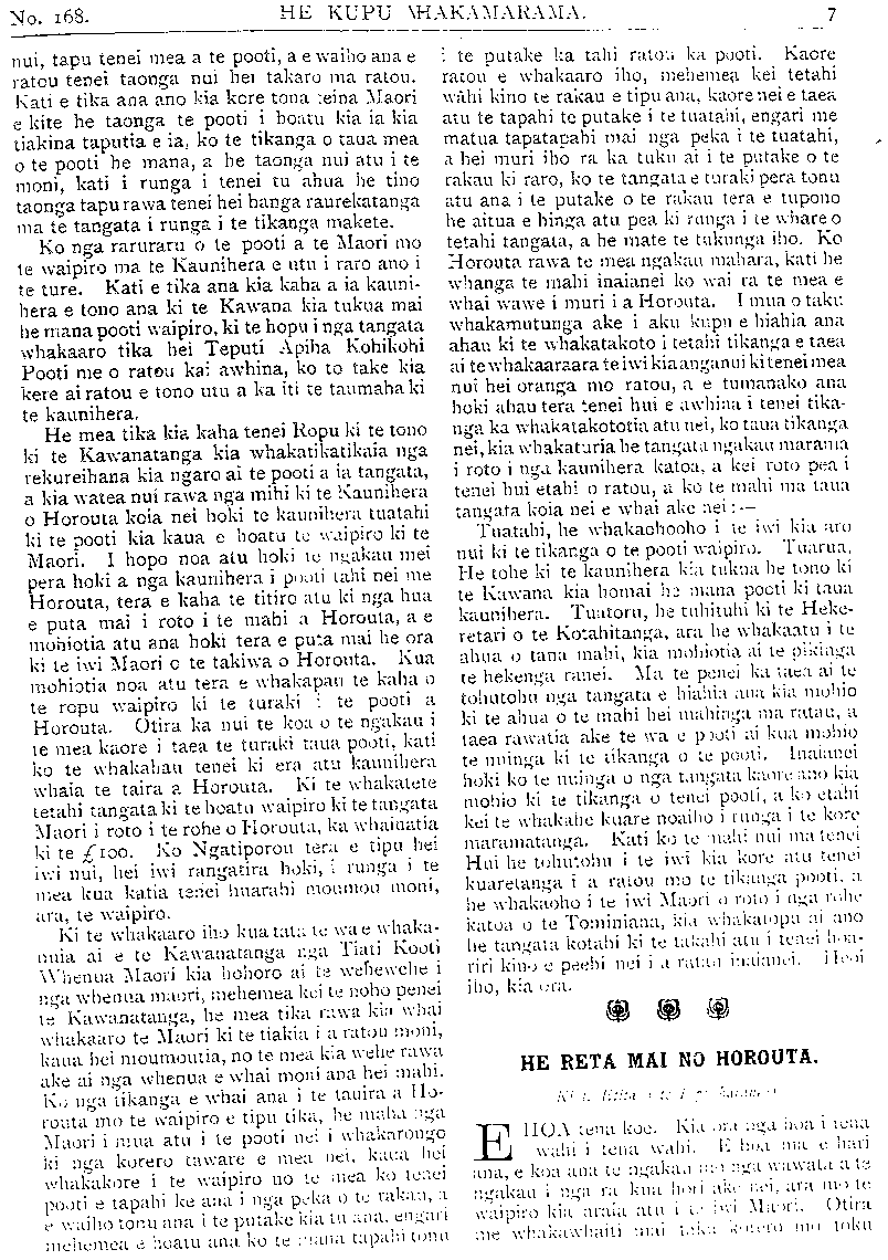 TE PIPIWHARAUROA. No. 168 whakaora. Mehemea he hiahia no tatou kia haere tonu te oha a nga tangata kua ngaro atu nei ki te po, me whakaputa e tena, e tena, o te hunga e tango ana i ta tatou pepa, tona kaha ki te whakarite i enei mea e rua:— (1) Kia kaha tena, tena ki te utu mai i te 5/- mo tana pepa ia tau, ia tau. (2) Kia kaha hoki tena, tena, ki te tohe ki tetahi atu tangata kaore nei ano i tango i te pepa, kia tango. Ma te tokomaha hoki o nga tangata tango ka ora te pepa. E 400 atu ano nga tangata kei te toe katahi ka ora ta tatou pepa. Mehemea tena tangata, tena tangata o te 400 e tango nei inaianei e mea ana me whakamatau ahau ki te tohe i tetahi tangata kotahi kia tango i te pepa, kua eke ki te tokomaha o nga tangata e hiahiatia nei; kua ora hoki ta tatou taonga. He maha nga pepa hou kua ara ake inaianei kati kaore e pai kia mate tenei, te mea pakeke. Kati e te hunga e korero ana i enei kupu kia kaha ki te awhina i ta tatou taonga. TE WHARE I MANUTUKE. KUA mutu te mahi a nga kamura pakeha i te whare karakia o Man u tu ke, ko te taha ki nga Maori e toe ana inaianei. Ko nga taha katoa o te whare he mea pereki, parua atu ai hoki a waho ake e nga pereki ki te kohatu. Ki te titiro atu me te mea he raima katoa a waho. Ko runga he mea uhi ki te pereti. He hanga atahua ki te matakitaki atu. Ko nga whakairo mo roto kei te mahia e nga tohuna. Ko nga paewai kua oti, ko nga pou katahi ano ka timata. Ko te take i roa ai na te roa mai o nga rakau i te mira i Taupo. No te 22 o nga ra o te marama nei katahi ano nga mea tuatahi, tekau nga pou, ka tae mai. Kati kei te mahi nga tohunga inaianei. E wha tekau katoa nga pou hei whakairotanga. Nga whakaatu mai o Amerika kei te nui te marangai ki reira. Ko te awa nui o taua whenua kua toha i ona parenga, kua horapa atu ki te parae. Tetahi waipuke nui tenei. Nga taone katoa e tata ana ki taua awa. kua ngaro katoa i te wai. Ko nga poti mihini o runga i tana awa kei nga tiriti o nga taone e rere ana, e rapu tangata an?.. he man ki nga wahi maroke. Ki nga whaka- atu mai kua; 100, 000 nga mea kua kore he kainga. TE OPE A TUWHAKAIRIORA I MURI I TE HOKINGA O APANUI ME TANA OPE I TE HINGANGA O NGATIPOROU I TE MANIAROA. I MURI i a Apanui ka whakaaro a Tu- whakairiora he ope mana kia iti, kia taea ai te " whanau-ihu-waka," kia rongo ai hoki ki te " tohu." Ka kiia e ia ma te Hokowhitu o Ngatinua ia e kawe ki te mate o tona tama o Te Aowehea, ki te mate hoki o Kuku, o Koro- hau, o Rongotangatake me Ngatiporou katoa e takoto mai ra i te Maniaroa. Ko nga whaka- tauki o te iwi nei, " ko Ngatinua-kaiputahi," " ko te Hokowhitu-rakaumatapiko, " ko Ngai- tane-hikupotakataka," ko nga Paniwhaniwha ngau puraho a Te Aotauru." Ka whakaaetia e te Hokowhitu o Ngatinua. Ka tae ki te wa mo te haere, na te Hokowhitu nei ano te waka, ko Teruru-a-tarapika te ingoa. Te taenga ki Awatere ka u ki te waha o Rerekohu (he Hutukawa). E tu nei ano taua Hutukawa, ko te waha o Rerekohu te ingoa. Ka hui te Hokowhitu nei ki te pa o Tuwhakairiora ki Okauwharetoa. Ka mahia nga Iho taua me te Awa moana. Ko Tuwhakairiora i tenei wa kua kaumatuatia, engari ko te tohu mo te riri kei te mana tonu. Ka tae ki te ra e manu ai i reira a Rongoitekai Kua rongo ia ki te toa o Tutawhiwhirangi, he rangatira no te Wha- nau-a-apanui, e korerotia ana. Ka pa te hoto me te manako ki a ia. Ka tu ia ki runga ka tohu i tona taiaha, " Na Tutawhiwhirangi rawa te pea taiaha ki au hikitia rawatia e au, ko Tutawhiwhirangi." Nona e whakatu ra i tona taiaha ka rere te pakauroharoha i ona waewae, no tona kianga i te kupu ra," ko Tutawhiwhi- rangi," ka pa i te rapa o tona taiaha, takoto ana i tona aroaro. Ka titiro iho ia e whakama- kaka ana, karia tonutia e ia te whakaumu. E mau nei ano te ingoa o taua wahi, " Ko te whakaumu o tangata pakauroharoha a Rongo- itekai." Eke tonu atu ia ki te ihu o te waka, e kiia ana he eke waka. Ko ia anake te tangata i eke ki runga i te waka o Ngatinua, me te tipuna me Tuwhakairiora. Koia pea i tukua ai e Ngatinua,. na Tuwhakairiora i karanga te Hokowhitu nei hei ope mana. Ka hoe ra te Hokowhitu nei, ahiahi rawa atu i waho o Whangaparaoa, konenehu rawa atu i waho o Whaka, katahi ka kaha te hoe. Kua tae ki te wahi i tohutohutia ra e Apanui te ahi a tona tama a Rahuitao e ka ana i uta. Ka mohio a Tuwhakairiora koia ra. Ka u te waka ki uta, ka patua a Rahuitao, ka mate. Ka mahia e Ngatinua, ka whakataatamiratia ki runga i te waka, ka karakiatia. Te ingoa o taua karakia he Koangaamu, ara, he karakia