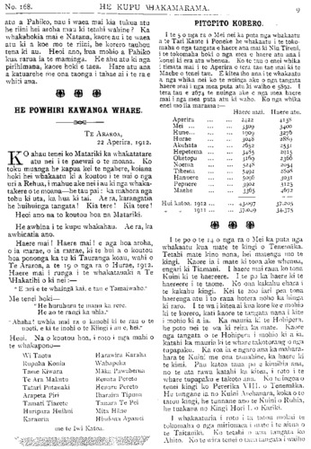 No. 168. HE KUPU WHAKAMARAMA. atu a Pahiko, nau i waea mai kia tukua atu he riini hei aroha mau ki tetahi wahine? Ka whakahokia mai e Natana, kaore au i te waea atu ki a koe mo te nini, he korero tauhou tena ki au. Heoi ano, kua mohio a Pahiko kua rarua ia te maminga. He ahu atu ki nga pirihimana, kaore hoki e taea. Hare atu ana a katuarehe me ona taonga i tahae ai i te ra e whiti ana. HE POWHIRI KAWANGA WHARE. TE ARAROA, 22 Aperira, 1912. KO ahau tenei ko Matariki ka whakatatare atu nei i te paewai o te moana. Ko toku muanga he kapua kei te ngahere, koiana hoki hei whakaatu ki a koutou i te nui o nga uri a Rehua, i mahue ake nei i au ki nga whaka- takere o te moana—he tau pai: ka mahora nga tohu ki uta, ka hua ki tai. Ae ra, karangatia he huihuinga tangata! Kia tere! Kia tere! Heoi ano na to koutou hoa na Matariki. He awhina i te kupu whakahau. Ae ra, ka awhinatia ano. Haere mai! Haere mai! e nga hoa aroha, o ia marae, o ia marae, ki te hui a o koutou hoa pononga ka tu ki Tauranga koau, wahi o Te Araroa, a te 190 nga ra o Hurae, 1912. Haere mai i runga i te whakatauaki a Te Whakatihi o ki nei:— " E nui e te whainga kai, e tau e Tamaiwaho." Me tenei hoki— " He huruhuru te manu ka rere, He ao te rangi ka uhia." " Ahaha! uwhia mai ra o kanohi ki te rau o te nooti, e ki te inohi o te Kiingi i au e, hei." Heoi. Na o koutou hoa, i roto i nga mahi o te whakapono— Wi Taotu Harawira Karaha Rupuha Konia Wahapeka Tame Kiwara Maka Paweherua Te Ara Makutu Renata Pereto Tatari Putauaki Henare Pereto Arapeta Piri Iharaira Tipuna Tamati Tiarete Tanara Te Pei Huripara Huihui Mita Hane Karauria Himiona Apanui me te Iwi Katoa. PITOPITO KORERO. I te 5 o nga ra o Mei nei ka puta nga whakaatu a te Tari Kaute i Poneke he whakaatu i te toko- maha o nga tangata e haere ana mai ki Niu Tireni, i te tokomaha hoki o nga mea e haere atu ana i konei ki era atu whenua. Ko te tau o enei whika i timata mai i te Aperira o tera tau tae mai ki te Maehe o tenei tau. E kitea iho ana i te whakaatu a nga whika nei ko te nuinga ake o nga tangata haere mai i nga mea puta atu ki waiho e 5892. I tera tau e 2674 te nuinga ake o nga mea haere mai i nga mea puta atu ki waho. Ko nga whika enei mo iia marama:— Haere mai. Haere atu. Aperira ... ... 2422 413 Mei ... ... ... 3309 34oo Hune... ... ... 1909 3276 Hurae ... ... 3048 2889 Akuhata ... ... 2652 2531 Hepetema ... ... 3485 2915 Oketopa ... ... 3169 2366 Noema ... ... 5248 2054 Tihema ... ... 5492 2808 Hanuere ... ... 5096 3031 Pepuere ... ... 3902 3125 Maehe ... ... 3365 4672 Hui katoa, 1912 ... ... 43.097 37.205 1911 ... ... 37.049 34, 375 I te po o te 14 o nga ra o Mei ka puta nga whakaatu kua mate te kingi o Tenemaka. Tetahi mate kino nona, hei matenga mo te kingi. Kaore ia i mate ki tona ake whenua, engari ki Tiamani. I haere mai raua ko tona Kuini ki te haereere. I te po ka haere ki te haereere i te taone. Ko ona kakahu ehara i te kakahu kingi. Kei te 200 iari pea tona haerenga atu i to raua hotera noho ka hinga ki raro. I te wa i kitea ai kua kore ke e mohio ki te korero, kati kaore te tangata nana i kite i mohio ki a ia. Ka mauria ki te Hohipera, he poto nei te wa ki reira ka mate. Kaore nga tangata o te Hohipera i mohio ki a ia, katahi ka mauria ki te whare takotoranga o nga tupapaku. Ka roa ia e ngaro ana ka mahara- hara te Kuini me ona tamahine ka haere ki te kimi. Pau katoa taua po e kimihia ana, no te ata rawa katahi ka kitea, i roto i te whare tupapaku e takoto ana. Ko te ingoa u tenei kingi ko Pererika VIII. o Tenemaka. He tungane ia no Kuini Arehanara, koka o to tatou kingi, he tunnane ano te Kuini o Ruhia, he tuakana no Kingi Hori 1. o Kariki. I whakaaturia i roto i ta tatou mokai te tokomaha o nga mirionaea i mate i te aitua o te Taitaniki. Ko tetahi o ana tangata ko Ahito. Ko te wira tenei o taua tangata i waiho