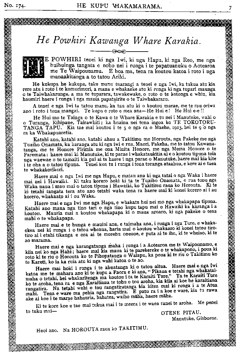 HE KUPU WHAKAMARAMA. He Powhiri Kawanga Whare Karakia. [E POWHIRI tenei ki nga Iwi, ki nga Hapu, ki nga Reo, me nga huihuinga tangata e noho nei i runga i te papatuanuku o Aotearoa me Te Waipounamu. E hoa ma, tena ra koutou katoa i roto i nga manaakitanga a to tatou Ariki. He kukupa he kukupa, taku manu tuarangi a tenei e nga Iwi, ka tukua atu Ida rere atu i roto i te komurimuri, a mana e whakaeke atu ki runga ki nga tupari maunga o te Taiwhakarunga, a ma te tuparara, tawakewake, o roto o te kotonga e whiu, kia haumiri haere i runga i nga mania papatairite o te Taiwhakararo. A tenei e nga Iwi ta tatou manu, ka tau atu ki o koutou marae, me te rau oriwa ano i roto i tona mangai. Te kupu o roto e mea ana—He Hui e! He Hui e-e!! He Hui mo te Tainga o te Kawa o te Whare Karakia e tu nei i Manutuke, wahi o o Turanga, Kihipane, Tairawhiti; ka huaina nei tona ingoa ko TE TOKOTORU- TANGA TAPU. Kia tae mai koutou i te 5 o nga ra o Maehe, 1913 hei te 9 o nga ra ka Whakapuaretia. Katahi ano, katahi ano, katahi ahau a Takitimu me Horouta, nga Pakeke me nga Tuaiho Onamata, ka karanga atu ki nga iwi e rua, Maori, Pakeha, me to tatou Kawana- tanga, me te Honore Pirimia me ona Minita Honore, me nga Mema Honore o te Paremata: haere mai ki Manutuke, ki te parae i whakataukitia ai e o koutou tipuna toia nga waewae o to tamaiti kia pai ai te haere i nga parae o Manutuke, haere mai kia kite i te oha a o tatou tipuna. Tenei kua tu i runga i tona turanga ataahua, e kore ai e taea te whakakorikori. Haere mai e nga Iwi me nga Hapu, e matau ana ki nga tatai o nga Waka i haere mai nei i Hawaiki. Ki taku korero hoki ki ta te Tuaiho Onamata, e rua tonu nga Waka nana i mau mai o tatou tipuna i Hawaiki, ko Takitimu raua ko Horouta. Ki te ki tetahi tangata tera atu ano tetahi waka tena ra haere mai ki konei korero ai i au korero, whakaatu ai i ou Waka. Haere mai e nga Iwi me nga Hapu, e whakatu hui nei mo nga whakapapa tipuna. Katahi ano maua nga tino tari o nga tino kupu tapu mai o Hawaiki ka karanga i a koutou. Mauria mai a koutou whakapapa ki o maua aroaro, ki nga pakeke o tena mahi o te whakapapa. Haere mai e te hunga e mauiui ana, e taimaha ana, i runga i nga Ture, e whaka- ekea nei ki runga i o tatou whenua, haria mai o koutou whakaaro ki konei tatou tiro- tiro ai i etahi tikanga e ora ai te morehu oneone, e puta ai te ihu, ki te wheiao, ki te ao marama. Haere mai e nga karangatanga maha i runga i a Aotearoa me te Waipounamu, e kiia nei ko nga Hahi; haere mai kia maua ki te parekereke o te whakapono, i poua ki roto ki te riu o Horouta ko te Pihopatanga o Waiapu, ka poua ki te riu o Takitimu ko te Kareti, ko ia ka mia atu ki nga wahi katoa o te ao. Haere mai hoki i runga i te ahuatanga ki o tatou aitua. Haere mai e nga Iwi katoa me te mahara ano ki te kupu a Paora e ki ana, " Pikaua e tetahi nga whakatai- maha o tetahi, hei whakaritenga ma koutou i ta te Karaiti Ture." Ta te Karaiti Ture ko te aroha, tena ra e nga Karaitiana te tohu o tou aroha, kia kiia ai koe he karaitiana rangatira. Na tetahi wahi o tou rangatiratanga kia kitea mai ki runga i a te Atua mahi. Tena e ware ma pehia nga rangatira. E patu ra i a koe e ware, kia tu rawa ake ai koe i te marae hahauria, hahatea, waiho maha, haere maha. Ki te kore koe e tae mai tukua mai i te meera i te waea ranei te aroha. Me penei to tuku mai- OTENE PITAU Manutuke, Gisborne. Heoi ano. Na HOROUTA raua ko TAKITIMU.