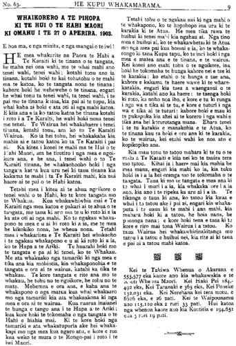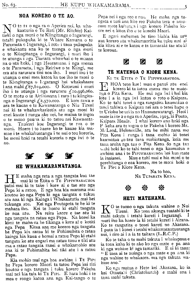 No. 63. HE KUPU WHAKAMARAMA. NGA KORERO O TE AO. NO te 21 o nga ra o Aperira nei, ka wha kaaturia e Te Reti (M. Ritchie) Kai- tiaki o nga moni o te Kingitanga o Ingarangi, tetahi pukapuka ki te Whare Kamana o te Paremata o Ingarangi, i roto i taua pukapuka e. whakaatu ana ko te toenga o nga moni o te Kingitanga o Ingarangi, i muri iho i te utunga i nga Tianara whawhai o te moana na o uta hoki, i nga Heeramana i nga mema o te Parameta, i nga Reriwe o te Kingi, me era atu raruraru tini noa iho. I muri iho i te utunga o enei mea katoa ka toe iho te moni o te Kingitanga o Ingarangi hei whakahaere iana mahi ^"87, 619, 000. O Kotarani i muri iho i te utunga i nga raruraru ai o, 996, 060. O te motu o te Pirihimana i raro i te kingita- nga o Ingarangi ^"2, 570^000. E kore rawa e ara te kauae e te Kawanatanga o Niu Tireni nei ki te whakawharitetia atu nga moni ki enei kaute i runga ake nei, he matua te ingoa o te mano pauna ki to tatou nei Kawanata- nga. Taukuri koe Ingarangi te rua o te moni. Haere i to haere ko te kauae kia ma- mae i te whakahuakanga i te nui o tou kororia, he moni hoki ra tetahi kororia o nga iwi o te ao. HE WHAKAMARAMATANGA. HE maha nga reta a nga tangata kua tae mai ki te Etita o Te PIPIWHARAUROA patai mai ki te take i kore ai e tae atu nga Pepa ki a ratou. E nga hoa kia marama mai koutou ko nga Pepa ki nga tangata e tukua atu ana ki nga Kainga i Whakaatutia mai hei tukunga atu. Kei nga Poutapeta te he ki te mahara iho. Kei te hoatu ki etahi tangata ke noa atu. Na reira kaore e tae atu ki nga tangata na ratau nga Pepa. Na konei ka kimi te mahara he tikanga e kore ai e kotiti nga Pepa Kitea ana me korero nga tangata he Pepa kia ratau ki te Pohimahita o ratau kainga kia kaua e homai a ratau Pepa ki etahi tangata ke atu engari ma ratau tonu e tiki atu ma a ratau tangata ranei e whakamohio atu ana ki te Pohimahita hei tiki atu i a ratau Pepa. Kia mohio mai nga hoa awhina i TE PIPI he Pepa korero Maori ta tatou Pepa kei riri koutou e nga tangata i tuku korero Pakeha mai nei kia taia ki TE PIPI. E hara hoki i te mea e rongo katoa ana nga Kaitango o te Pepa nei i nga reo e rua. He maha nga ta- ngata e turi ana kite reo Pakeha tera e amu- amu mo te kuhunga i nga korero Pakeha ka- ore nei e kitea iho e te konohi Maori. E ngari mehemea he tino hiahia kia uru aua korero ata whakamaorihia ka tuku mai ai kia kitea ai e te katoa e te tamariki tae atu ki te koroua. TE MATENGA O KIORE KENA. Ki TE ETITA O TE PIPIWHARAUROA. EHOA tena koe! mau e panui atu enei korero ki ta tatou manu mo te mate- nga o Pita Kena. He nui nga iwi i hui kia kite i a ia nga iwi katoa o roto o Kaipara. Ko te tahi tenei o nga rangatira kaumatua o tenei takiwa o Kaipara nei ara o tenei hapu o te Uriohu he uri ia no Haumaewarangi. Heoi i mate ia i te 2 o nga ra o Aperira, 1903, ki Pouto, Kaipara Heads. I whai korero ano hoki nga P .keha ara te ingoa o te Pakeha i korero M. McLeod, Helensville, ara he mihi nana mo Pita Kena i runga i tana mohio ki tenei kaumatau 40 tau tana mohiotanga, koia me tana aroha nga tau o Pita Kena 80 nga tau mahi hoki ko te tahi tenei o nga kaumatua e awhina ana i te PIPIWHARAUROA hoi kua mate ia inaianei. Mau e tuhi mai e hia moni o te perehitanga o ena korero, me te moni hoki o TE Pipi a Kiore Kena. Na to hoa, Na TUPARARA KENA. HETI MATEHANA. KO te tuone o nga takuta wahine o Nui Tireni. Ko tona akonga tuatahi ki te mahi takuta i tetahi kareti i Ingarangi. I muri iho ka haere ia ki tetahi kareti i Airana. Ko te rangatira o tenei kareti no Akarana. I puta ia i konei i tetahi whakamatautauranga nui, i riro ai i a ia te taitara (L.R.C.P) Ko te taha o te mahi takuta i whakapaua ia tona kaha ki te ako ko nga mate e pa ana ki nga wahine ki nga tamariki. E ai ki tana: " E taea ai te nuinga o nga mate e pa ana ki nga wahine te whakaora, ma nga takuta wa- hine ano." Ko nga matua o Hete kei Akarana, ko ia kei Otautahi (Christchurch) e mahi ana i tana mahi takuta.