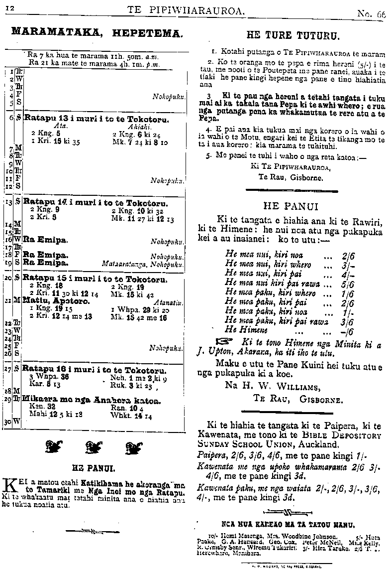 HE KUPU WHAKAMARAMA. TE POOPA. NO te 20 o nga ra o Hurae nei ka mate te Popa, te upoko o te Hahi o Roma, te Hahi Pikopo. E 93 ona tau, 25 nga tau i tu ai ia hei Popa. Kaore pea te nuinga o te Iwi Maori i te mohio ki te ahua o tenei tangata. Ko te Popa te upoko o te Hahi o Roma i te ao katoa, kei runga ia i nga pihopa i nga akepihopa me nga katinara; ki ta te Hahi o Roma ki ko te Popa te riwhi o te Karaiti i tenei ao; ki ta ratou ki ano ko Pita te pihopa tuatahi o Roma, ko nga popa katoa e noho ana ki te torona o Pita. Otira kaore a te Karaipiture whakaatu i tae a Pita ki Roma, i tu ranei ia hei pihopa mo Roma. Kaore ta te Popa kupu e he e ai te ki a nga pikopo. Te pihopa tuatahi o Roma i whai kia nui tona mana ki runga ake i o era atu pihopa katoa, ko Tepene. I noho ia ki Roma ki te pa i noho ai te kingi, i kite ia i nga kawana katoa o nga wahi i raro i te mana o Roma e tuku ana ki raro i te kingi o Roma, na reira a Tipene ka mea he mea tika kia pera te tikanga o te Hahi me te tikanga o te kingitanga, ara me tuku era atu pihopa katoa ki raro i a ia, he penei te pikinga o te mana o te Popa, nana noa i whai kia tu ko ia hei upoko mo te Hahi. I nga wa o mua i whai te Popa kia uhi tona mana ki nga whenua katoa ara kia nui ake ia i nga kingi, kia rua ona mana ko te mana tangata ko te mana wairua. I tu he ope hoia mana, i haere hoki ia ki te whawhai. Ko etahi popa i nui ke atu to ratou hiahia ki te mana tangata i to ratou hiahia ki te mana wairua. I nga wa o mua i tino kaha te popa kia tuku ki raro i a ia te kingi o Ingarangi, otira na te kaha tonu o nga kingi ka puta ratou. Ko te mana o te Popa inaianei he mana whakapono anake, kaore nga kingi i whakaae kia tu ia hei rangatira mo ratou. I mua ko te Popa tonu te kingi o Itari otira na te kaha o te iwi ka whakawhaititia tona mana ki te hahi. I etahi wa e rua nga popa i wha- katuria, katahi ka anga ki te whawhai ki a raua ano mo to raua mana. Ko te ingoa o tenei popa i mate nei ko Reo xiii, he tangata matau he tangata pai, engari i nga wa o mua ko etahi o nga popa he tangata kohuru, he porangi. No Reo xiii tetahi o nga whare ataahua atu i te ao katoa (the Vatican), he ope hoia ano tana hei tiaki i tona whare. Ka nui te kaha o te Hahi Pikopo inaianei ki te inoi kia atawhaitia e te Atua te wairua o te Popa. Kaore rawa te Hahi o Ingarangi e pai ki te Hahi o Roma, e whakahe ana hoki te Hahi o Ingarangi ki te Hahi o Roma. He maha nga whakaakonga tino he a te Hahi Pikopo. Ki te ki a nga tangata kuare i puta mai te Hai i o Ingarangi i roto i te Hahi Pikopo—he tito tenei korero na nga tangata kuare. Ko Aku- tini te tangata tuatahi o te Hahi o Roma i haere ki Ingarangi, tae rawa atu ia kua u noa atu ia te Rongo Pai ki Ingarangi, he hahi ano ia to Ingarangi—ko ia nei te matua mai o to Hahi o Ingarangi—he teka rawa atu te ki ko te Hahi o Roma te matua o te Hahi o Inga- rangi. Kua tu ko Katinara Sato hei Popa, kua huaina ia ko Piu X. NGA MANU REO. KI te komiti o te PIPIWHARAUROA. I kitea ki roto ki te nama 64 wharangi 5 o te Pipi o Hune nei tetahi manu no Amerika, he Naitingikera, he manu tangi pai i te ao. Otira he maha nga manu reo reka o te ao o ia wahi o ia wahi. Ina hoki to Aotearoa nei tona manu reka te reo ki te tangi he Horireri. re. He manu reo reka ki te tangi, he manu mohio, he homai whakaaro mo te tangata kia oho nga whakaaro i te timatanga o te tau; Hei waenganui o nga ra o Hune ka tangi taua manu. Ka mea te tangata kua hoki te ra he Raumati. I waenganui o nga ra o Hurae ka tangi' ano taua manu katahi ka ata rangona nga Kupu o taua tangi. Ahakoa 3 tini nuku atu hoki iho ranei marama katoa nga kupu o tona tangi ki te whakarongo atu. Koia tenei. 0 •hoo-a •ta-ki •ki •ri-i, 0-hoo-a •ta-ki-ki-ri-i, Kai-a-te-ka-we-i-i, Kai-a •te •ka-we •i-i, 0-hoo-ki-ri-ri-ra. Kia whiti te ra kia kore he hau kia Puahuru te rangi ka whakahua mai ia i nga kupu kua tuhia ake nei katahi ka kiia e te tohunga "E, "he tau pai he tau hawere he tau Rangatira he tau tuku roa." Ka tukua nga kakano hue mori ki te wai, i te ata ka horahora ia kia ahua moroke ka kopakitia ki roto ki nga rau kopakopa. Ka here a ki te pou Tokomanawa o te whare ki te wahi mahana i te ahi kia ho- horo ai te tipu ka tatari ki te eanga o te marama a ka kitea kua ea te marama he Tirea, he Oue, he Akoro. I te ata o te Hoa-