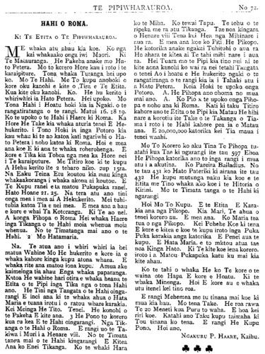 TE PIPIWHARAUROA, HAHI O ROMA. KI TE ETITA o TE PIPIWHARAUROA. ME whaka atu, ahau kia koe. Ko nga kai whakaako onga iwi Maori. Ki Te Matauranga. He Pakeha anake mo Ha- to Petera. Mo to korero Hore kau i roto i te karaipiture, Tona whaka Turanga; hei apo ko. Mo Te Hahi. Me To kupu anohoki e kore oku kanohi e kite o Tira e Te Etita. Kua kite oku kanohi. Ko. He hu kerite i whiriwhiri ia Hato Petera. Hei upoko. Mo Tona Hahi i Hoatu hoki kia ia Ngaki, o te rangatiratanga o te rangi. Matui 16. 18 19. Ko te upoko o te Hahi i Haere ki Roma. Ka Hore He Take kia whaka aturia tenei E He- hukerito. i Tono Hoki ia i nga Potoro kia kau whau ki te ao katoa kati ngariwhi o Ha- to Petera i noho katoa ki Roma. Hoi e mea ana koe E ki ana te whaka roherohenga. E kore e Tika kia Tohea nga mea ka Hore nei i Te karaipiture. Me Titiro koe ki te kupu A Hehu kerito i te 2 teharo niko. 2up 15ra. Na Eaku Teina Etu koutou kia mau kinga whakaakoranga i whaka akona ai koutou. E Te Kupu ranei e ta matou Pukapuka ranei. Hato Hoane 21. 25. Na tera atu ano tini onga mea i mea ai A Hekukerito. Mei tuhi- tuhia katoa Tia e nei mea. E mea ana a hau e kore e whai Ta Kotoranga. Ki Te ao nei. A konga Pihopa o Roma Hei whaka Haere i nga Tikanga o te Hahi moia whenua moia whenua. No te Timatanga mai ano o te Hahi. '2 Mo Hatamaria. Na. Te atua ano i whiri whiri ia hei matua Wahine Mo He hukerito e kore ia e whaka kahore kinga kupu akona whaea. E whaka rite ana matou tona kupu. Amua ake kaimeinga tia ahau Enga whaka paparanga. Katoa He wahine hari otira e whaka heana te Etita o te Pipi inga Tika nga o tona Hahi ano. He Tini nga Tangata o te Hahi oinga- rangi E inoi ana ki te whaka ahua o Hata Mana e tuana irotu i o ratou whare karakia. Kei Meinga He Tito. Tenei. He konohi o te Pakeha E kite ana. 3 He Pono to korero kua ru kea E te Hahi oingarangi. Nga Tik- anga o te Hahi o Roma. E rangi no te Ta- kiwa i Muri i a Henare viii. No te Timata tanga mai o te Hahi kingarangi E Kitea Ana ko Enei Tikanga. Ko te whaki Hara ko te Miha. Ko tewai Tapu. Te tohu o te ripeka me ra atu Tikanga. Tae noa kingara o Henare viii Tena kei Hea nga Mihinare i aua ra. E mea ana koe ko Piti He Pikopo. He katorika anake ngakai Tuhituhi o aua ra He ahara te kitea ai Te tahi mihi nare i aua ra. Hei Tuara mo te Pipi kia tino nui ai te kite rena kanohi ko wai ra nei tetahi Tangata o tenei Ao i hoatu e He hukerito ngaki o te rangatiranga o te rangi kia ia i Tahaki atu i a Hato Petera. Koia Hoki te upoko onga Potoro. A. He Pihopa ano ohoma no mua mai ano. A. Ko Pio x te upoko onga Piho- pa e noho ana ki Roma. Kati ki taku Titiro kahore ano te Etita o te Pipi kia Matau He hihi nare a korotiu i te Take o te Takanga o Tia- roa i roto i te Hahi kahore pea ia e Matau ana. E 20, 000, 000 katorika kei Tia maua i tenei waahi. Mo To Korero ko aku Tina Te Pihopa tu- atahi kua Tae ki ngarangi i te tau 597 Ehoa He Pihopa katorika ano to i nga rangi i mua atu i a akutina. Ko Pareina Ballidius. No te tau 431 ko Hato Pateriki ki airana i te tau 432 He kupu mutunga naku kia koe e te Etita me Tino whaka ako koe i te Hitoria o Kimi. Mo te Timata tanga o te Hahi ki ngarangi Hoi Mo To Kupu. E te Etita E Kara- kia ana nga Pikopo. Kia Mari, Te ahua o tenei korero au. E mea ana. Ko Mana tea tua o nga Pikopo. Kei Pohehe Koe ki tena E kore e kitea e koe te kupu i roto i nga Puka Puka karakia anga katorika E Penei aua te kupu. E Hata Mana. e to matou atua tae noa Kinga Hato. Ki Te kite koe kena korero. i roto i a Matou- Pukapuka katu ku mai kia kite ahau. Ko te tahi o whaka He ko Te kore o te waina o te Hapa E kore e Hoatu. Ki te whaka Minenga. Hoi E kore au e whaka utu i tenei kei tino roa. E rangi Mehemea me tu tinana mai koe ki mua kia hau. Mo tena Take. He roa rawa Te 20 Meneti kua Puru to waha. E hoa kei riri koe. Katahi ano Taku kupu taimaha ki Tou tinana ko tena. E rangi He Kupu Pono. Hoi ano, NGAKURU P. HAARE, Kaihu.