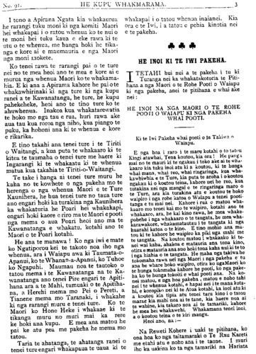 TE PIPIWHARAUROA KUA HOHATIA TE MOMONA. Ki TE ETITA O TE PIPIWHARAUROA. KIA ORA i runga i te mana nui o te whakapono, i runga hoki i te Rangi- marie o nga mahi a te Hahi Matua ara, a te Hahi o Ingarangi, kei raro nei tatou i tona Pono, me ana mahi tohu ara, te Tika te Pono me te Aroha noa. Heoi, Kia ora ! Na e te Etita he whakamarama atu taku ki a koe i te ingoa iriiri o te whare tu ki te patuwatawata, ko tona ingoa ko "te Huarahi pono," ko taua whare he whare karakia no te momona, kei te takiwa o Te Arai nei e tu ana, no te takiwa e whai Momona ana konei, kati ko te tekau ma rua pea tenei o nga tau i mutu atu ai te karakia ki roto i taua whare. Ko te mutunga tonu atu tera o te Momona ki konei, ka riro taua whare hei kitini mahi- nga kai, muri iho ka noho hei pakoro parare- ka, paukena hoki, muri iho ka noho hei whare hanga poti, muri iho ka noho hei whare paki, kaata, parau hoki muri mai ka riro i te rangai poaka. Ko te himene a tena iwi a te poaka rari ai, kaore he kupu, ko te kauwhau ngongoro ai nga ihu i roto i to ra- tau na whare, ka mahue ra hoki i te hahi tapu o Paora Hopere raua ko "Pa tuwatawata," i muri mai ka riro i te hoiho, e rua nga hoiho purei i roto e tereina ana. E hika he aha ia nei kia ahatia nga mahi a te Momona whaka- hua rawa i te ingoa tapu ki runga ki te whare, kai te Momona ia ka karangatia te poaka raua ko te hoiho hei hunga tapu, koia nei anake hoki nga Momona kai roto i taua whare, e manaaki ana i a te HUARAHI PONO. Kai te mohio katoa nga Momona e tae ana ki roto i tenei whare karakia ai ki tenei ingoa he mea ata tuhituhi ki te whatitoka, no te wa ka riro nei i te poaka raua ko te hoiho ko tenei ingoa ko te "TE WHARE-Tu-KI•TE-pA- TUWATAWATA." E tino mohio ana ahau ki nga rangatira o tenei whare, kua puta katoa kai waho o te Momona. Ko "Tuwatawata" tangata he timuaki no taua hahi, o tona putanga ki waho ka uru ki te hahi o te kaupare i reira ia e kauwhau ana i te oranga, e rima pea nga tau ki tena hahi ka mahue, kai te noho noa iho ia kaore ona hahi, ko te ono pea tenei o nga tau e noho ana kaore ona hahi, ra e hoa he nui te whaka- ma o toku tinana mo te panui a "tuwatawata," kei te nui tonu te Momona ki konei a e mea ana te ahua o taua panui kei te Momona tonu ia, na e hoa maku e whakamarama atu nga hahi o "tuwatawata," tuatahi, he mihinare, tuarua he momona, tuatoru he kaupare, tua- wha he noho noa iho, a kati kei enei ra pea e heke iho nei ka tae mai ko te hahi tupou, ka parea pea ko nga waewae ki runga, e te Etita mehemea ko te korero anake mo te tinana o te Atua, i panuitia e tuwatawata e kore au e tuhituhi i tenei reta, no runga i tenei ki a "Tu." Kai te nui tonu te momona ki konei a he teka tau kupu kua hoha te tangata. Koi a i tuhi atu ai i tino pouri au mo tenei mea, i tuhia hai patu i a koutou nupepa, kei te titiro iho hoki nga iwi o nga motu e rua nei, na kei te korero parau Te Pipiwharauroa, na e hoa ma e kore rawa e tau kia karangatia a "Tu." he Momona, ki te kohuatia hoki te taewa e kore e ahei te whakahua he mata engari he maoa, waihoki me Tu, ka karangatia he tautangata noa iho. Kati iho e te Etita nga whakamarama i te mea ka tu te ringa ki te tautoko i a koutou. Na te whenua e tu nei a "te•whare-tu-ki-te- pa•tuwatawata." Na Papatuanuku e takoto nei auau-aue ha. Manutuke Okotepa 3, 1905. PITOPITO KORERO. I mate tetahi tamaiti maori ki Uawa; ki ta te takuta ki ko te take o te mate he kaha no te whangainga i taua tamaiti ki te miki tini No te 15 o tenei marama ka marenatia etahi kaumatua, e 80 nga tau o te tane, e 66 o te wahine, a e 25 pea nga tau i moe noa iho ai raua kaore i marenatia, He tauira tika tenei ki nga tangata he taitamariki nei engari kaho- re ano kia marenatia.