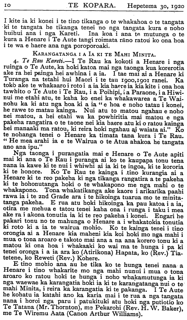 Rev. F. W. Chatterton te kaumatua tae noa ki te tau 1918. Timata mai 1919 ki tenei tau 1920, ko te Rev. A. Nield te kaumatua o te Kura. (Tana te roanga atu). Nga Kura mo te Iwi Maori. E WHAKAATU ana te ripoata a te Kawanatanga ko nga kura Maori i te tau ka huri nei, huihui katoa 119. E rua ano o enei kura kei Te Waipounamu. Ko te 117 kei Ao-tea-roa nei. Apiti ki enei kura e rima nga kura a nga Hahi. Ko nga tamariki Maori kei nga kura Pakeha hui katoa 5000. Tekau nga kura mo nga tamariki kua paahi i nga kura ririki. Hui katoa te kaute o nga tamariki kei nga Kura Maori a te Kawanatanga e 4,737. Hui katoa nga tamariki o te iwi Maori kei nga Kura Maori kei nga Kura Kawanatanga e 9,737. Ko nga tamariki i etahi wahi o te Porowini o Akarana kei te whakahengia he kore kaore e mau ana te haere ki te Kura. Me pehea a tatou tamariki e whiwhi ai ki nga matauranga ki te kore tatou nga matua e tukutuku ki te Kura. Kia manawanui tatou nga matua ki te whiu i a tatou tamariki ki te kore e rongo ki te haere ki te Kura. E ki ana Nga Whakatauki " Te tangata e kaiponu ana i tana whiu, e kino ana ia ki tana tamaiti; te tangata e aroha ana ki a ia, ka papaki wawe i a ia." Me titiro tatou ki mua. Ka ahei ranei te piki o te iwi Maori ina waiho ko ona toto rangatira anake hei whakapiki i a ia ? Ka taea ranei te piki o te Maori ki nga taumata ikeike ki te kore e whakapaua te kaha ki te kimi i te hohonutanga atu o te matauranga ? Kaore ahau i te tono kia tu katoa a tatou tamariki hei roia hei takuta hei minita hei kaiwhakaako kura ranei, engari ahakoa mahi ahuwhenua tera ano te hohonutanga atu o era matauranga. Tamariki ma, kia manawanui koutou. Kaua hei whakarerea o kontou kura kia tutuki ra no te huarahi e whaia nei e koutou. Ma to koutou kaha i enei ra o to koutou tamarikitanga e tau ai te honore ki o koutou iwi a nga tau e takoto mai nei. He Marena. No te 14 o nga ra o Hepetema ka marenatia a Rev. M. P. Kapa ki tana wahine hou, ki a Mate Henare Popata. Tino nui nga tangata i tae kia-kite i tenei marena.