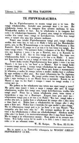 WAI  TE  KOHA'  i puta na i Te Toa Takitini Oketopa 1st, 1930.