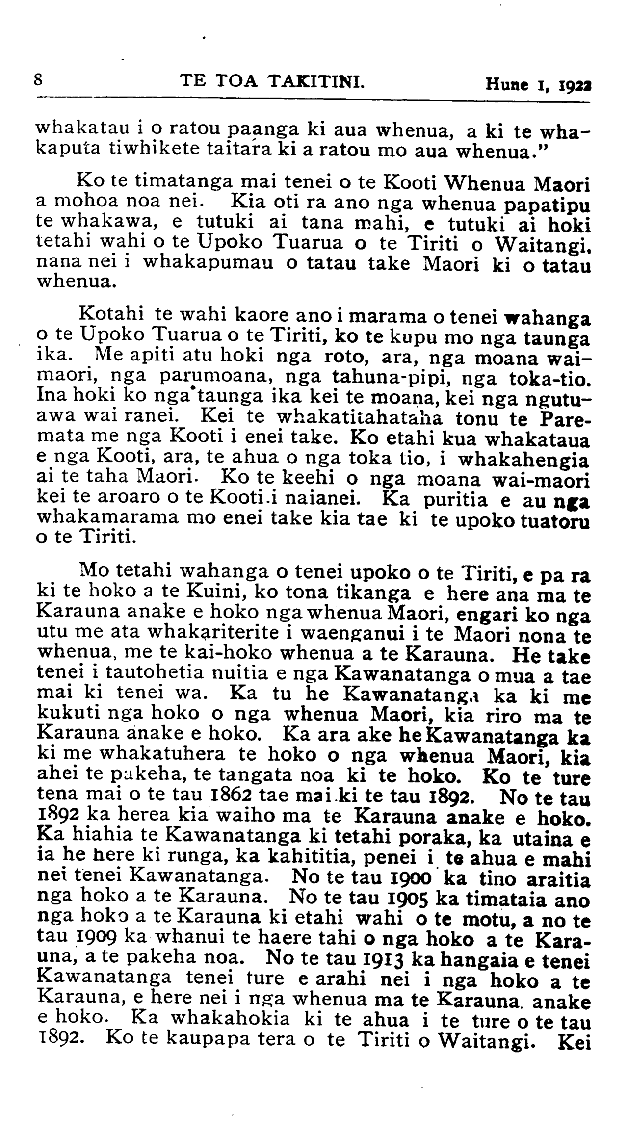 Hune, 1, 1922TE TOA TAKITINI 7 E rua nga tikanga nunui kei roto i tenei o nga upoko o te Tiriti, ara :— (1) Ko te whakapumautanga i nga take o te Maori ki ona whenua, ki ana rawa ; (2) Ko te tukunga ki te Kuini i te mana hoko i nga whenua Maori. Me whakataki ko nga take whenua Maori i te tuatahi. Kei te matatau katoa koutou ki o tatau take whenua. Ehara i naianei te tautohe a te Maori ki te Maori, " Noku ranei, nou ranei," a ka tikina ki te po tataku mai ai nga take tipuna. Ko te koiero tenei a Ta Wiremu Matene, Tumuaki o te Hupirimi Kooti i mua ra, mo te ahua o nga take whenua Maori: "Ko taku i kite ai i pa nga take Maori ki te mata katoa o te whenua; kaore he wahi i watea i nga kereeme a nga Maori, ko nga wahi anake kua hokona e ratau. Kaore rawa au i kite i rongo ranei i tetahi wahi whenua i kore i pangia e nga kereeme a nga Maori. He maha a ratau tautohetohe i waenganui i a ratau mo o ratau tika, engari kaore rawa he tangata i pohehe he take Maori te take o te whenua e tautohetia ra." Na, ka pumau nei nga take Maori i raro i tenei o nga upoko o te Tiriti, ka takoto mai ki nga Maori te patai a te ture, " Tena, no wai o koutou tenei whenua ?" He turituri te whakautu, karanga noa ana, karanga noa ana. Heke iho te toto, ko Waitara tera, ko te rara i rere ki Waikato, a ka toro te ahi ki nga topito o Aotearoa. Ka whakatika nga Rangatira ka hokohokona nga whenua, ahakoa no ratau, no etahi atu ranei-he hoko papatipu tenei, kaore ano he Kooti i tu hei uiui, a hei whakatau no wai nga whenua e hokona ra. Ko Heretaunga tenei, ko Wairarapa tenei, ko Otaki tenei, ko te tini noa atu o te whenua i hokohokona i mua atu o te tuunga o te Kooti Whenua Maori ki nga motu nei. Na runga i nga raru- raru maha i ara ake katahi ka whakaarohia kia whaka- turia he Ropu Whaimana hei uiui, a hei whakatau i nga take o nga Maori ki o ratau whenua. Ka hangaia e te Paremata ko Te Ture Whenua Maori i te tau 1862. Ina te kupu o taua Ture (tekiona 5), "ka whaimana te Kawana i ia wa, i ia wa, ki te whakatu Kooti hei uiui a hei whakatau ko wai nga tangata Maori e tika ana i runga i o ratau take Maori ki nga whenua Maori, a ki te