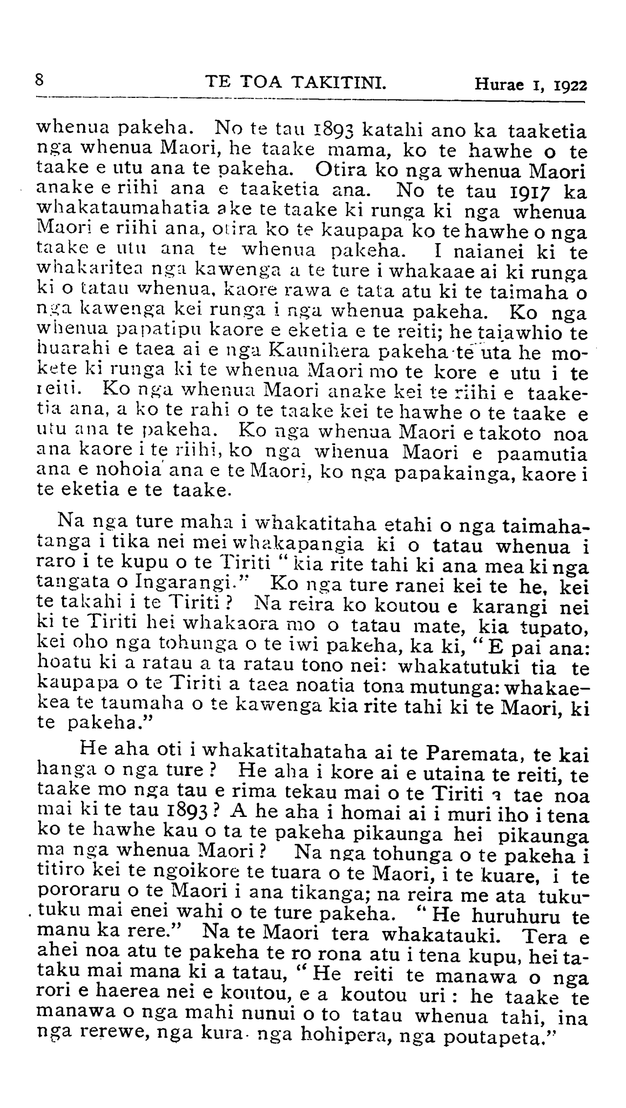 Hurae 1, 1922TE TOA TAKITINI 7 nga ture mo to hoa pakeha, e rima ano pea i rereke. Te ture mo nga hara, te ture mo nga nama, te ture mo nga taonga (haunga ia nga whenua) te ture mo nga korero whakapae, he rite tonu, kotahi tonu te ture mo te pakeha mo te Maori, na te Tiriti hoki o Waitangi i whakarite kia pera. Ko nga ture i rereke ai te Maori i te pakeha, ko nga ture:— 1.Mo nga Mema Maori. 2.Mo nga whenua Maori. 3.Mo te waipiro. He Mema motuhake o te iwi Maori, na ratau anake i pooti. Ko te rake i wehea ai, he motuhake no nga take Maori, a he kuare no te iwi Maori ki te nuinga o nga ti- kanga a te pakeha i tera wa. Ki taku nei whakaaro ia ko te putake o nga Mema Maori tokowha, he wehi no te pakeha, i te wa e tauriterite ana te tokomaha o te Maori o te pakeha ki enei motu, kei whakawhiwhia nga Maori ki te pooti ratau tahi ko nga pakeha ka tokomaha rawa pea nga Maori e tu hei mema. Otira ko te tu o nga Mema Maori i roto i te Paremata tetahi o nga morehu tohu o te motuhaketanga o te iwi Maori. Ko nga ture mo nga whenua Maori i rereke rawa i nga ture mo nga whenua pakeha. Ko nga take Maori hei whakatau ko wai ma i tika ki nga whenua, ko wai ma nga kai-riiwhi mo nga tupapaku. Kaore he wira o mua, he ohaki rawa te tikanga i tata. He maha nga here i hangaia mo te hoko, mo te riihi, mo te mokete, kaore nei i pa ki te whenua pakeha. Kua whakamaramatia ake ra te rereke o nga tikanga mo nga hoko a te Karauna. I mua kaore te reiti e pa ana ki nga whenua Maori. Ehara i te mea na te Tiriti o Waitangi i ki kia kaua e pa. I mua kaore te taake e pa ana ki nga whenua Maori, a, ehara i te mea na te Tiriti i ki kia kaua e pa. Ko ta te Tiriti ia i whakatakoto iho ai " kia rite tahi ki ana mea ki nga tangata o Ingarangi." Mehemea i whai te ture i raro i te reo o te Tiriti, kua pa noa atu era taimaha ki runga ki nga whenua Maori. No te tau 1894 ka pa te reiti ki nga whenua Maori, he hawhe reiti, a ina tonu no te tau 1910 katahi ano ka rite te reiti ki te reiti o nga